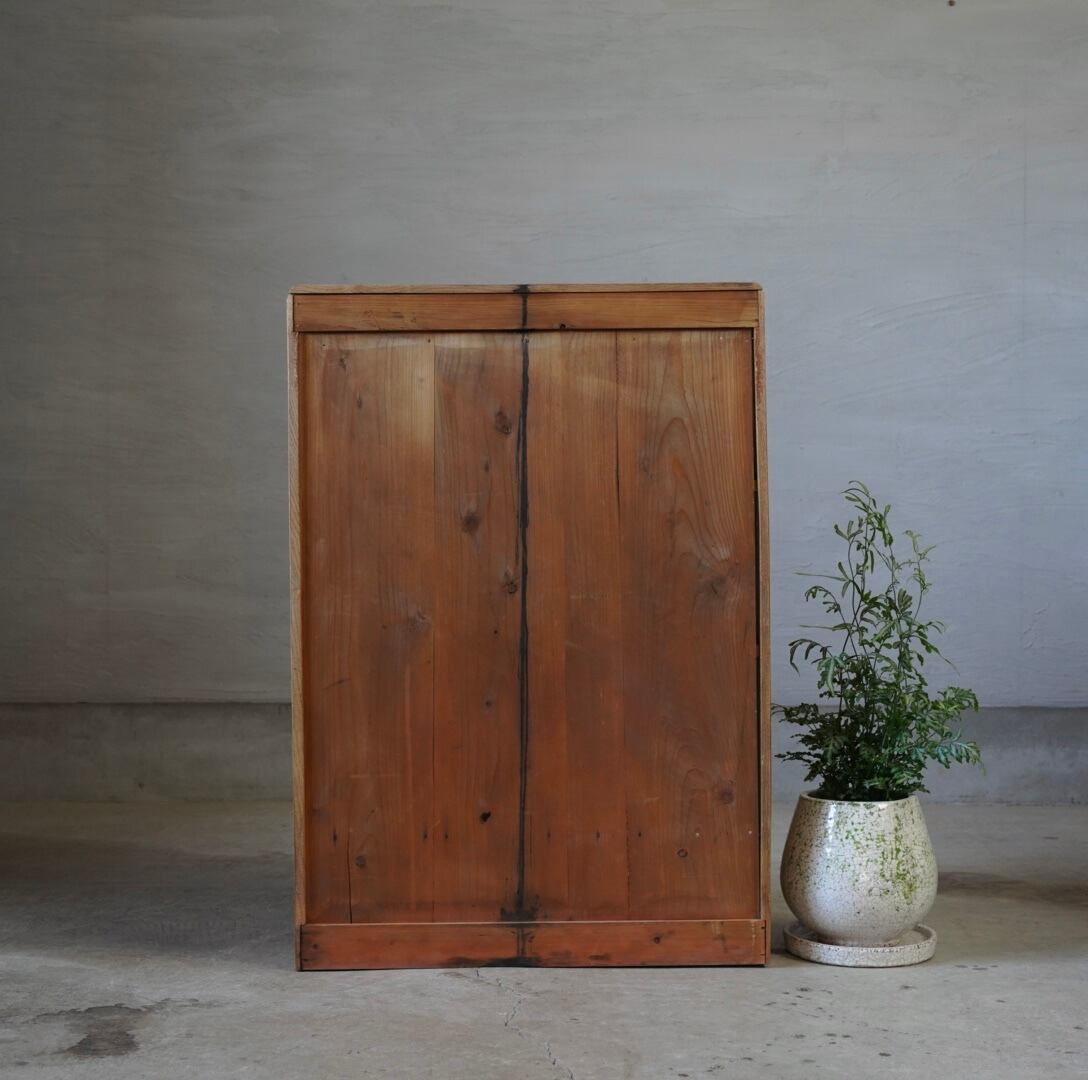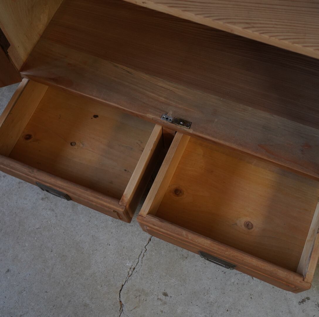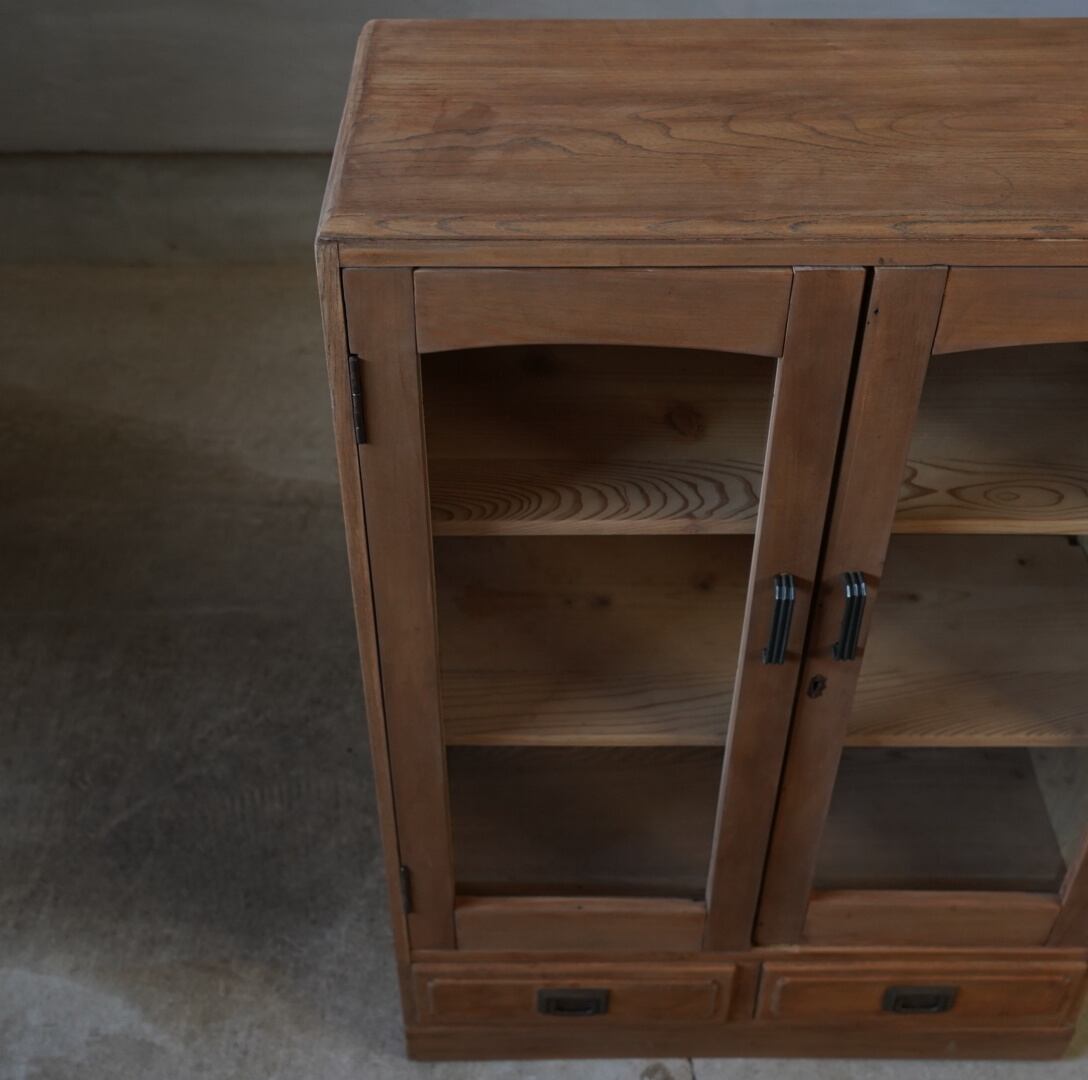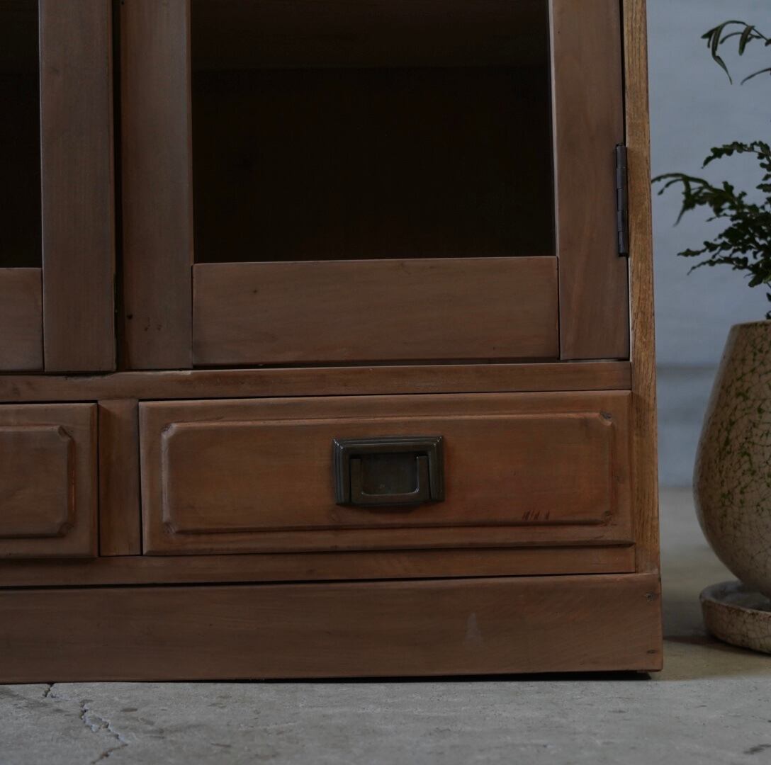 無垢材の温かみのある経年変化と真鍮取手の引き出しが美しいキャビネット。