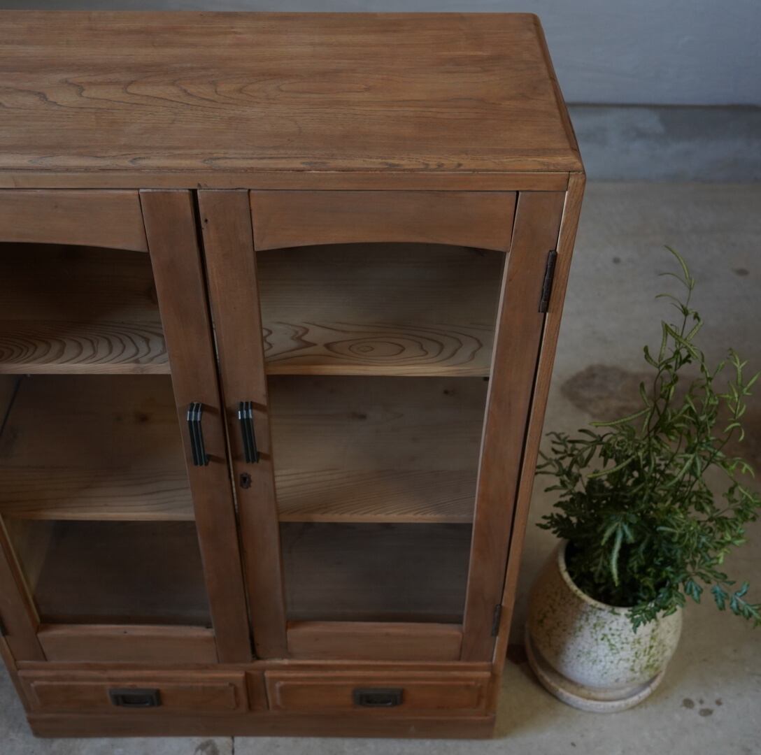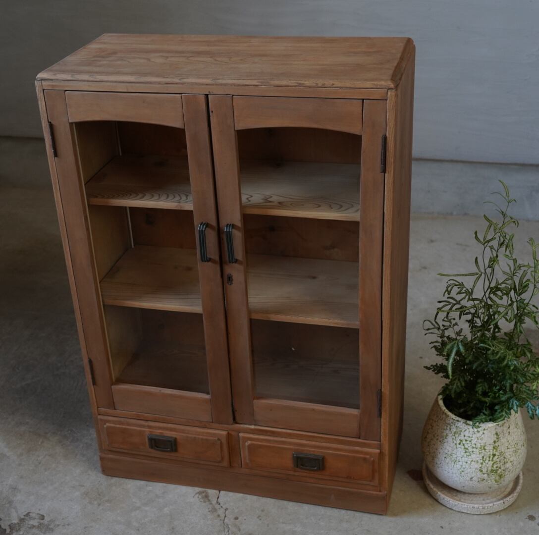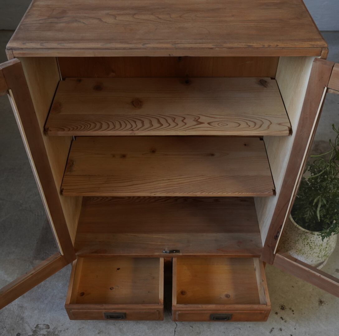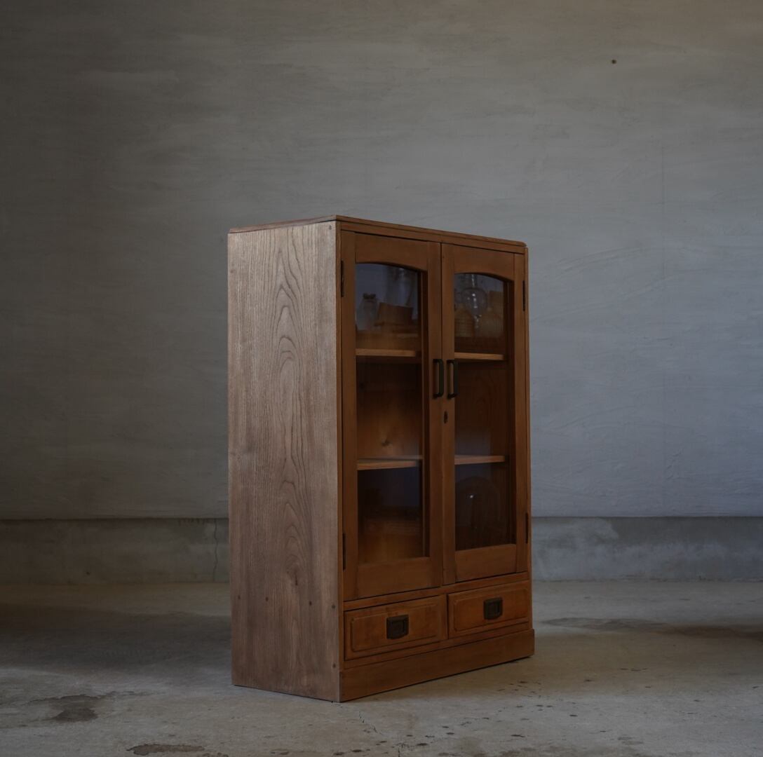 無垢材の温かみのある経年変化と真鍮取手の引き出しが美しいキャビネット。