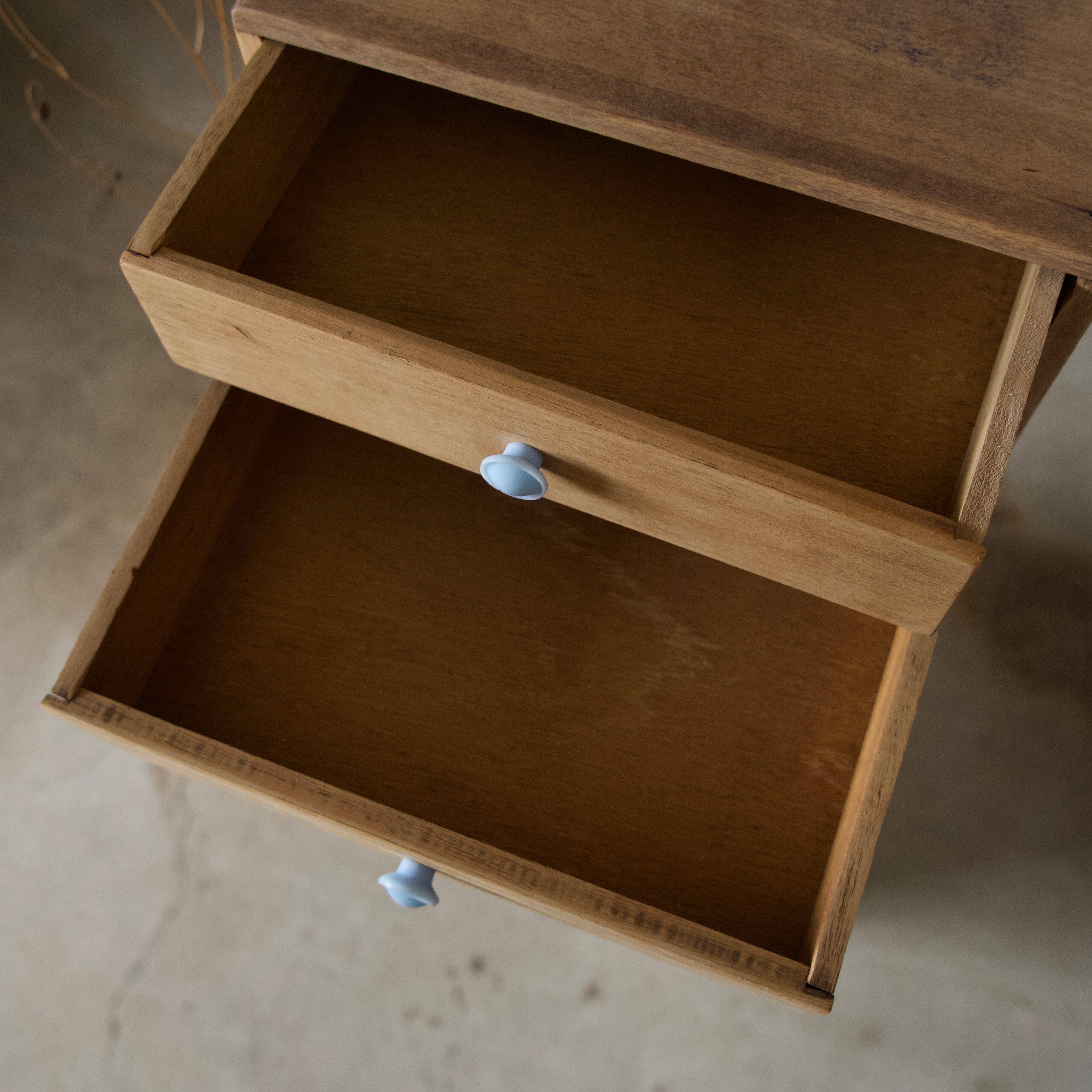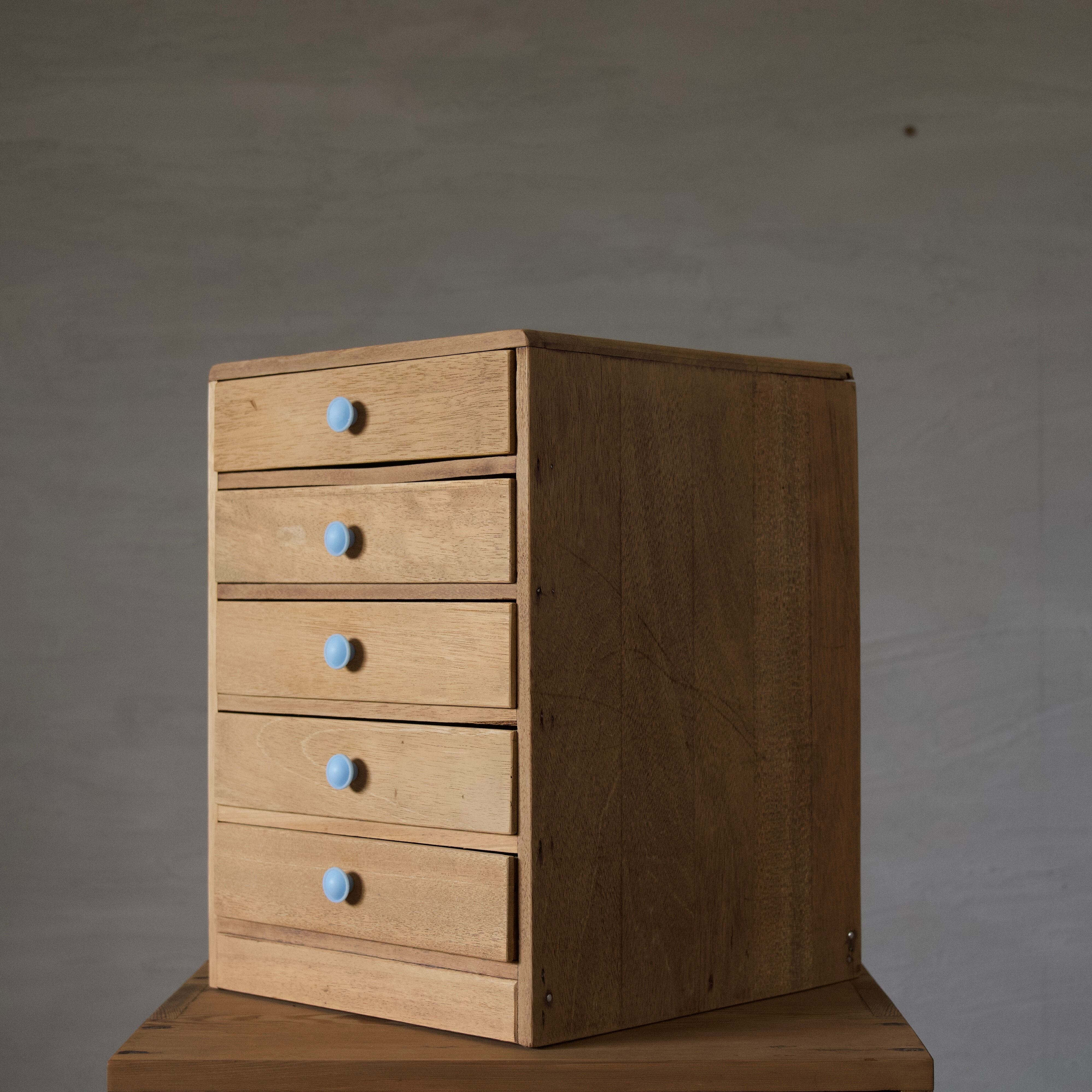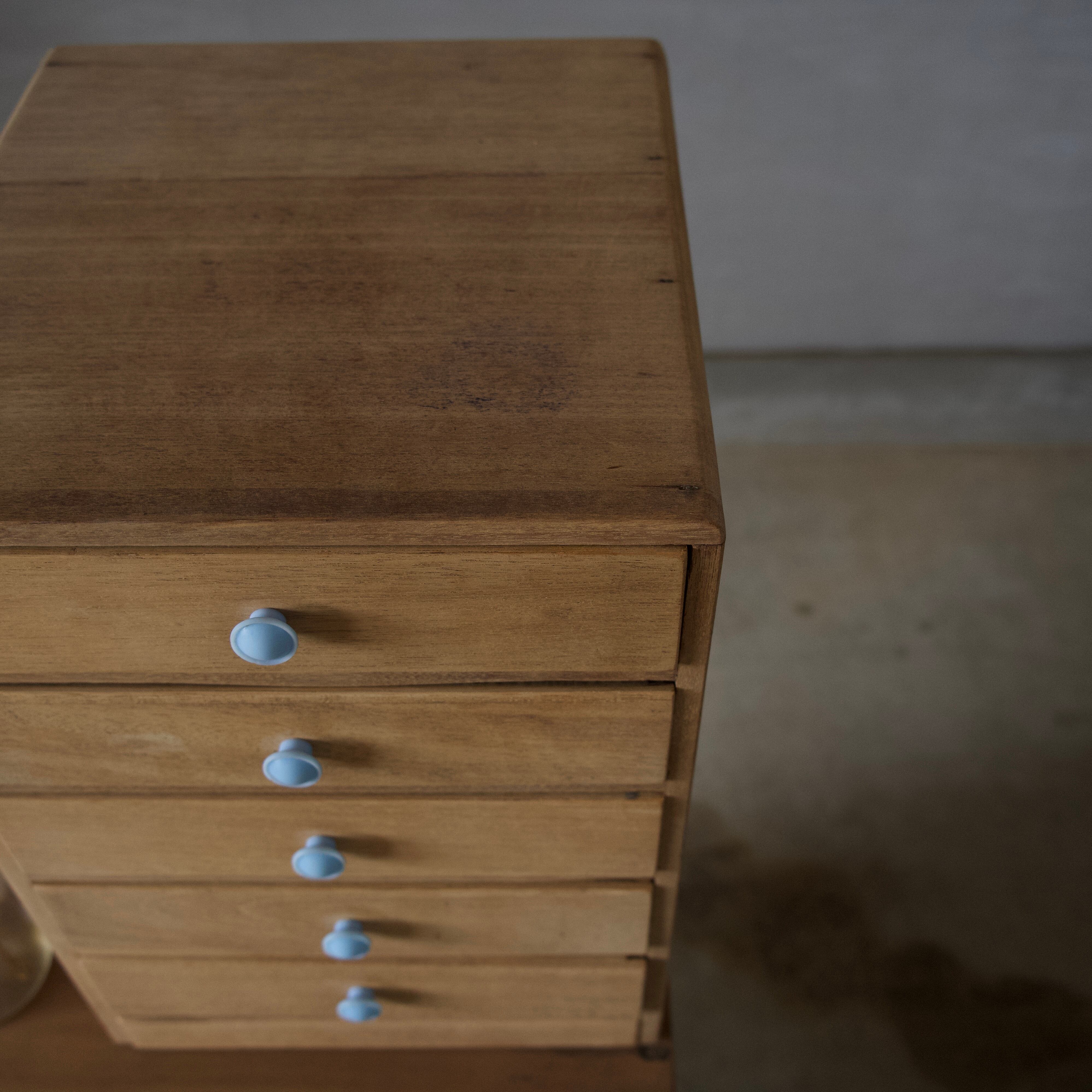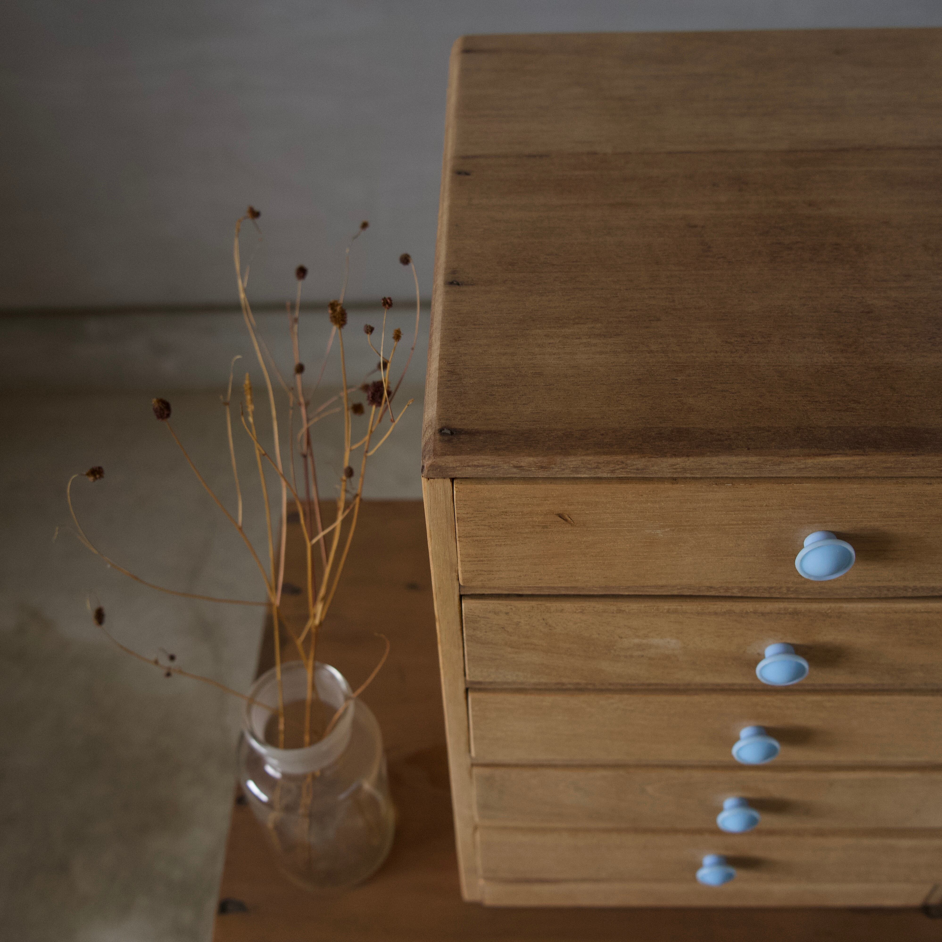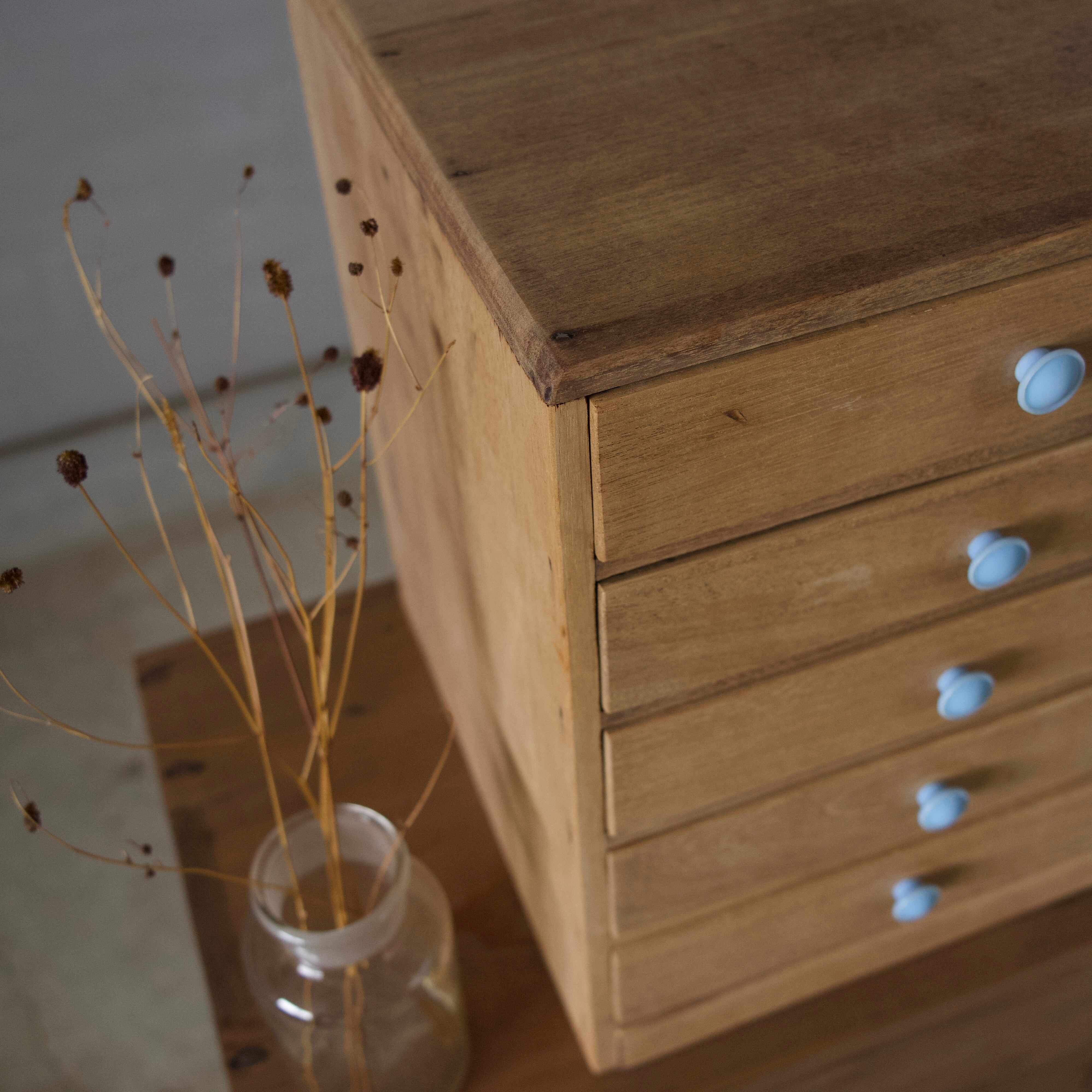 無垢材のナチュラルな木味とちいさな水色のつまみが可愛らしい5杯の引き出し。