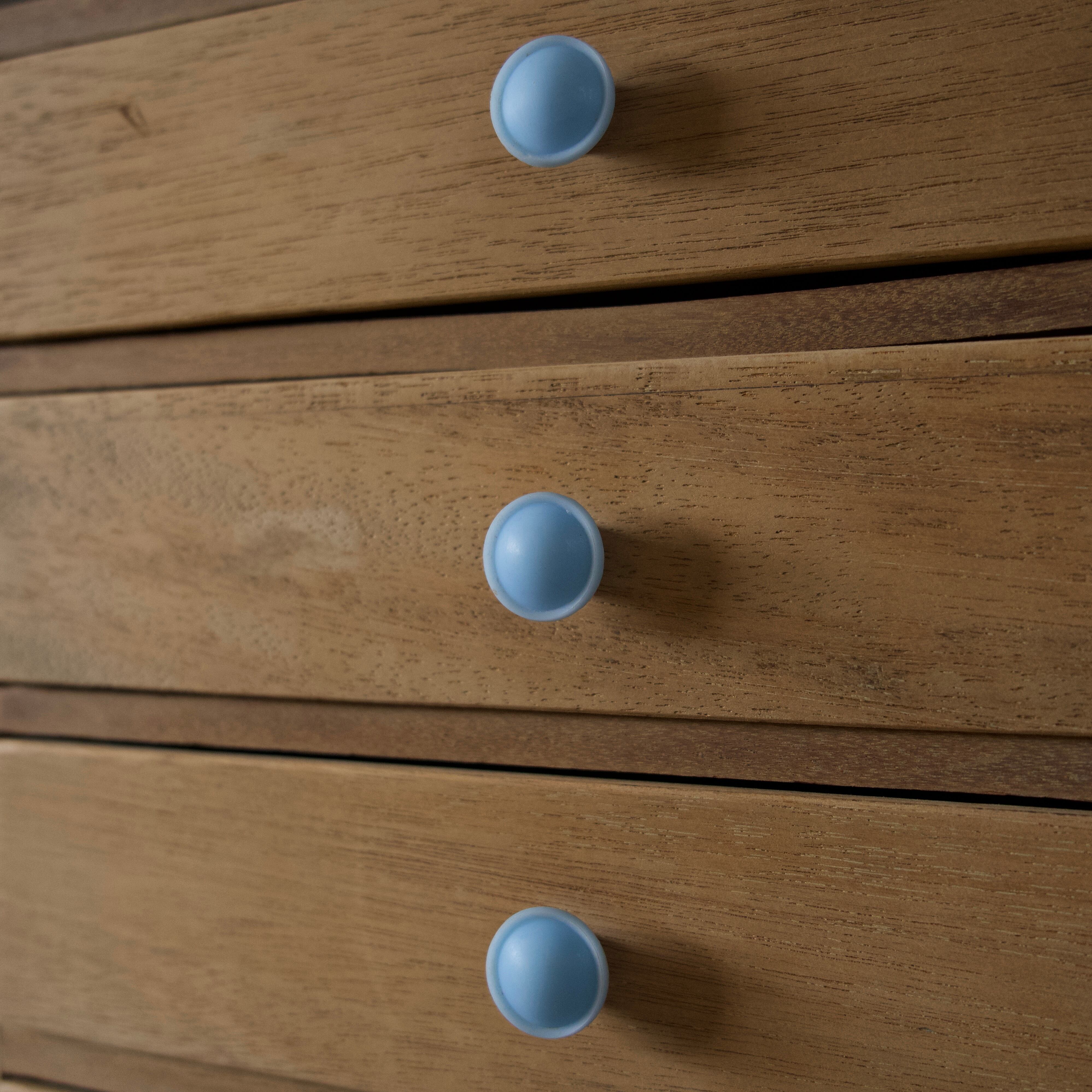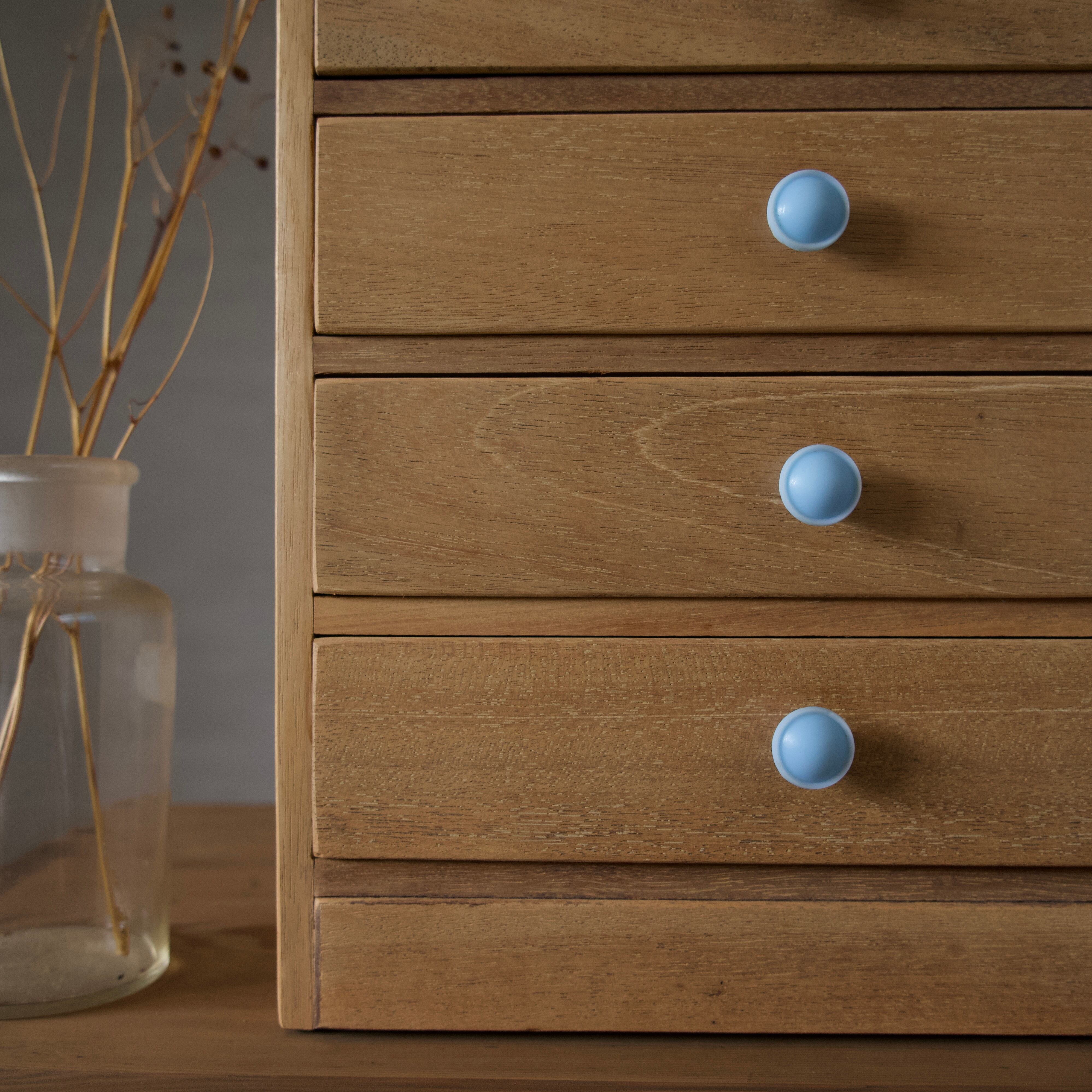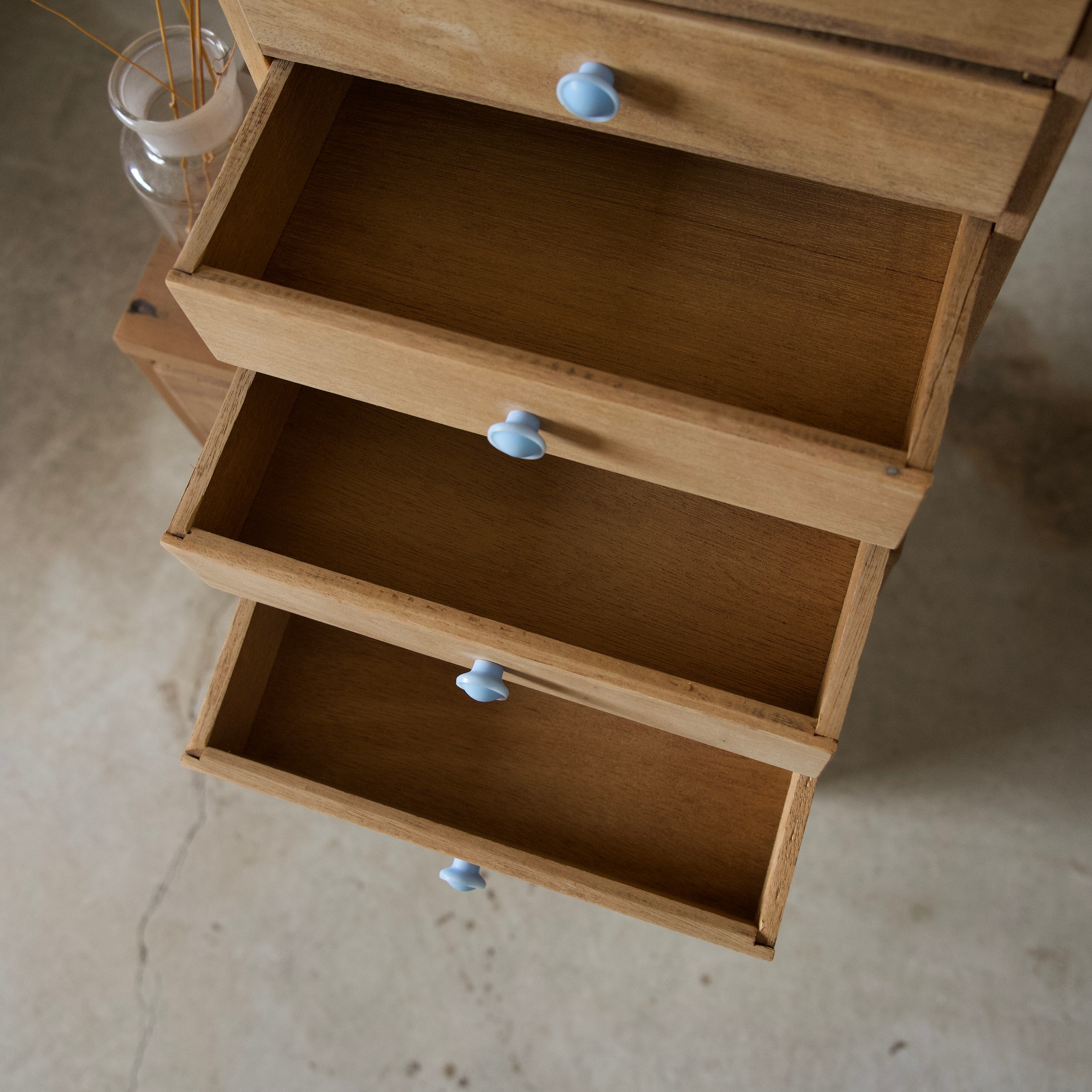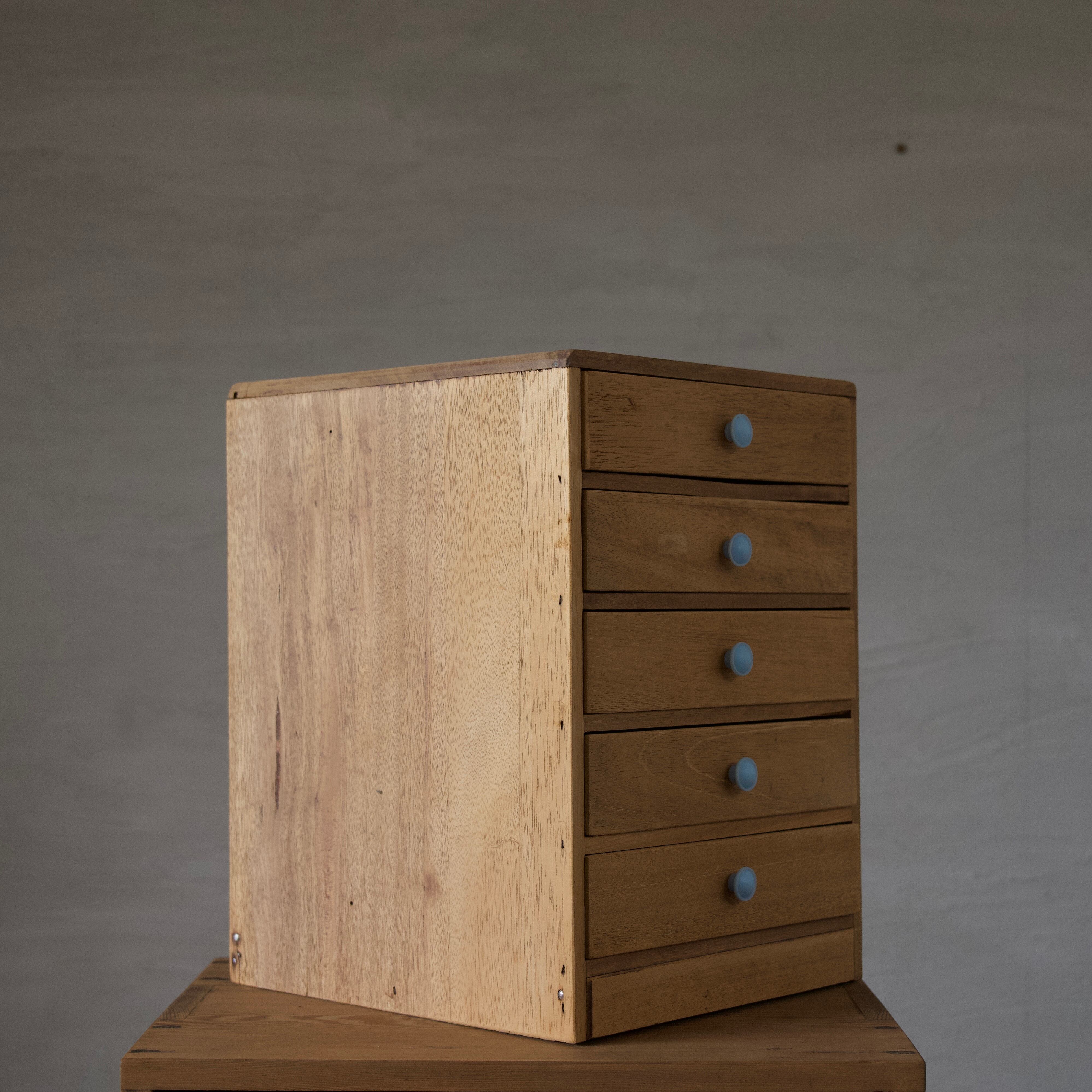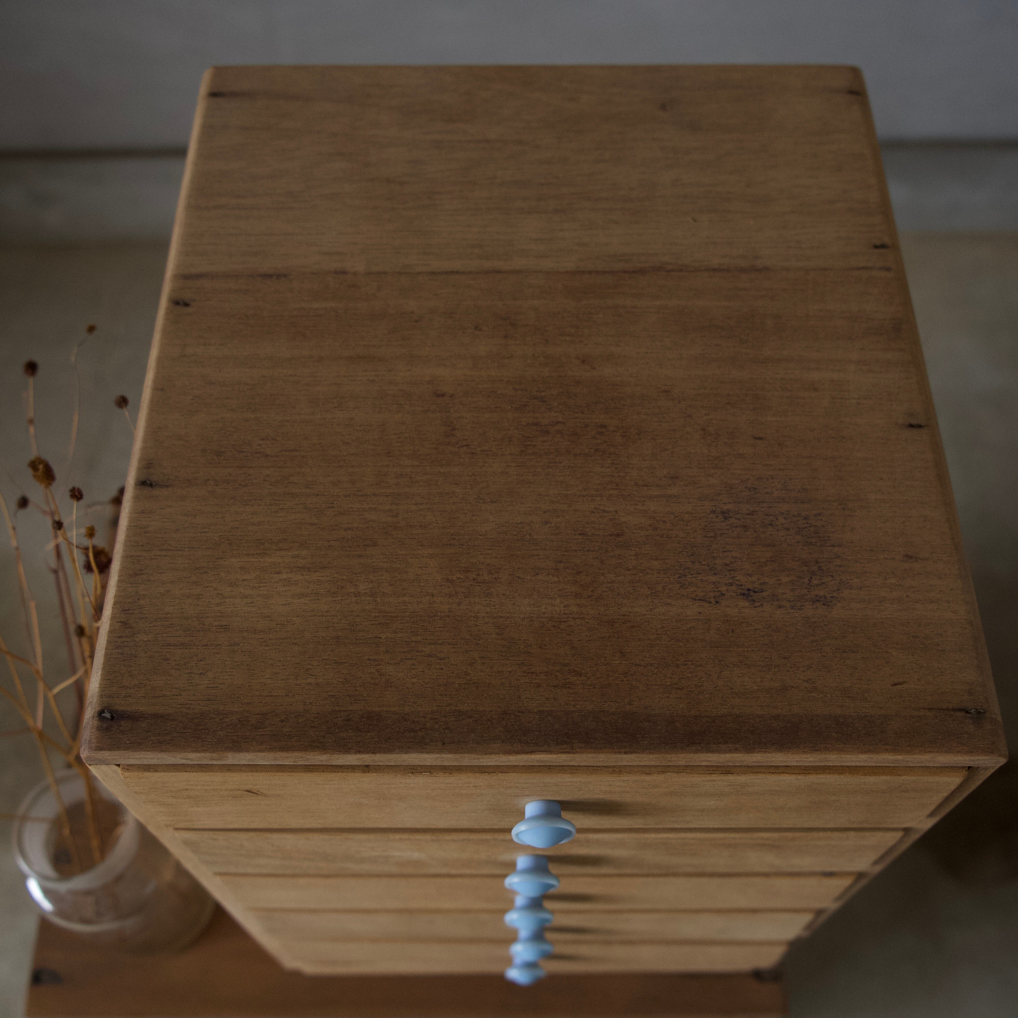無垢材のナチュラルな木味とちいさな水色のつまみが可愛らしい5杯の引き出し。