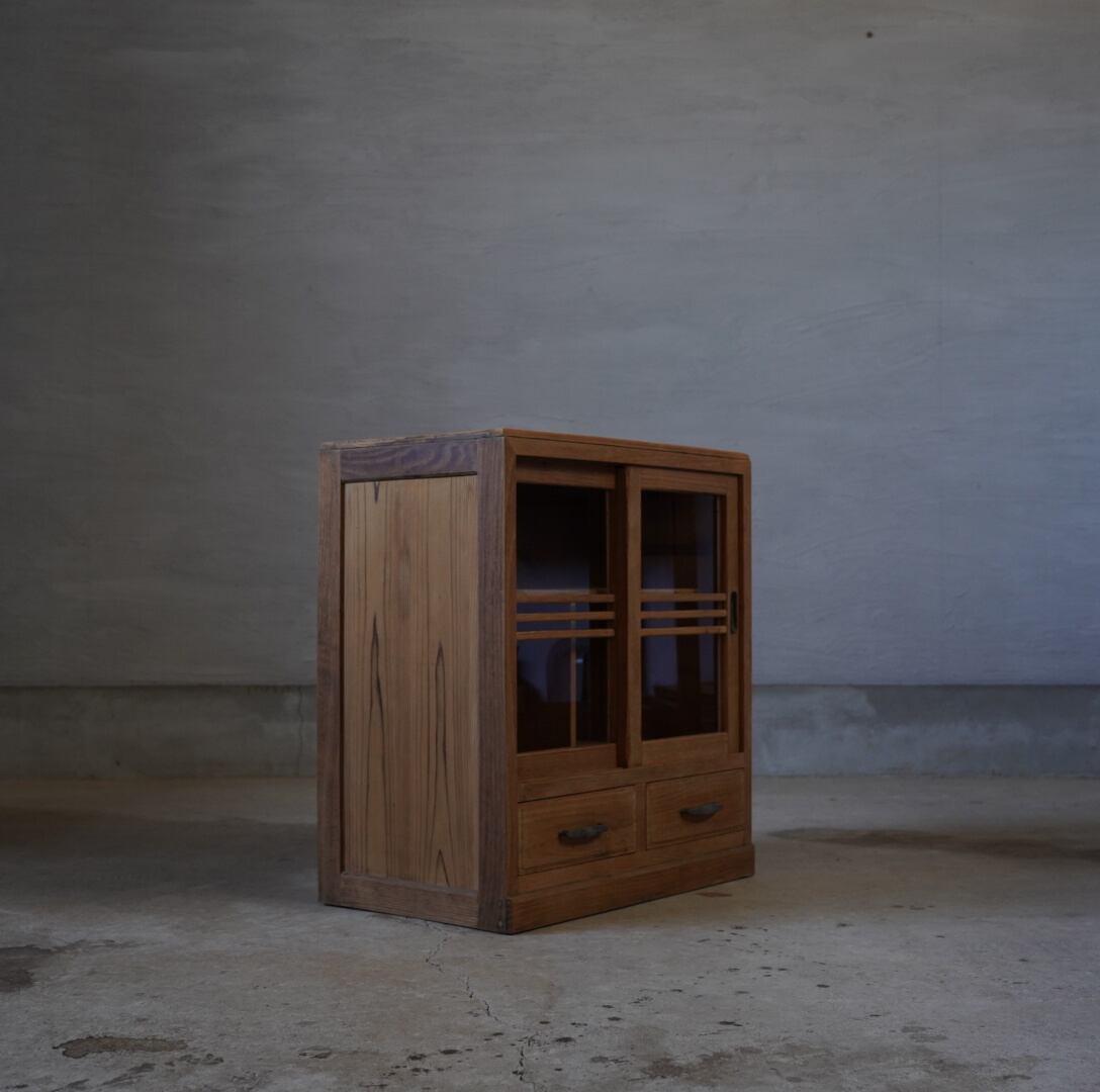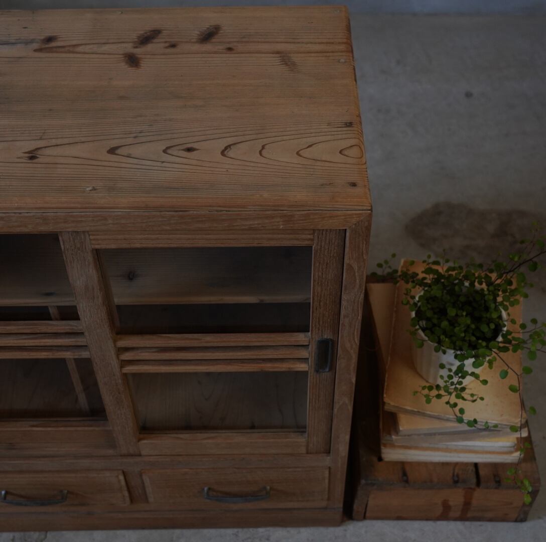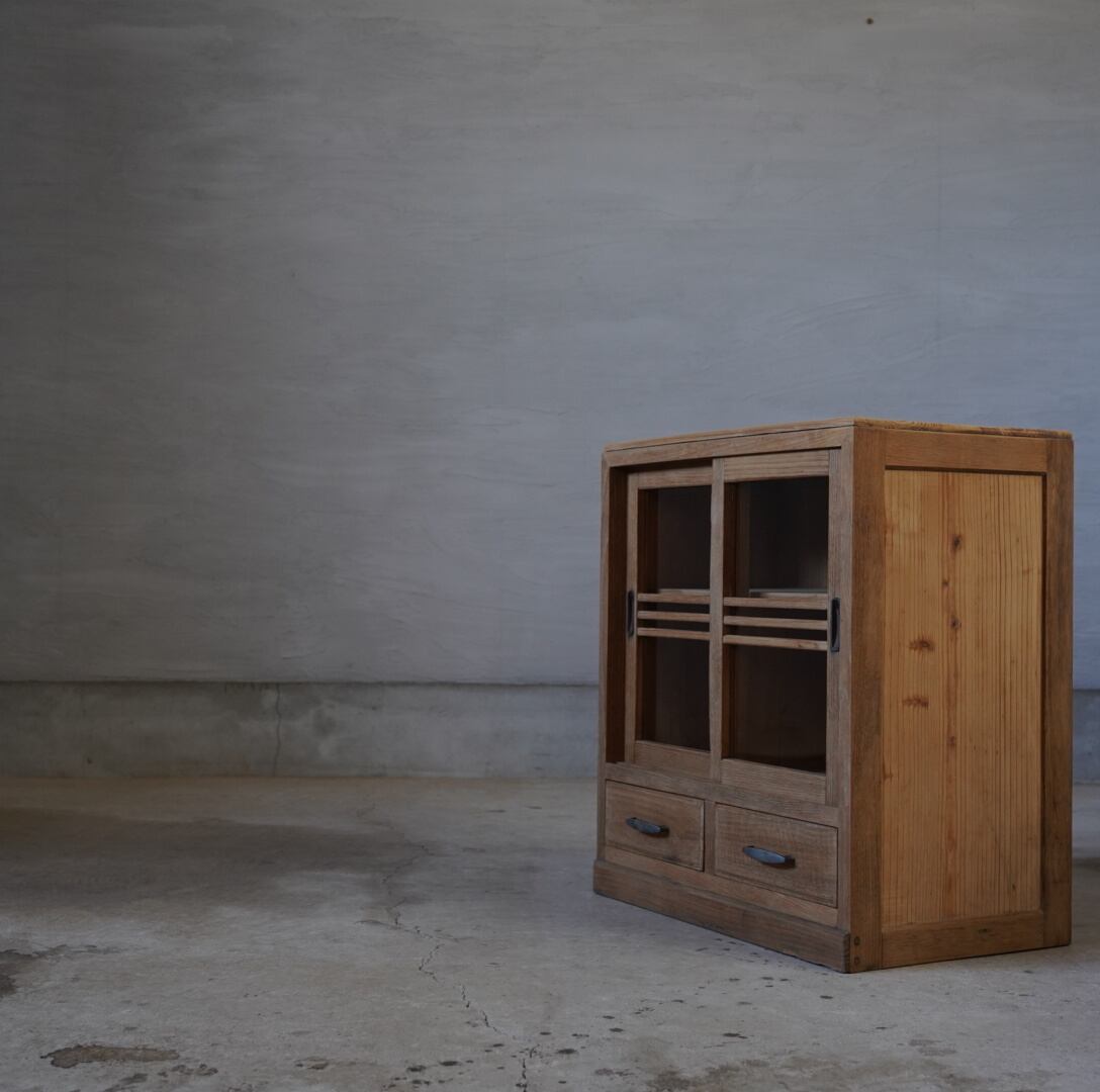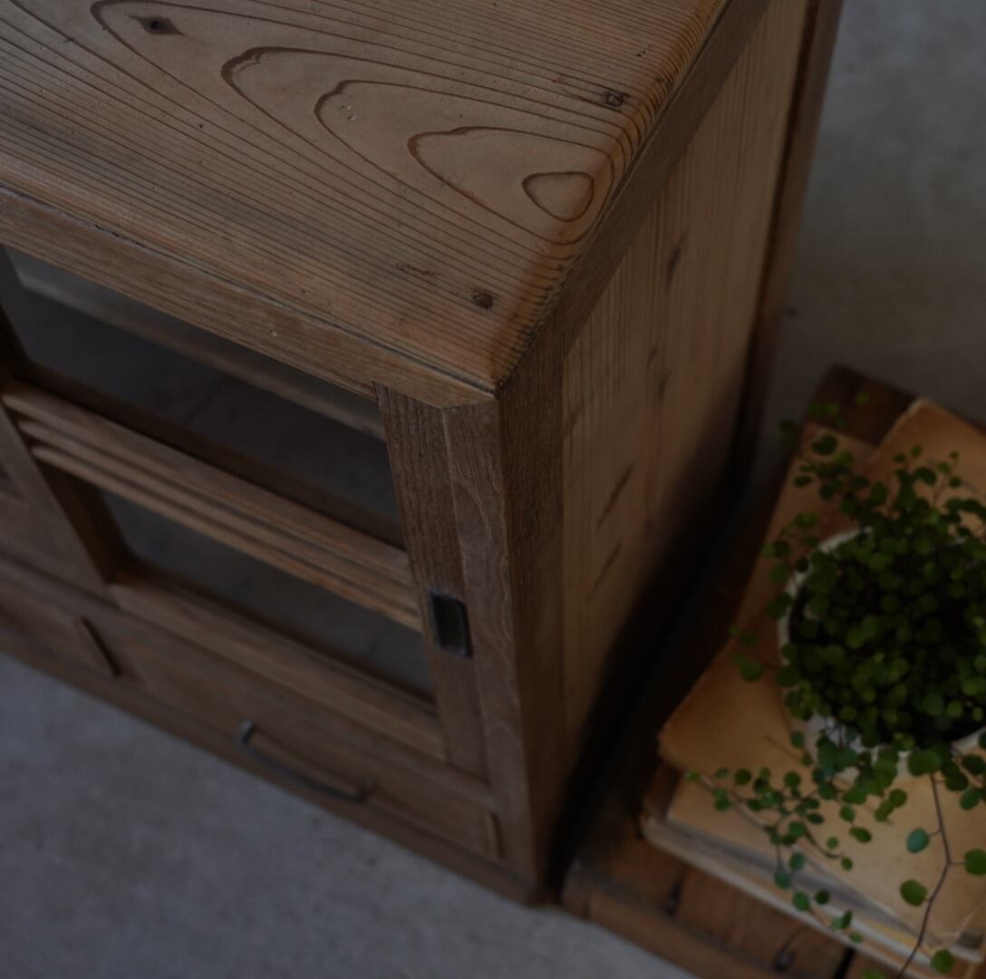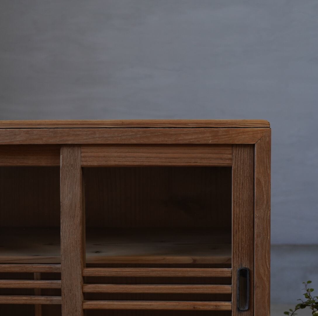 古い無垢材の素朴な風合いと格子ガラスの引き戸が魅力的なキャビネット。