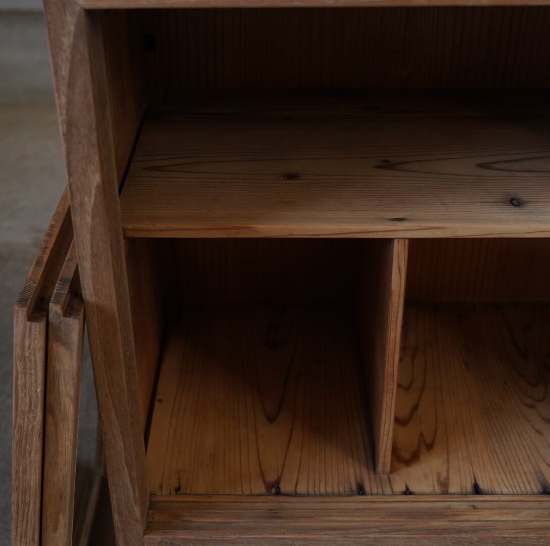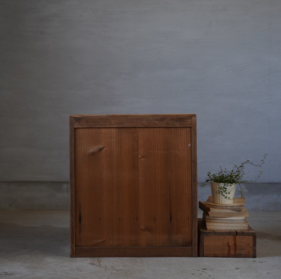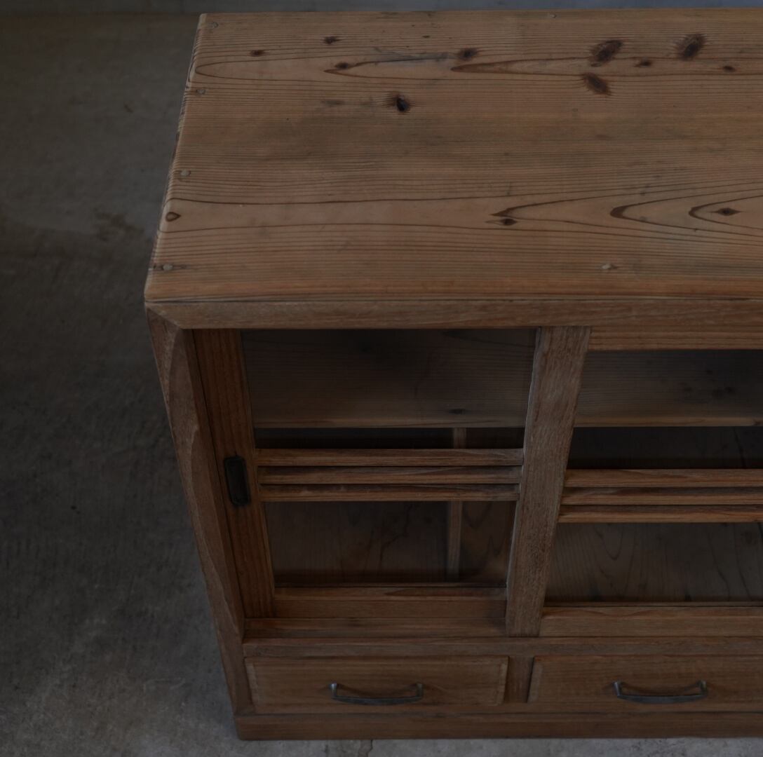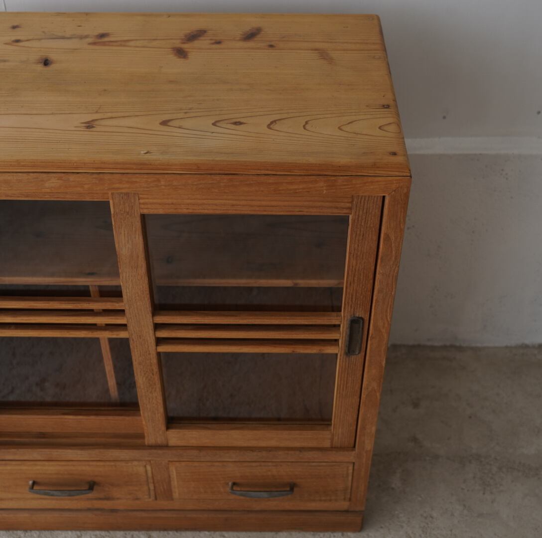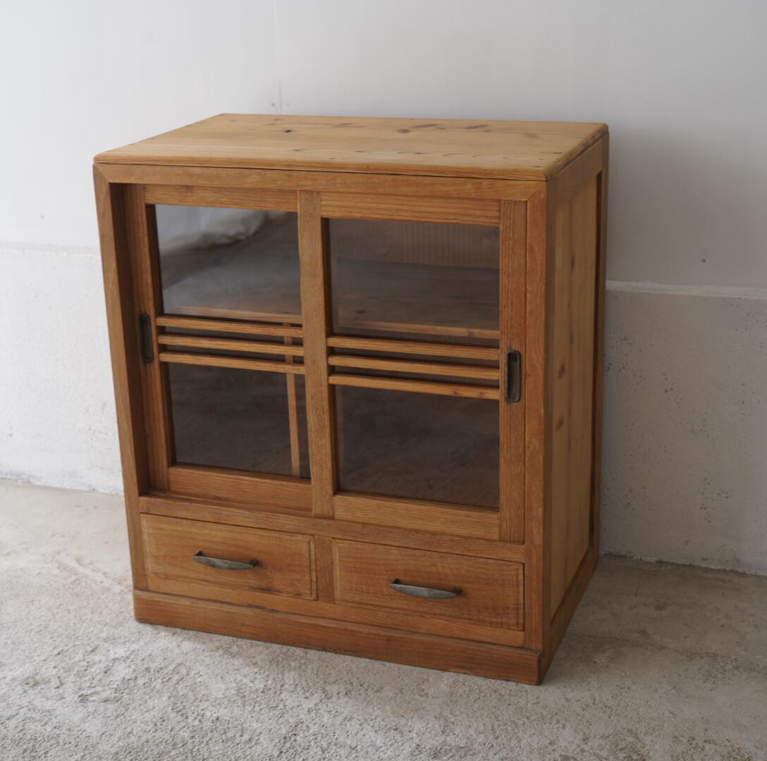 古い無垢材の素朴な風合いと格子ガラスの引き戸が魅力的なキャビネット。