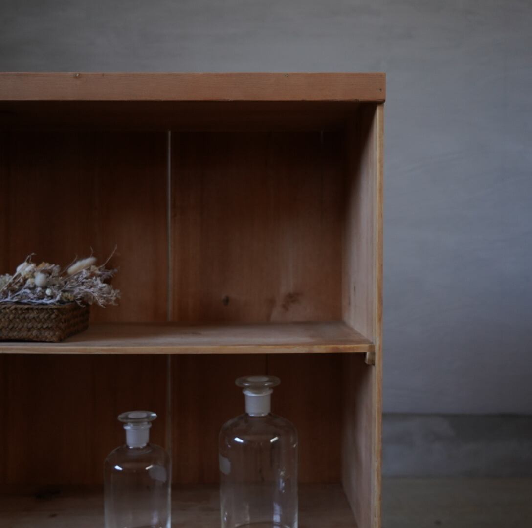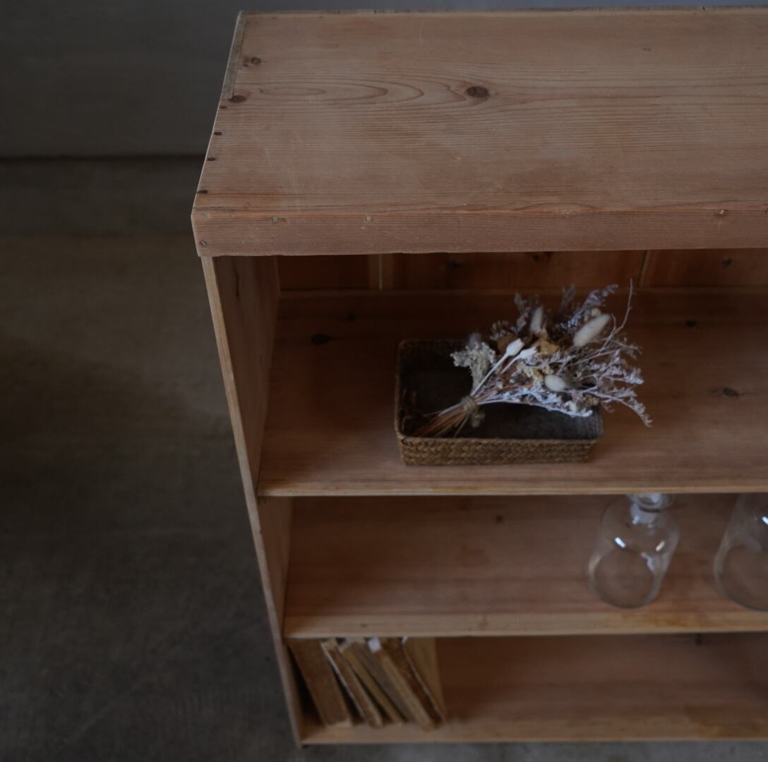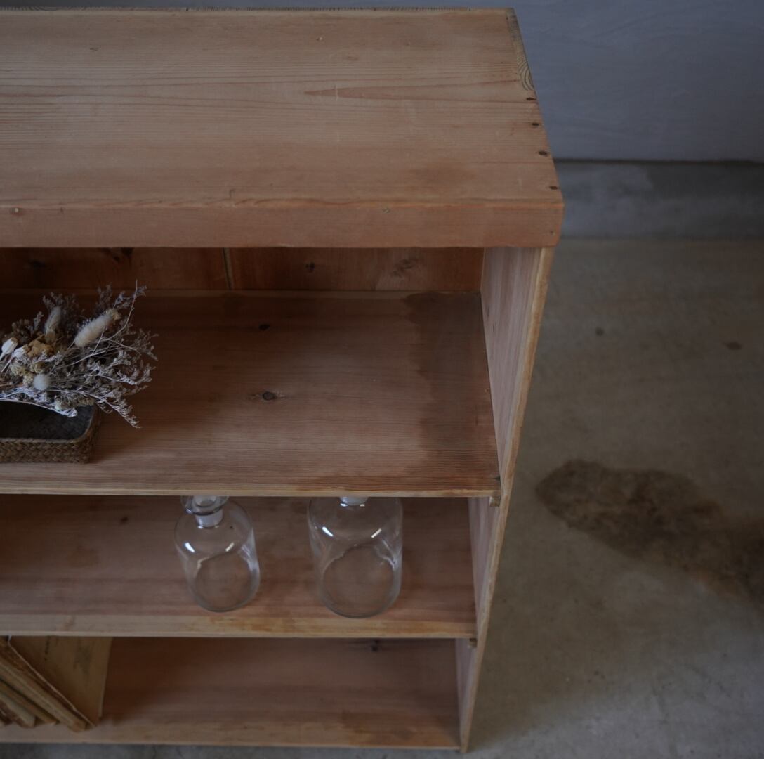 無垢材のナチュラルな木味とすっきりとしたデザインが魅力的な古い木製棚。