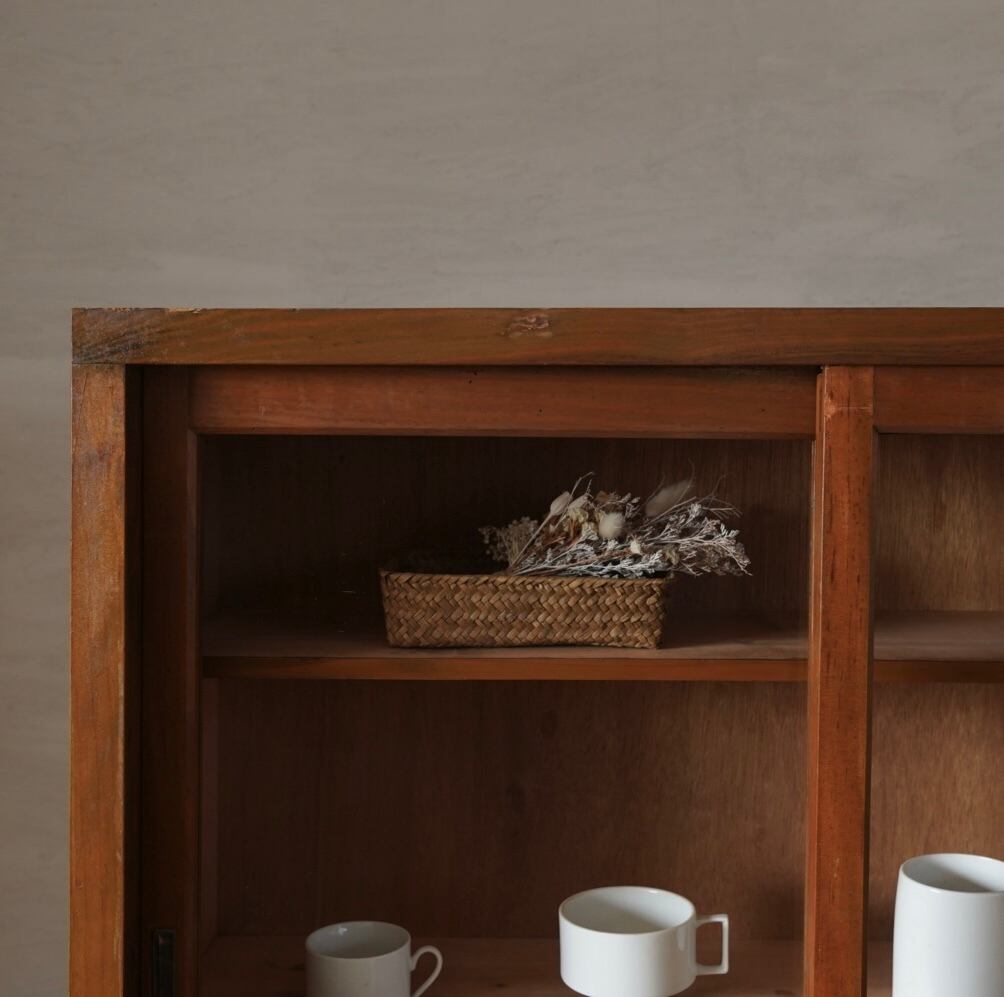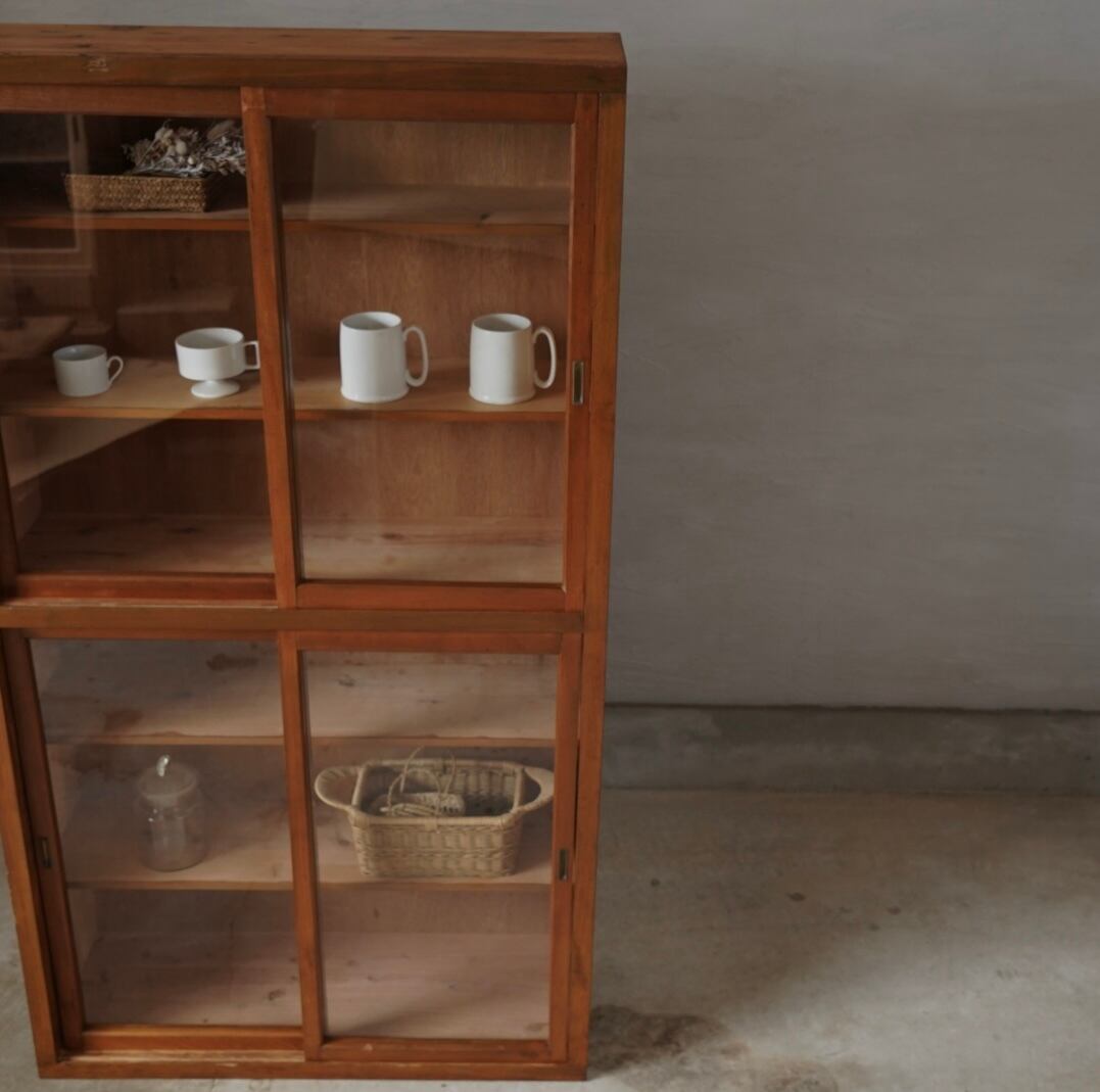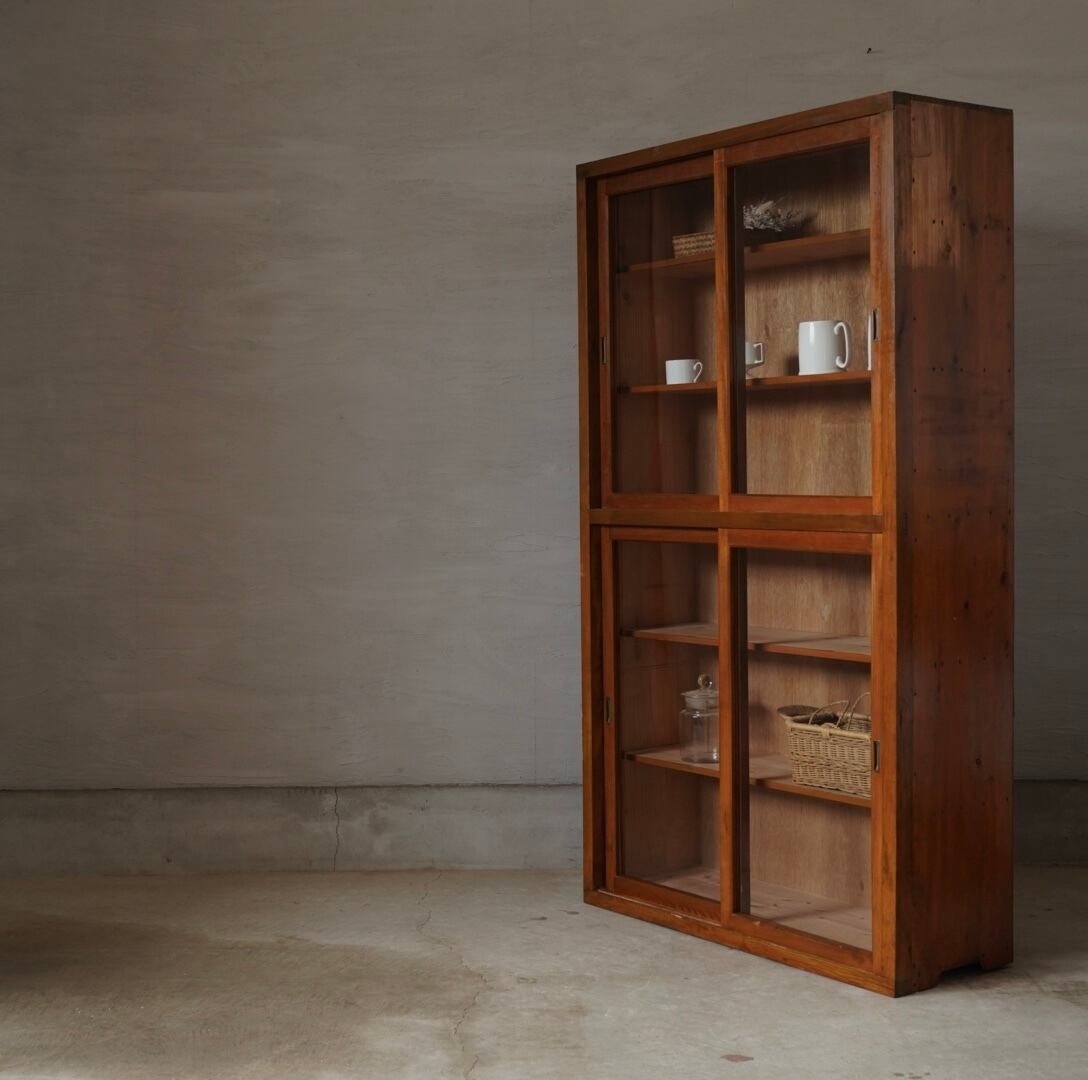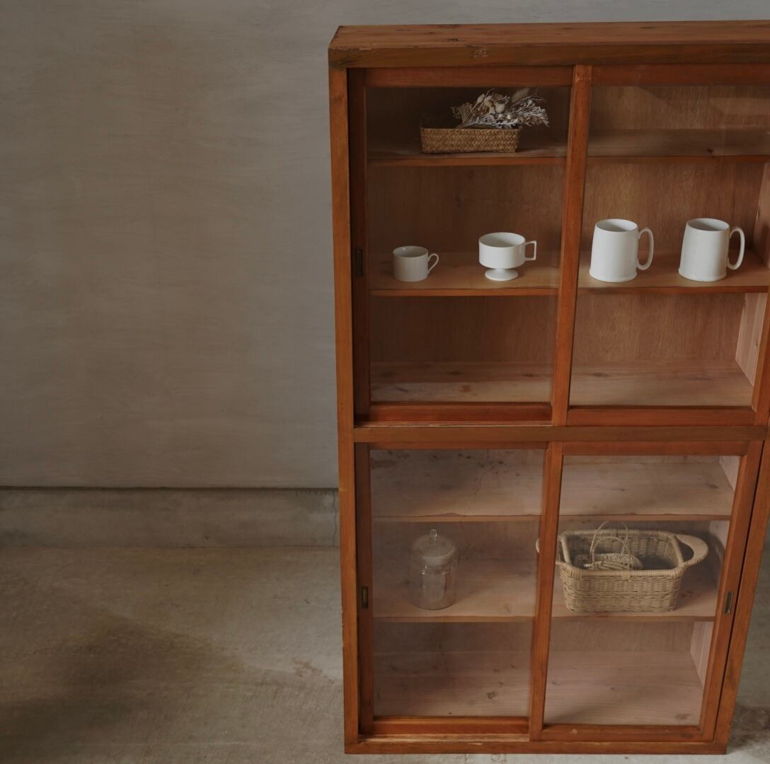 温かみのある経年変化とすっきりとした2段のガラス引き戸が美しい食器棚。