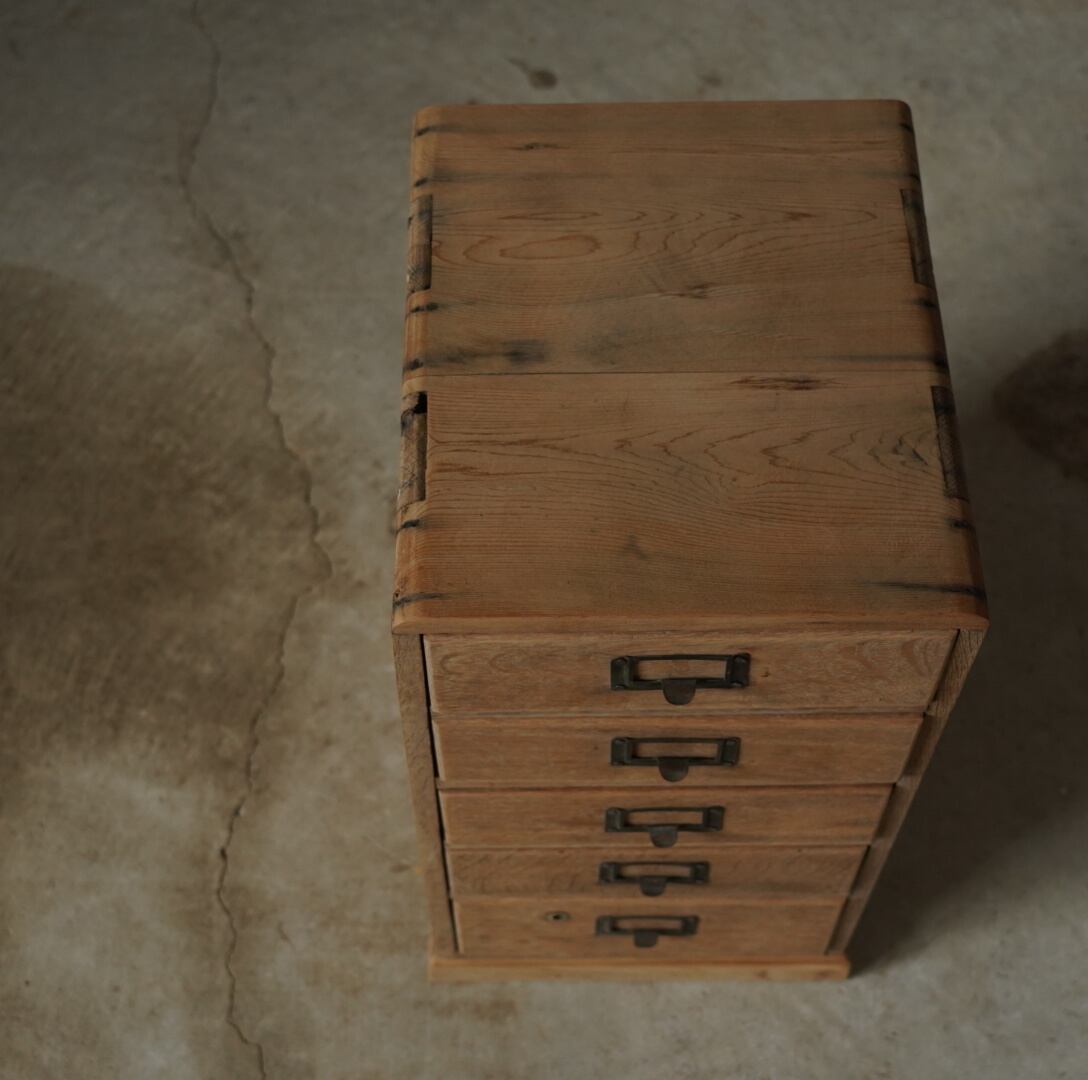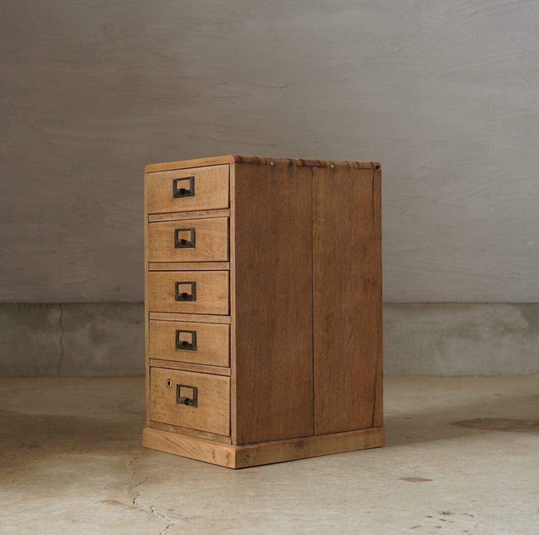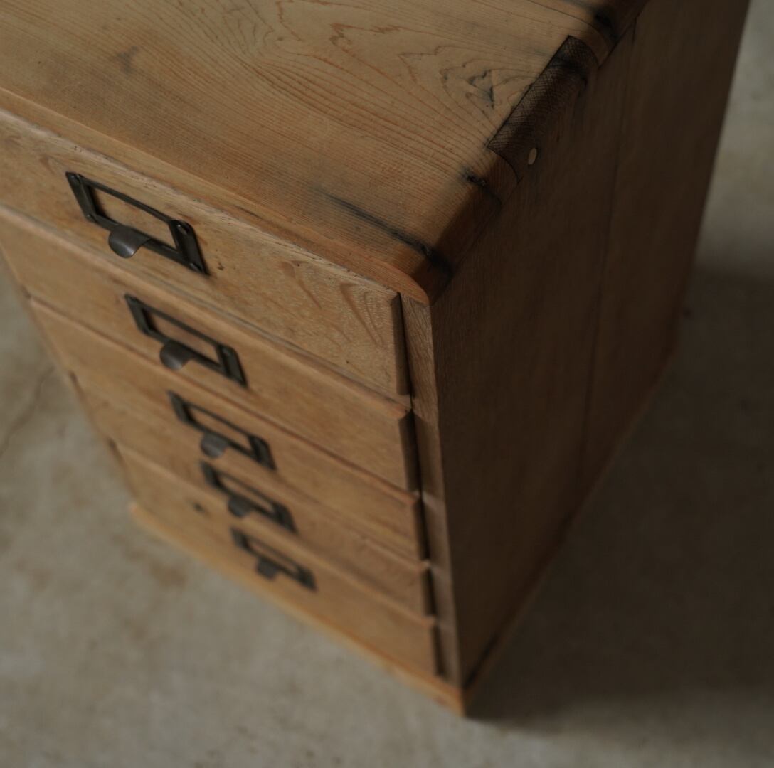 無垢材の温かみのある木味と経年変化のあるネームプレートが可愛らしい5杯の引き出しです。