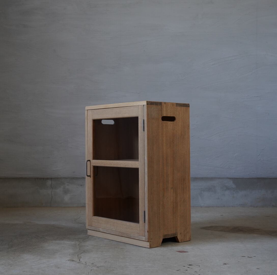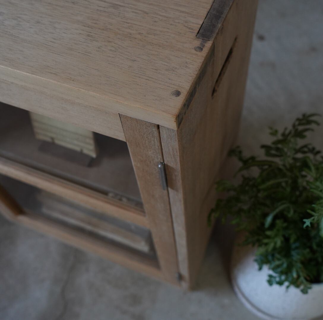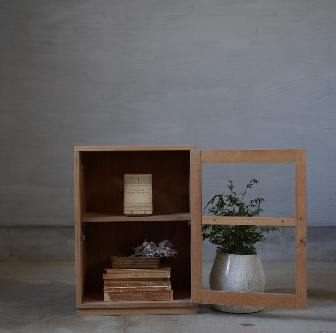 無垢材のナチュラルな木味とガラスの片開き戸が美しいキャビネット。