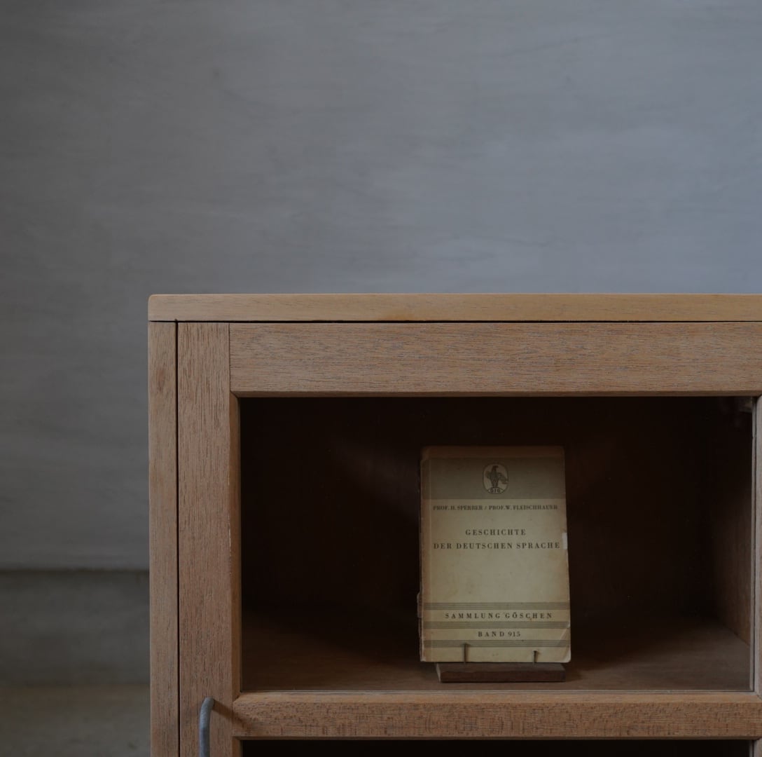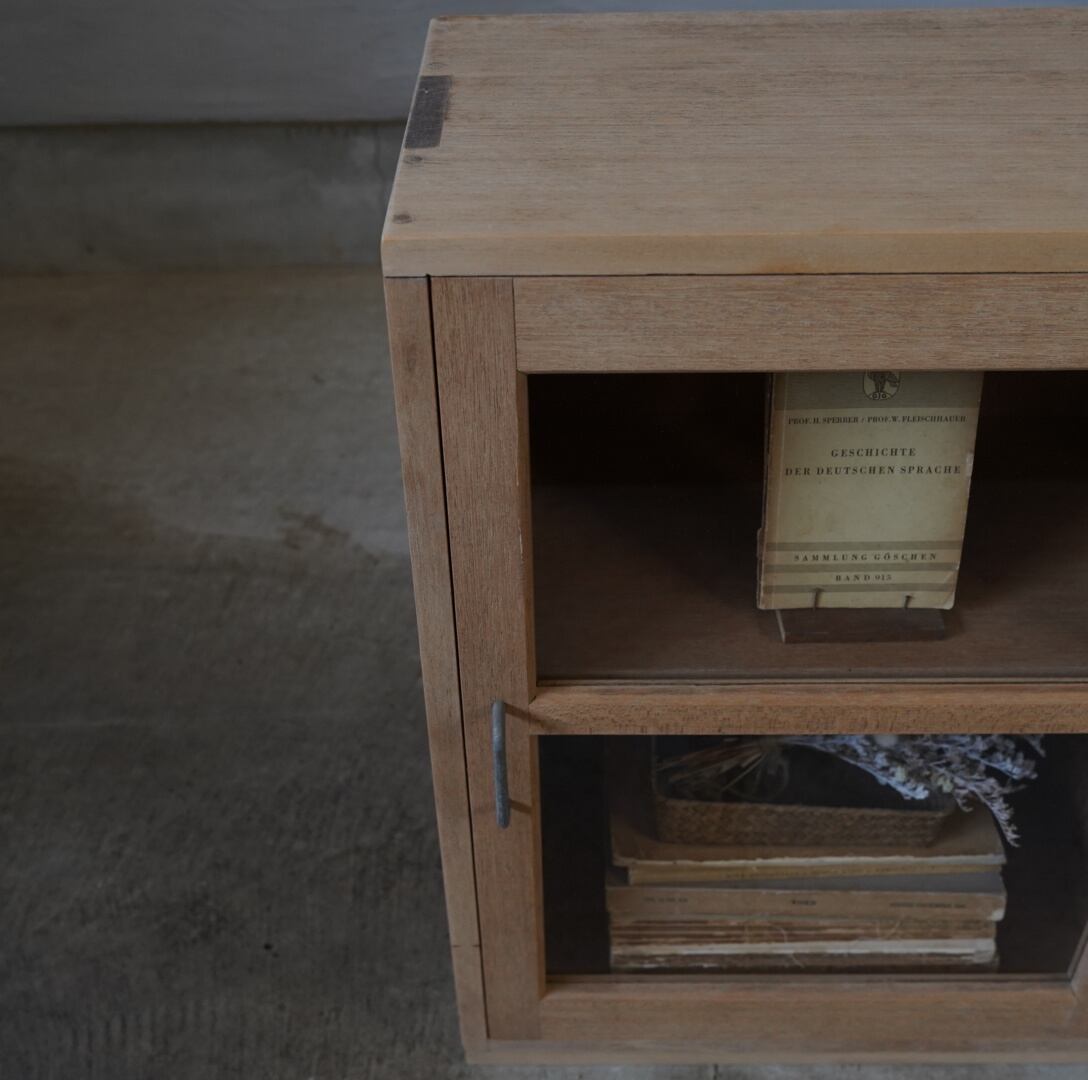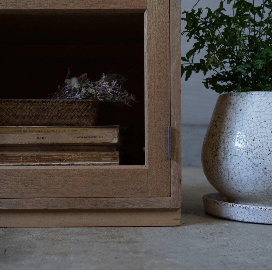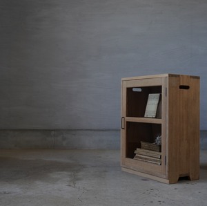 無垢材のナチュラルな木味とガラスの片開き戸が美しいキャビネット。