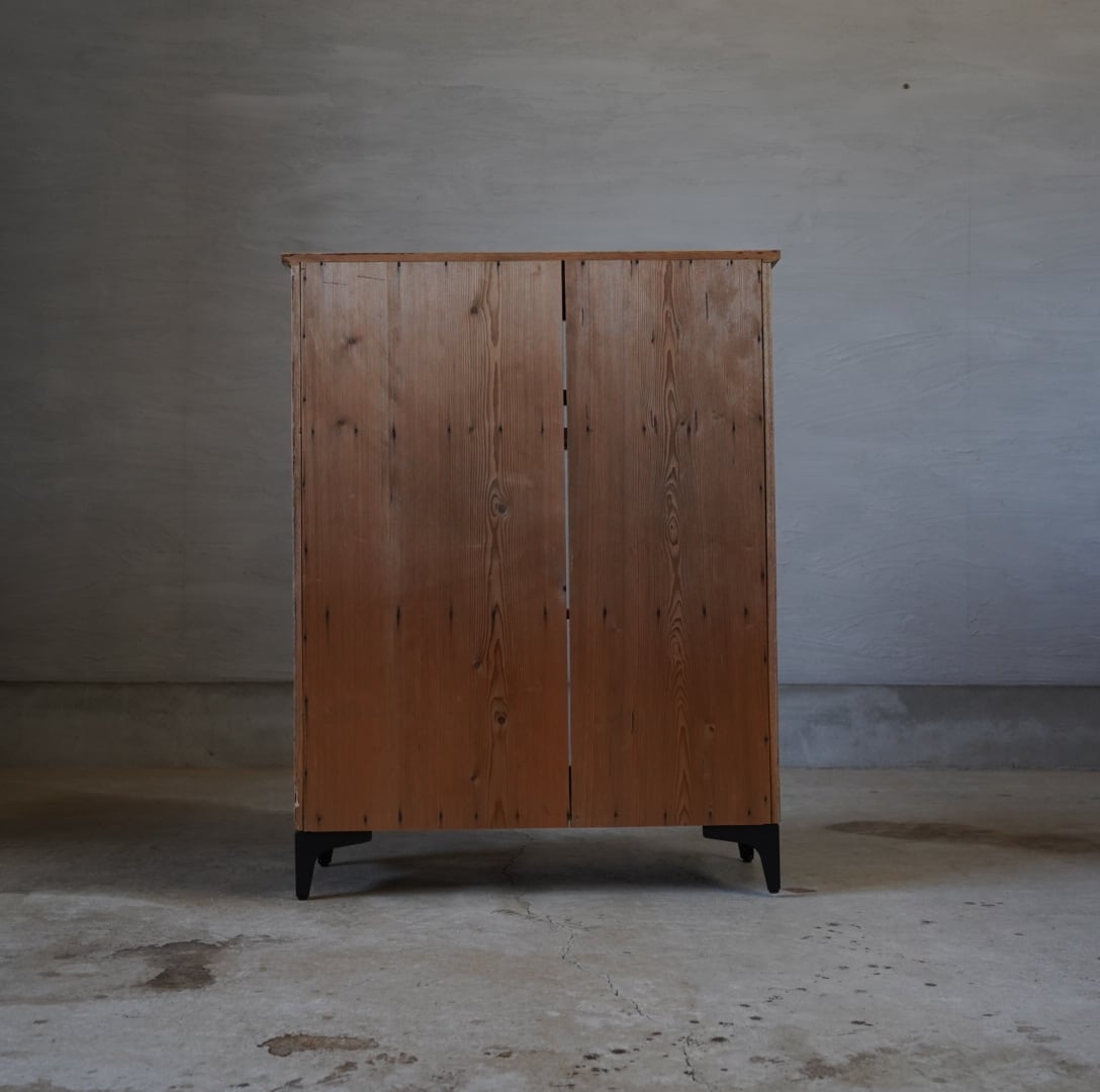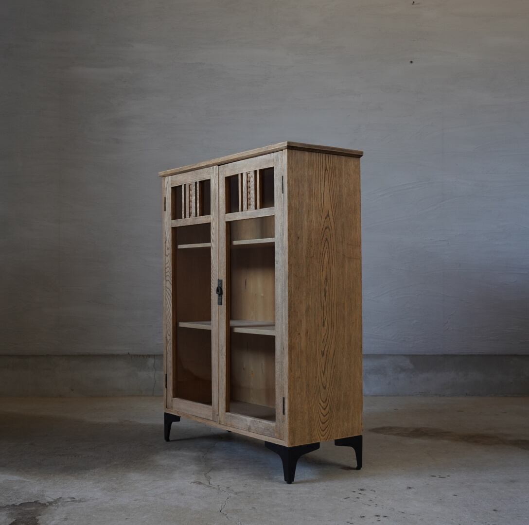 装飾の入った大きなガラス戸とすっきりとしたアイアン脚が魅力的なキャビネット。