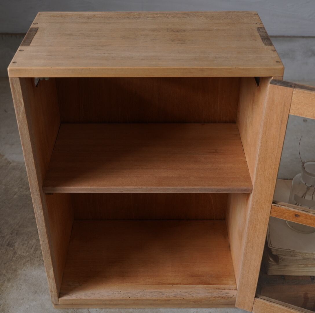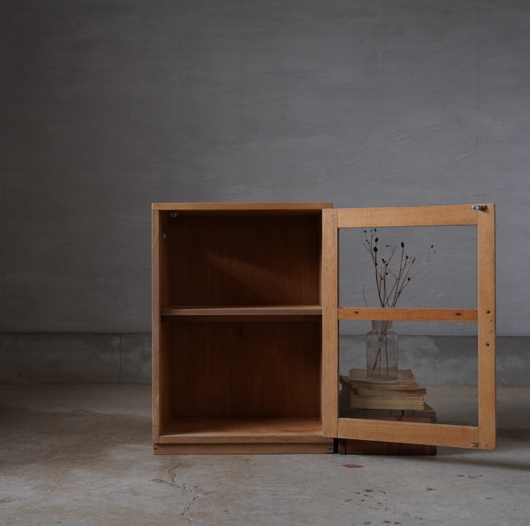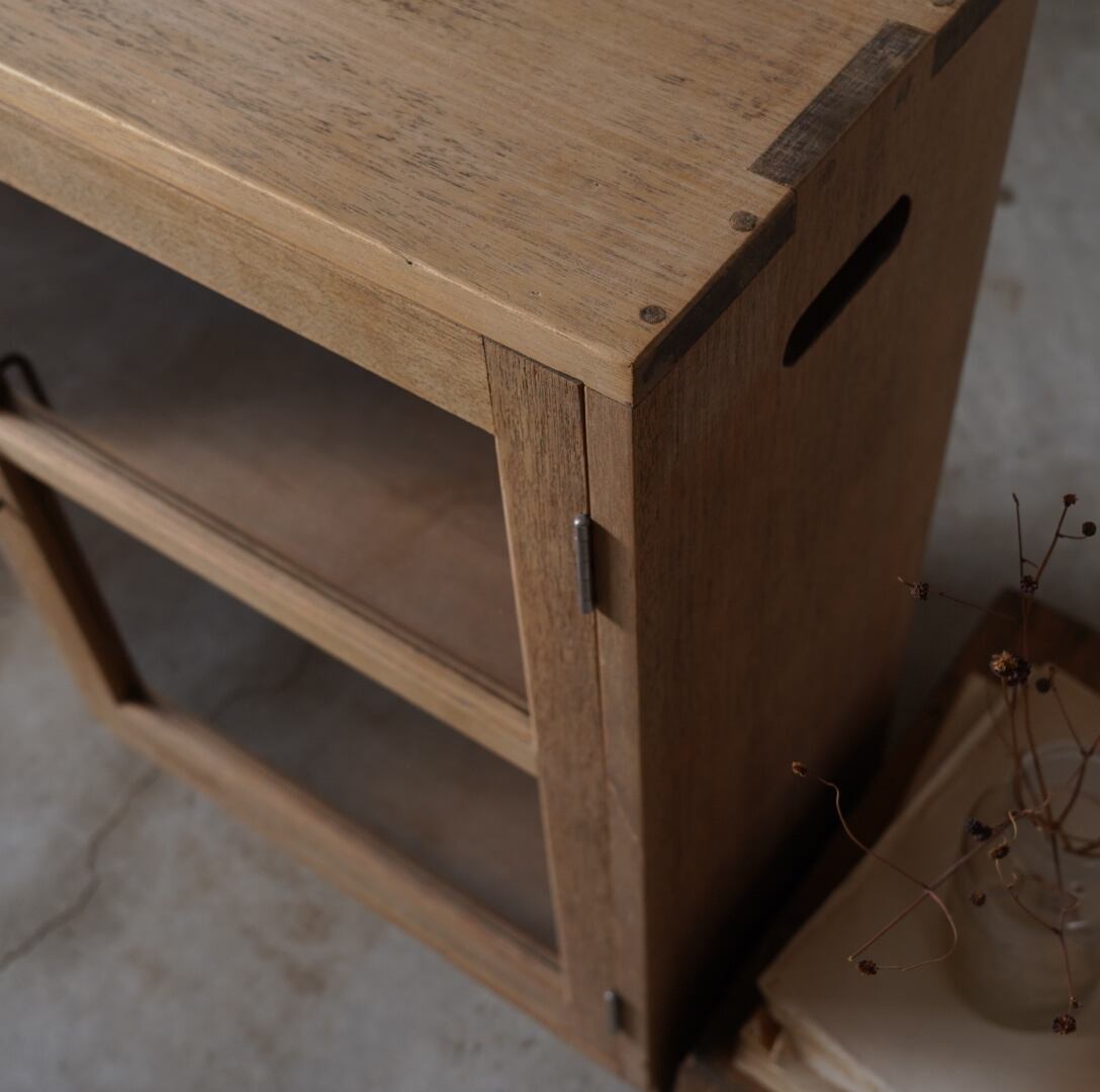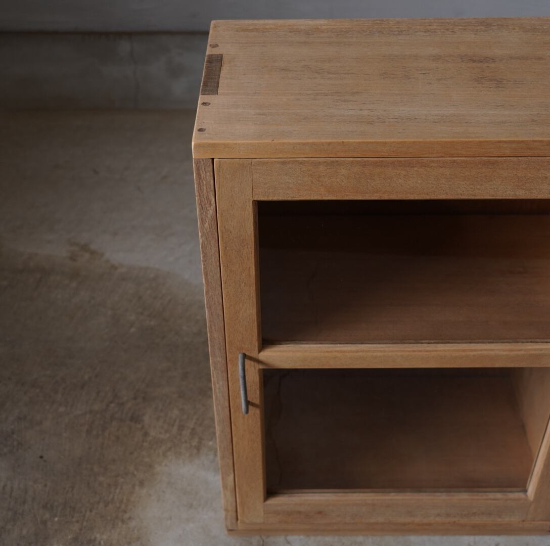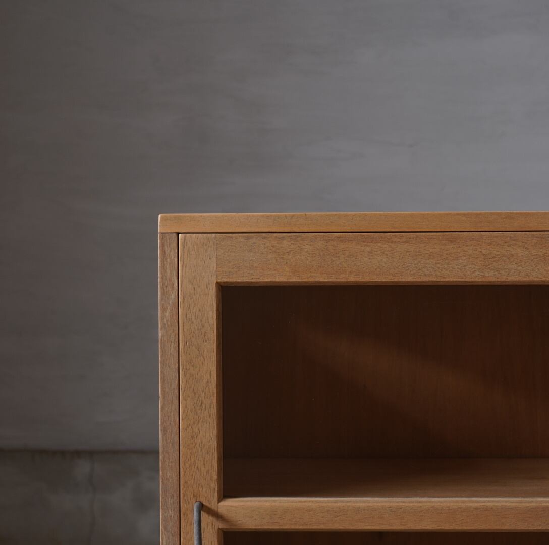 無垢材のナチュラルな木味とガラスの片開き戸が美しいキャビネット。