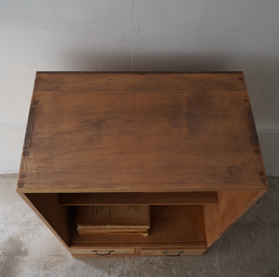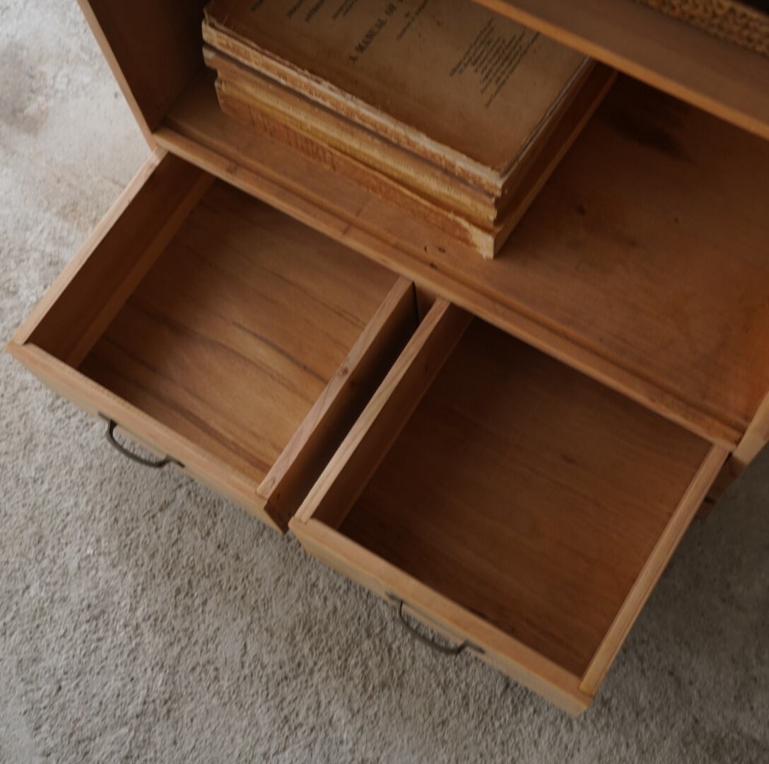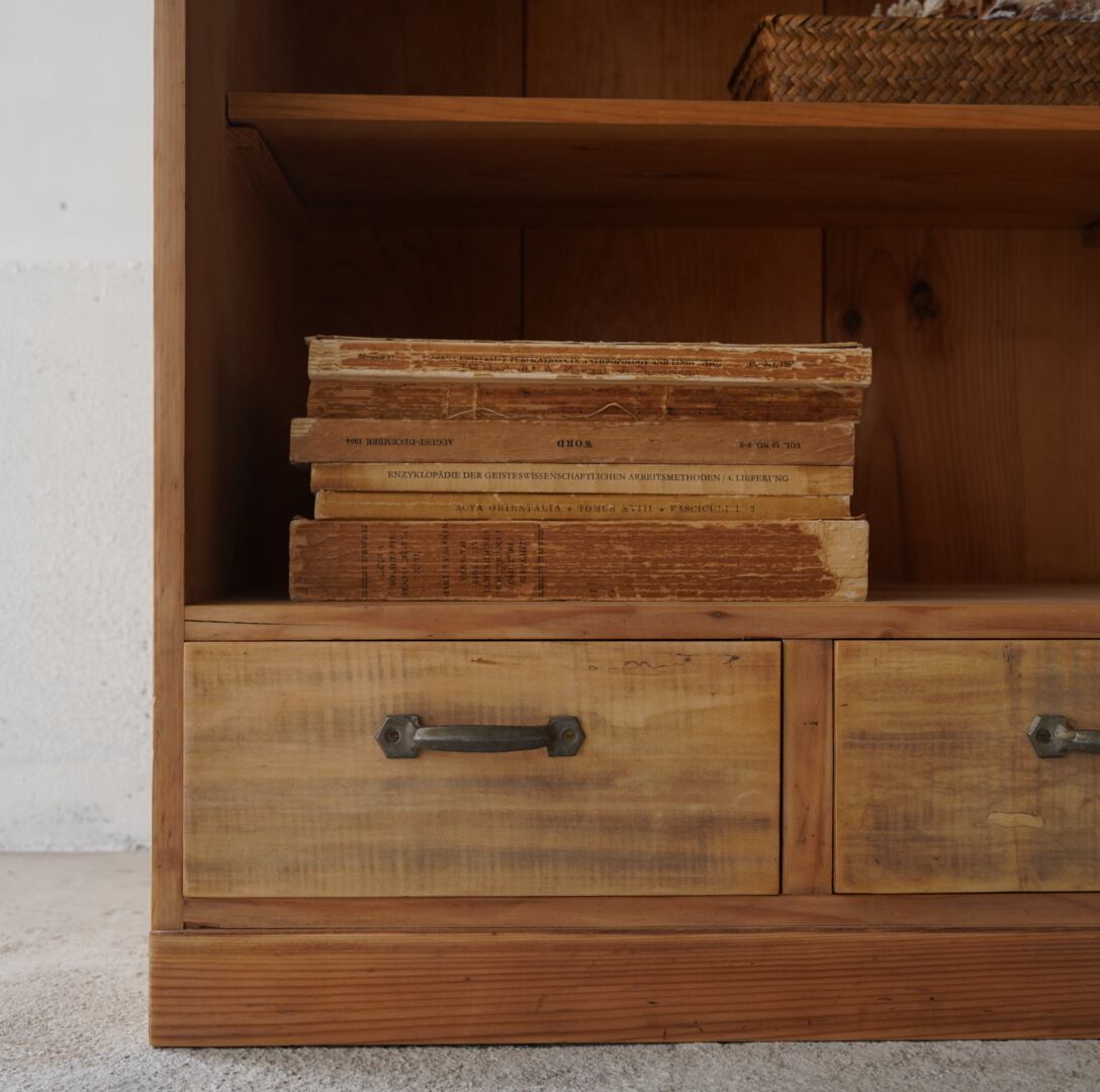 無垢材の温かみのある木味と金属取手の引き出しが魅力的な古い木製棚。