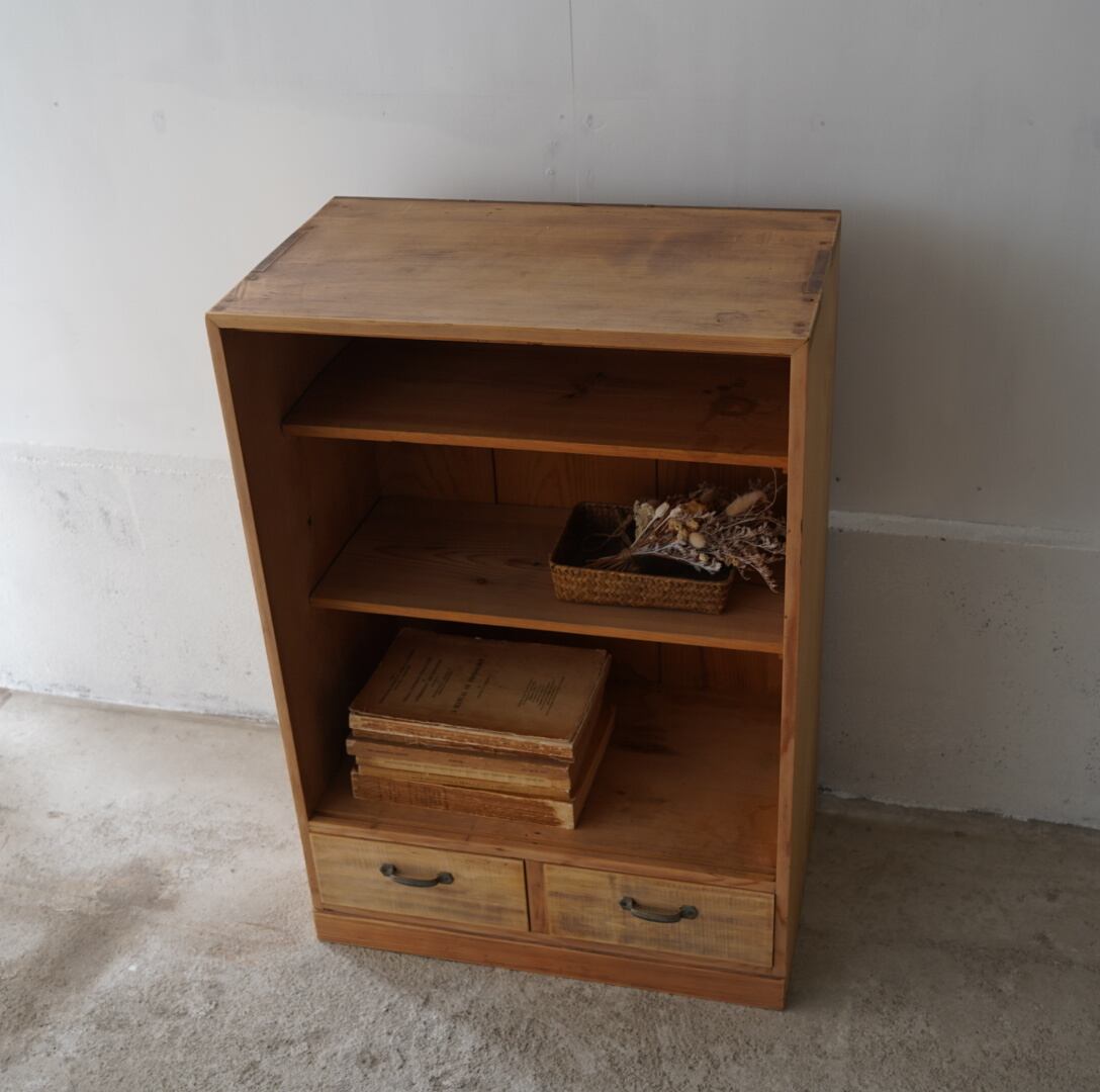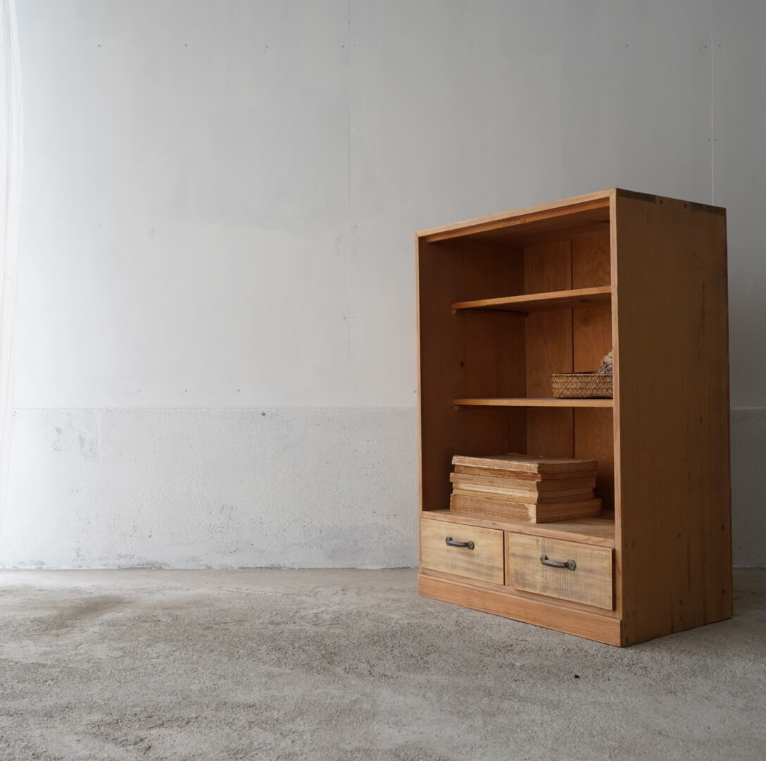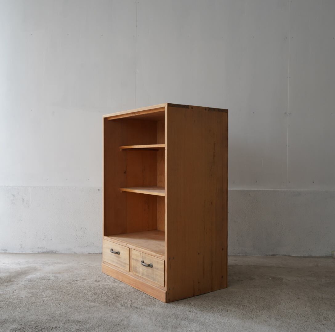 無垢材の温かみのある木味と金属取手の引き出しが魅力的な古い木製棚。