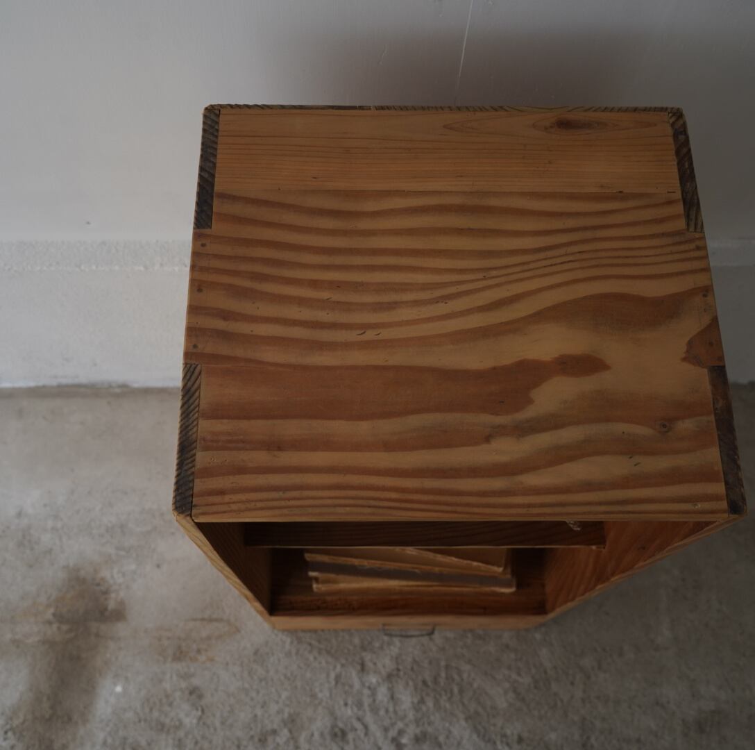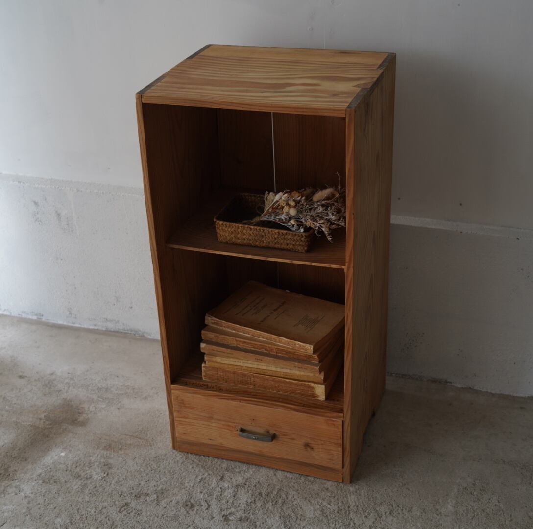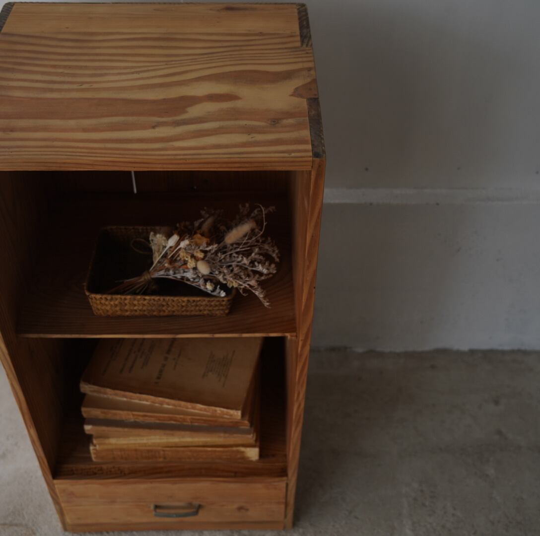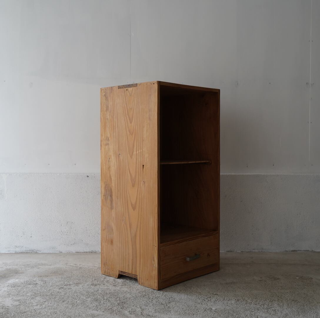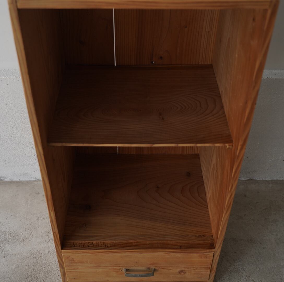 無垢材の温かみのある木味と金属取手の引き出しが魅力的な古い木製棚。