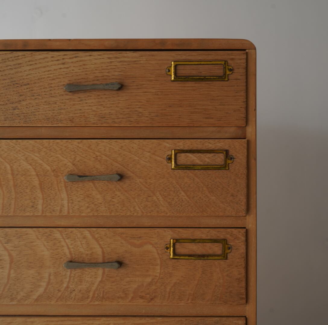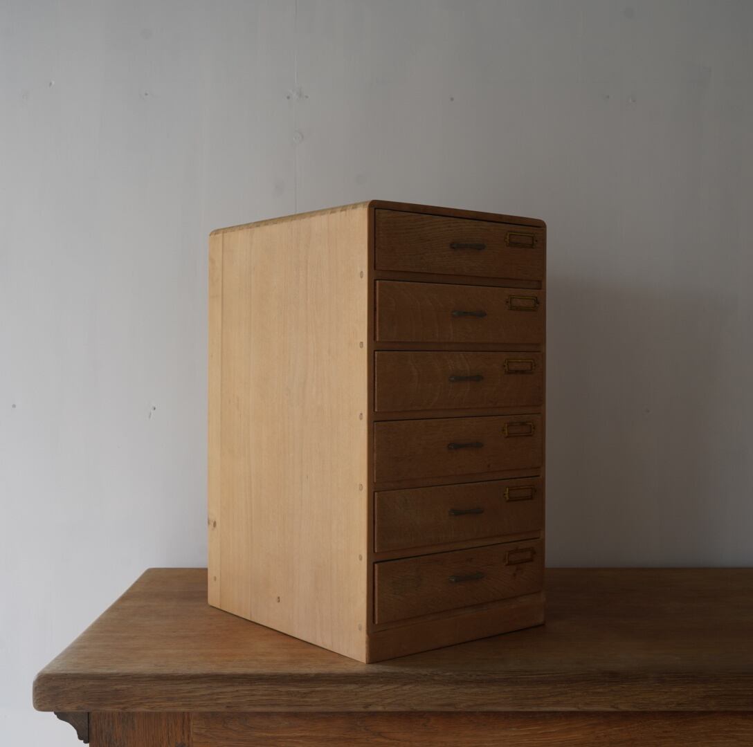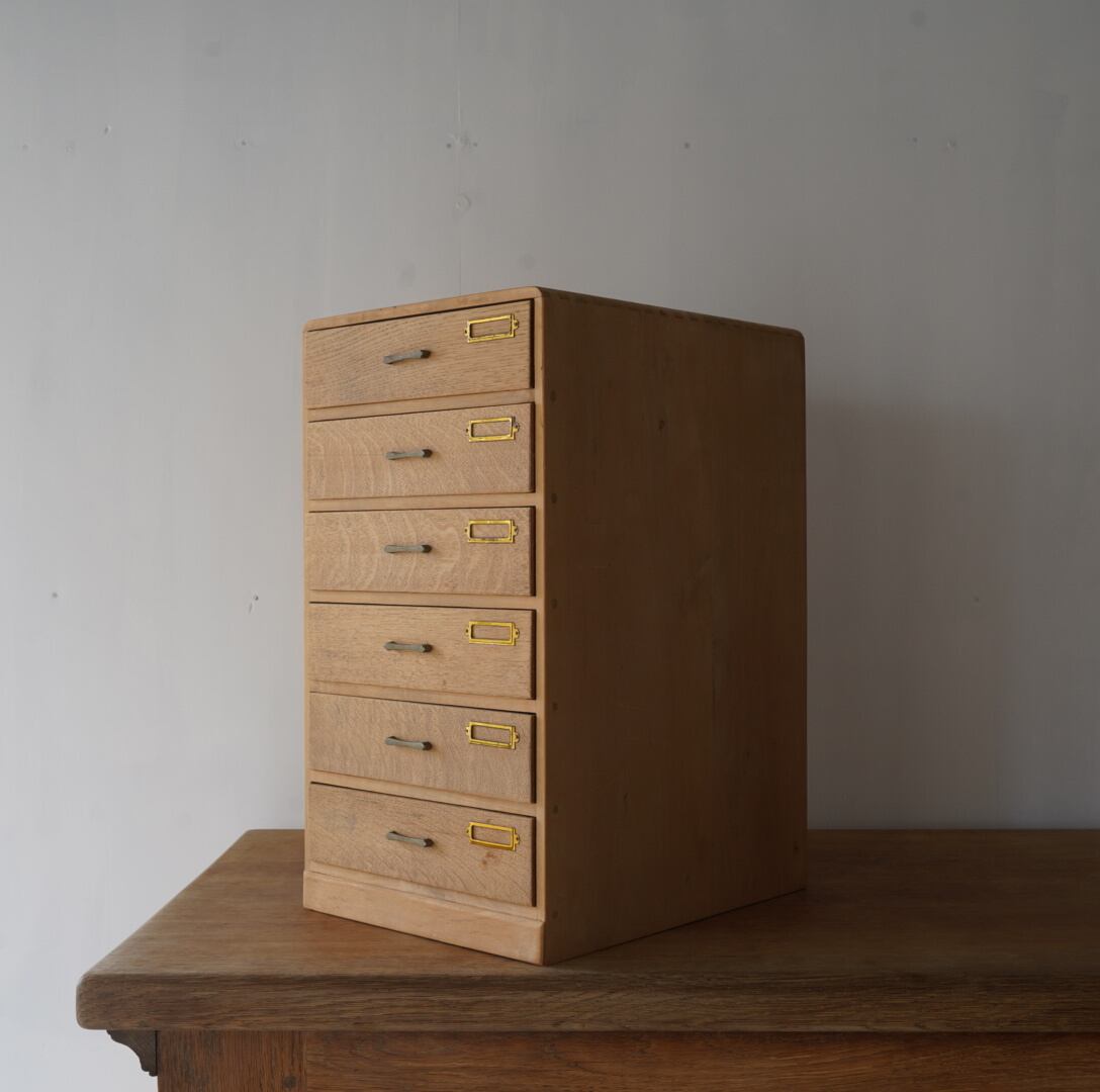 ナチュラルな木味、並んだ金属の取手とネームプレートが可愛らしい6杯の引き出し。