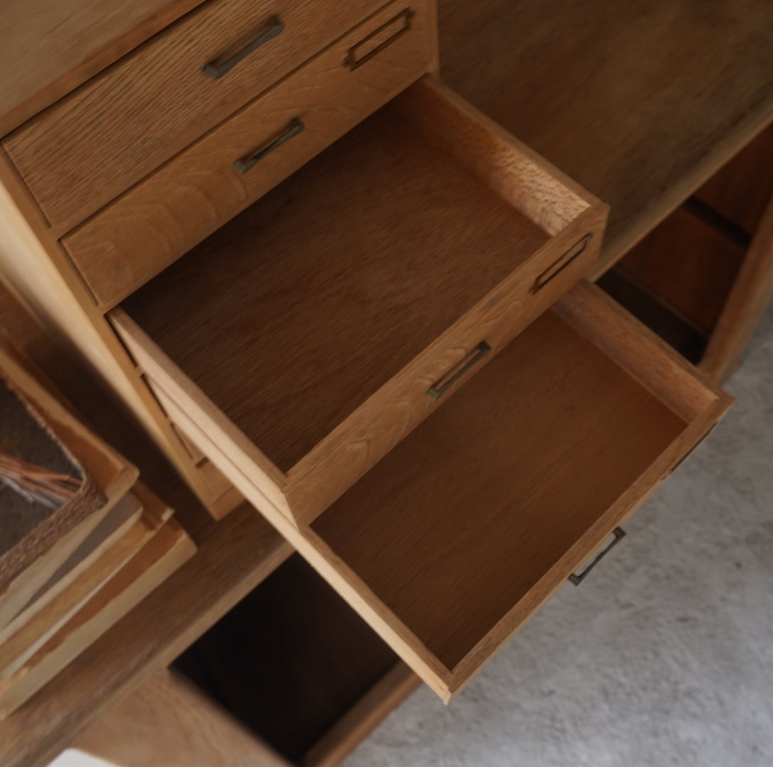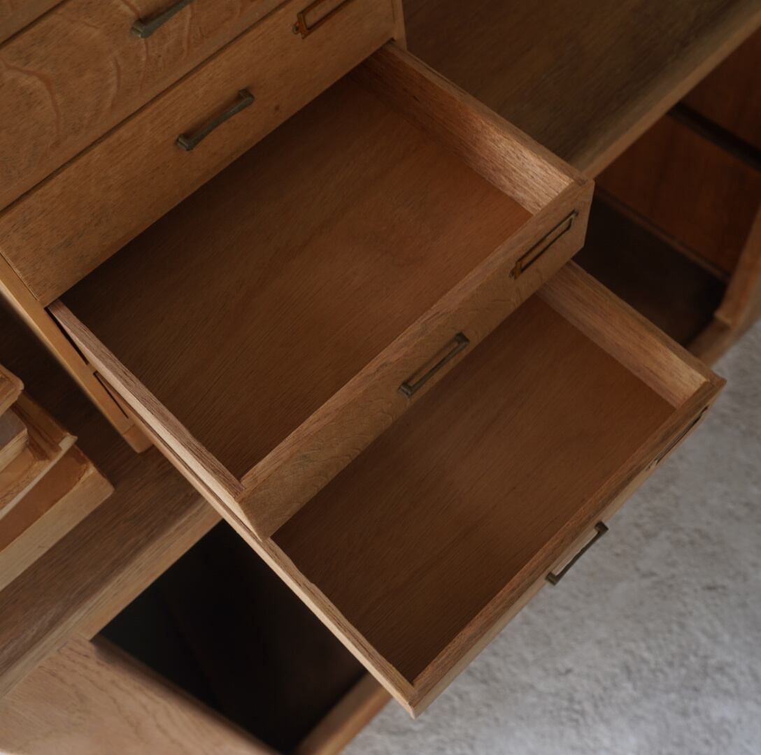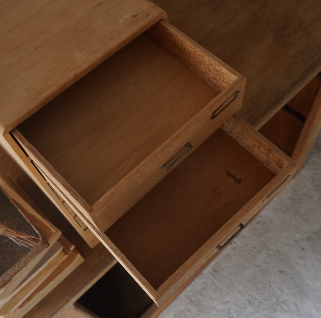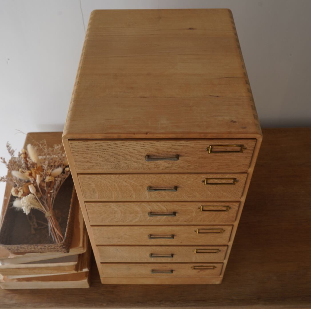 ナチュラルな木味、並んだ金属の取手とネームプレートが可愛らしい6杯の引き出し。