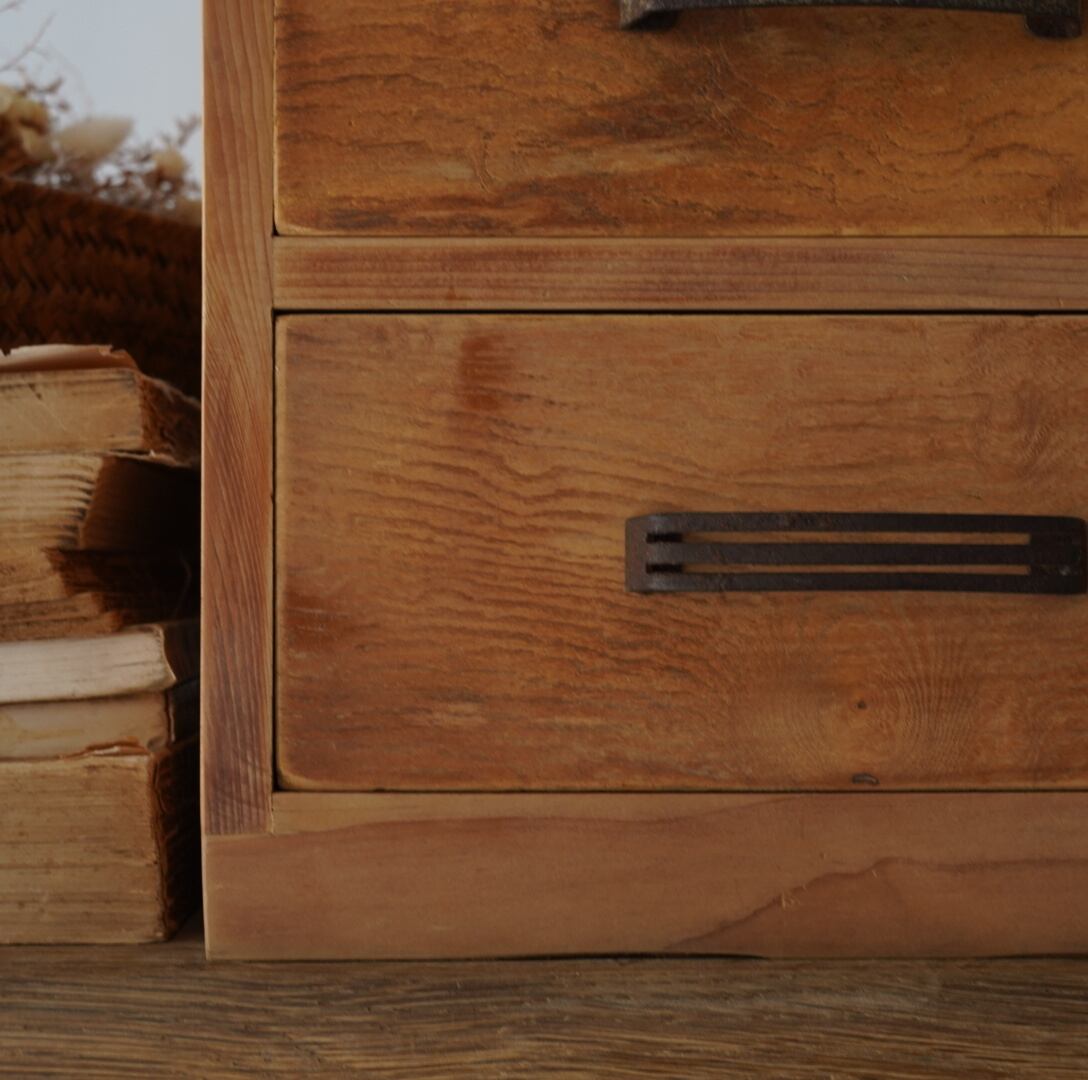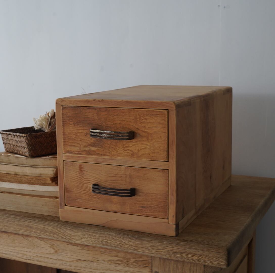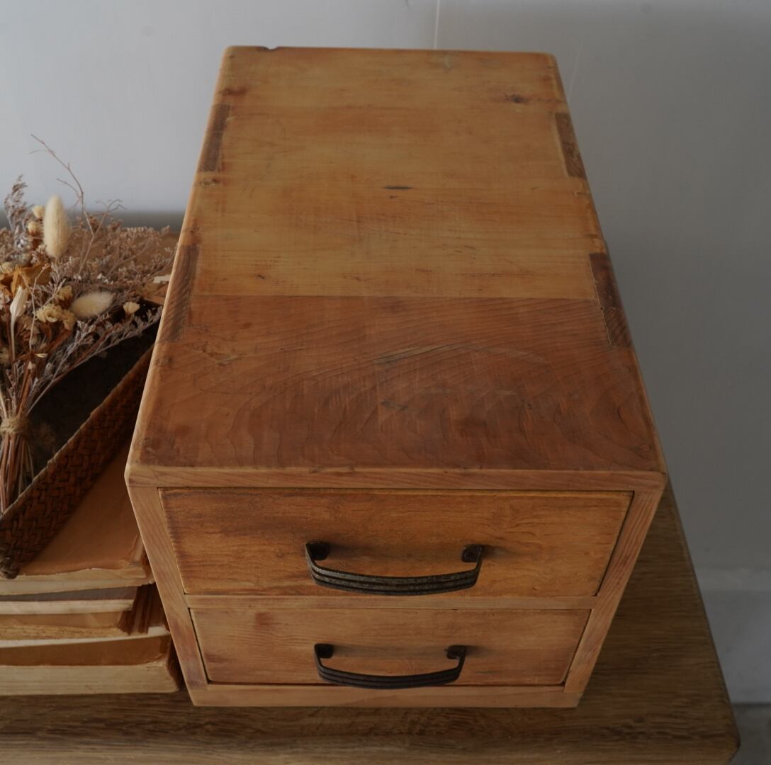 無垢の素朴な風合いと古い金属の取手が可愛らしい2杯の引き出し。