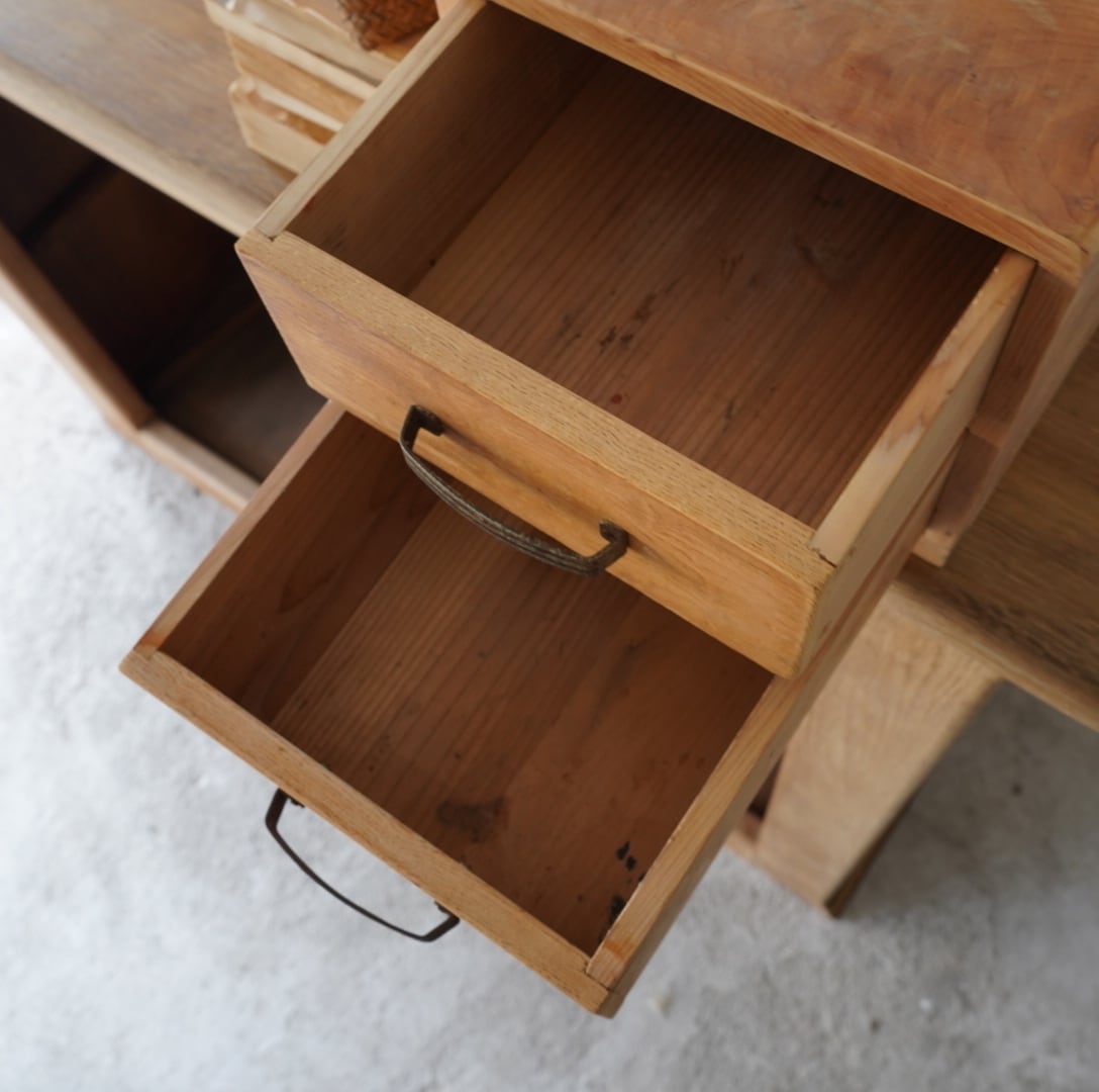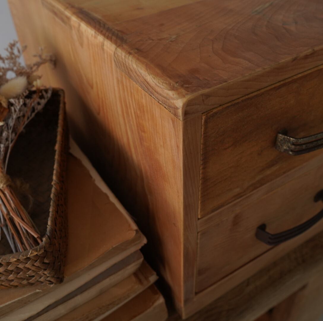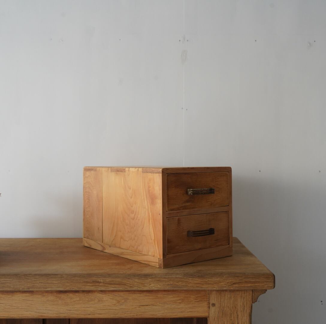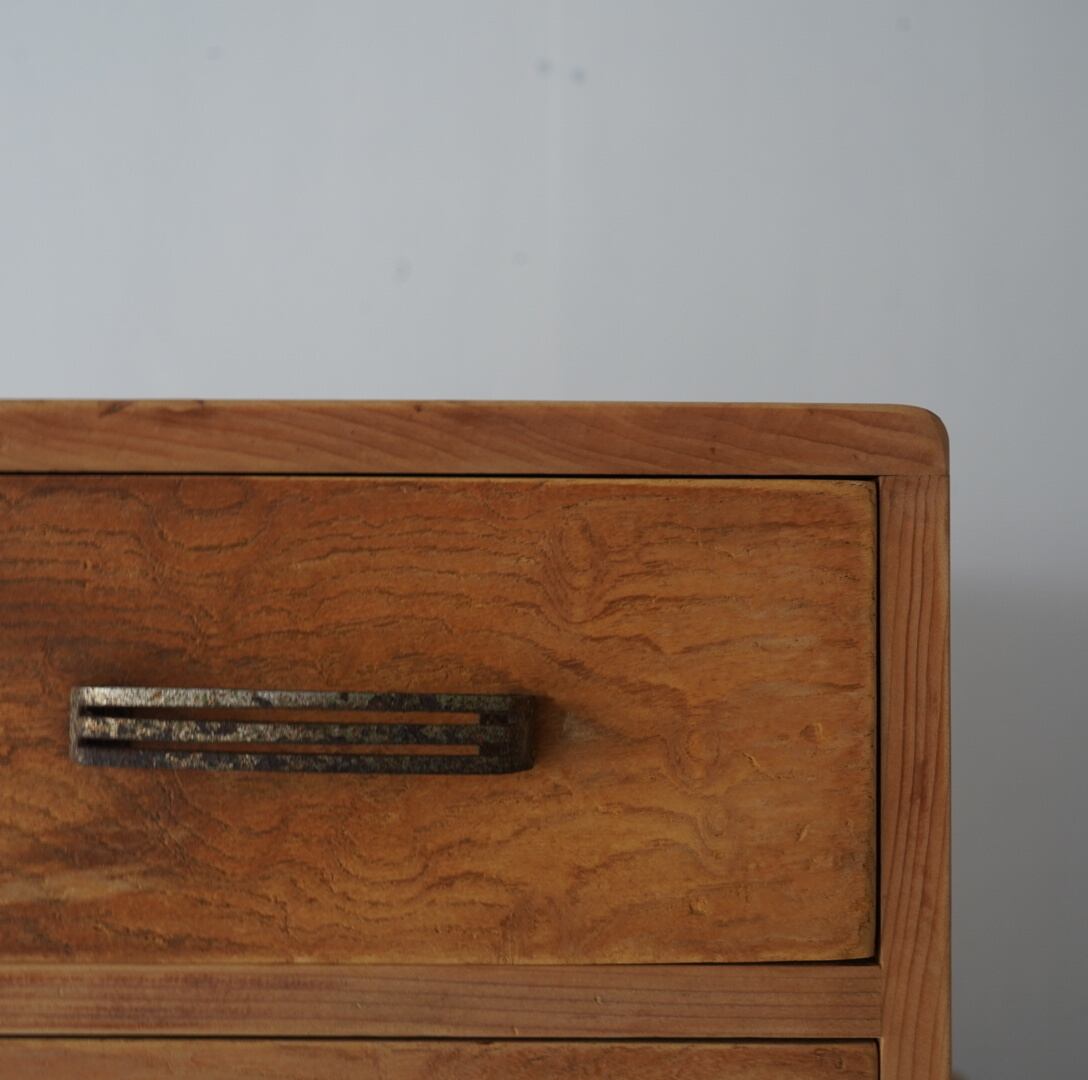 無垢の素朴な風合いと古い金属の取手が可愛らしい2杯の引き出し。