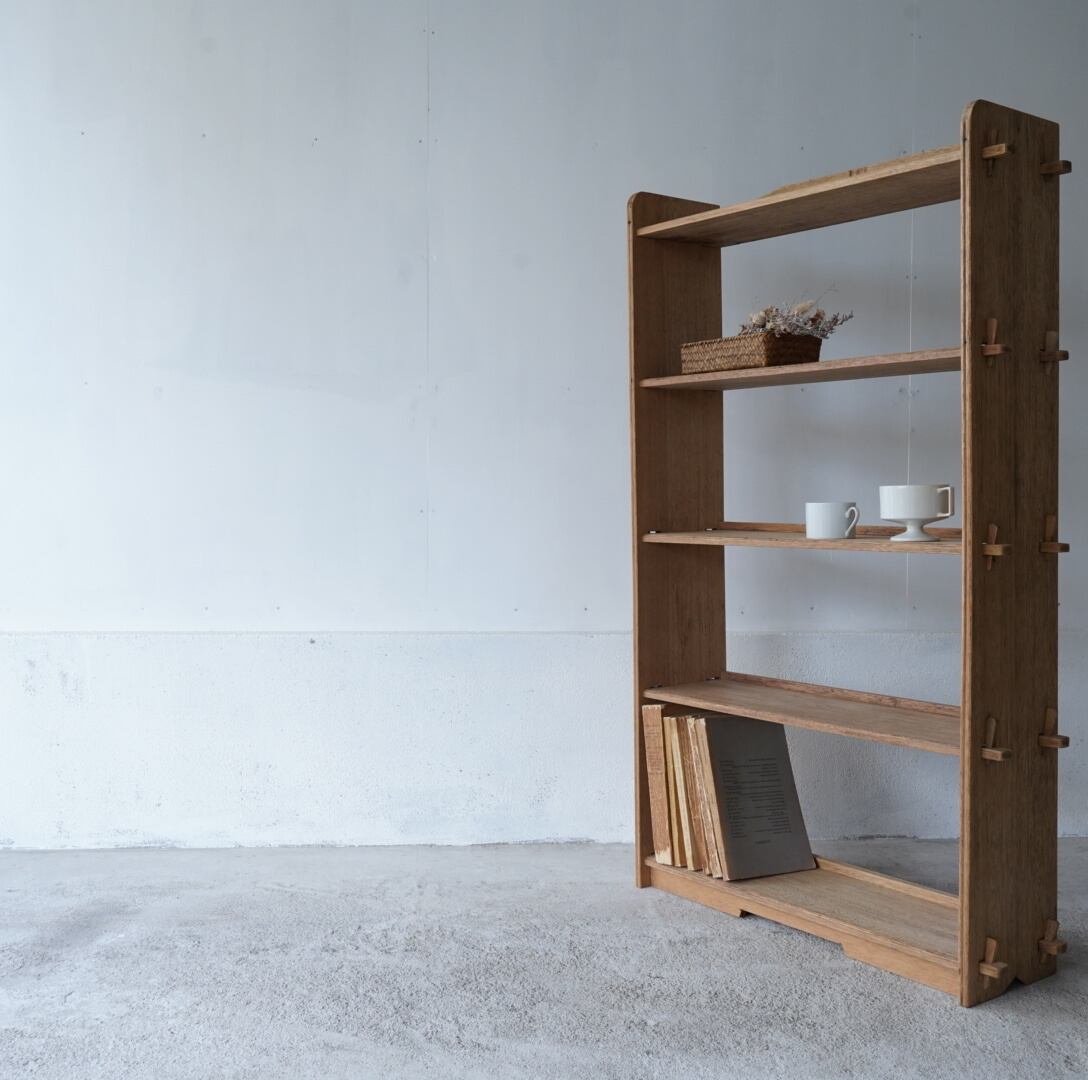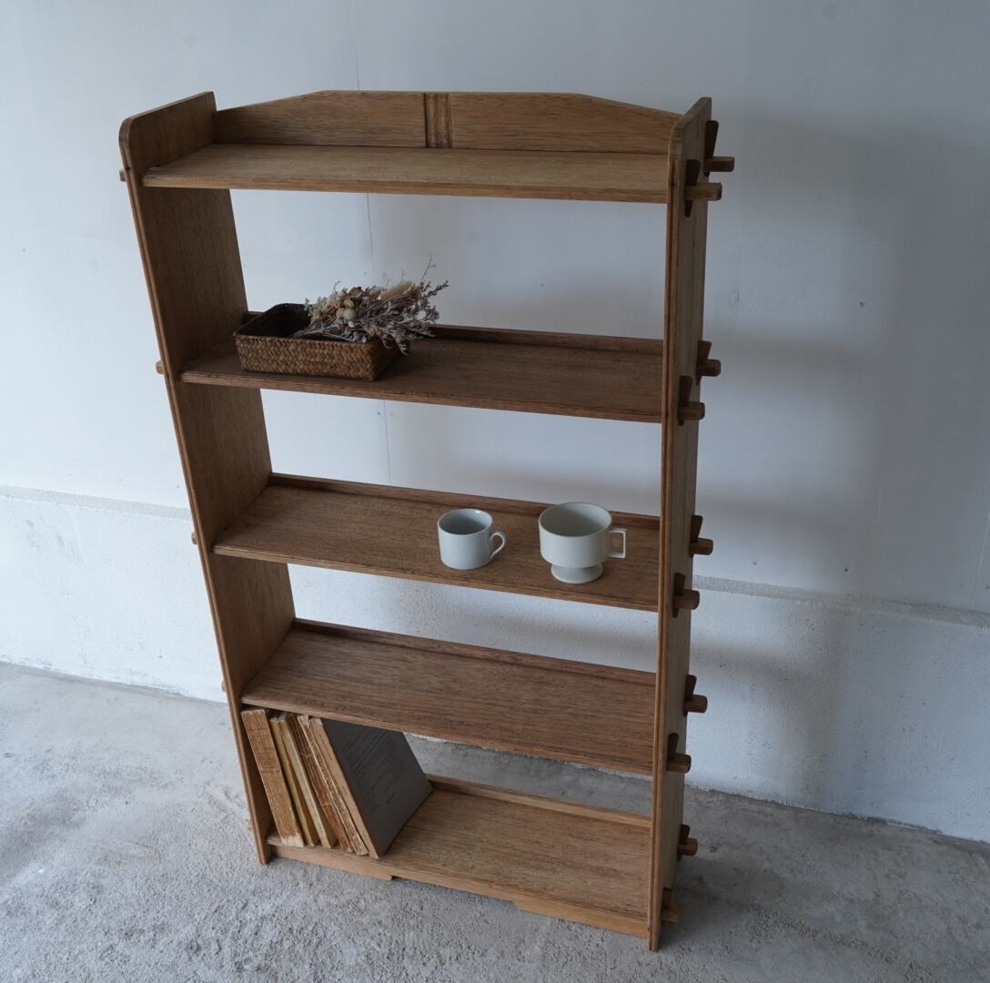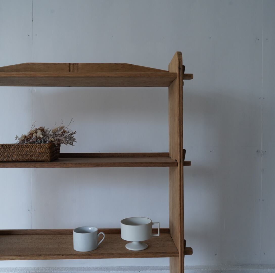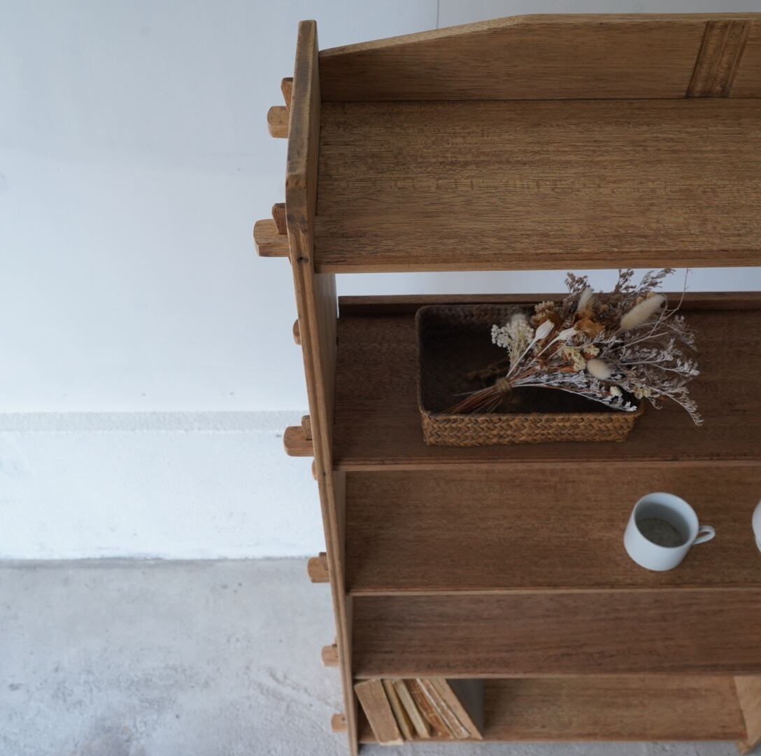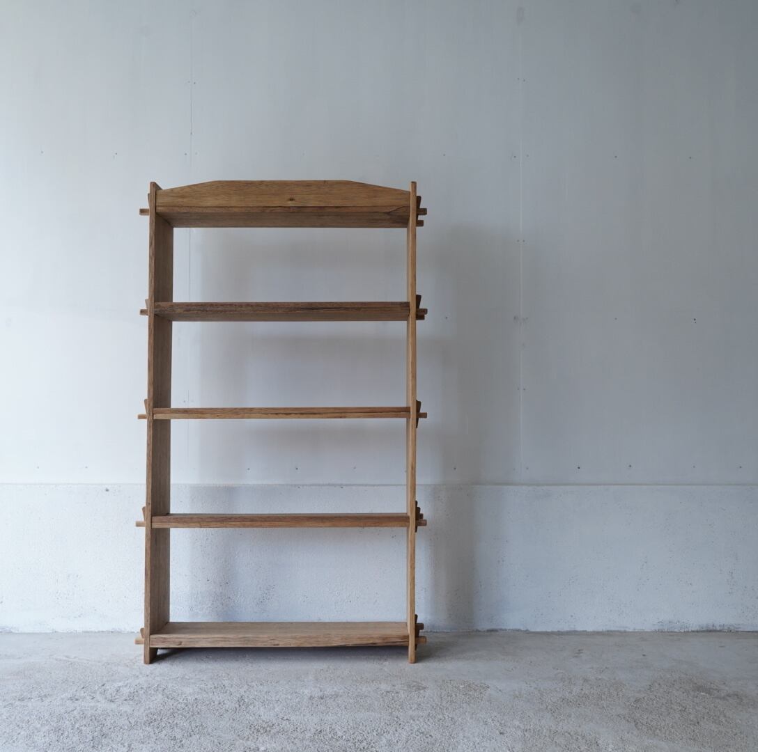 古い無垢材の素朴な風合いとすっきりとした佇まいが美しい5段のオープンラック。