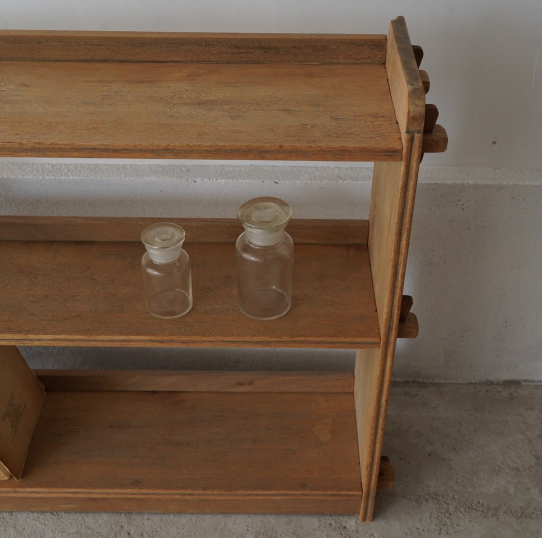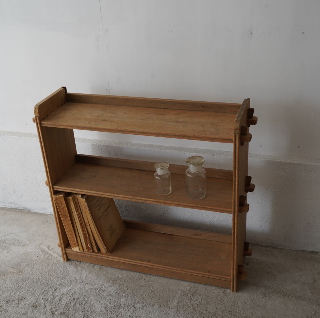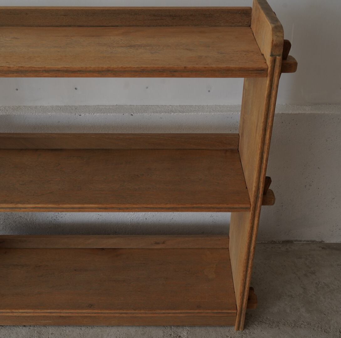古い無垢材の素朴な風合いとすっきりとしたシルエットが美しい3段のオープンラック。