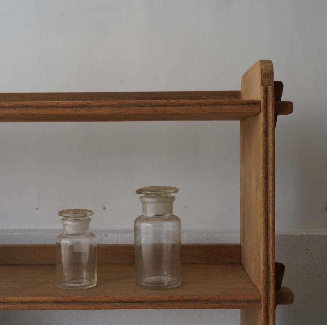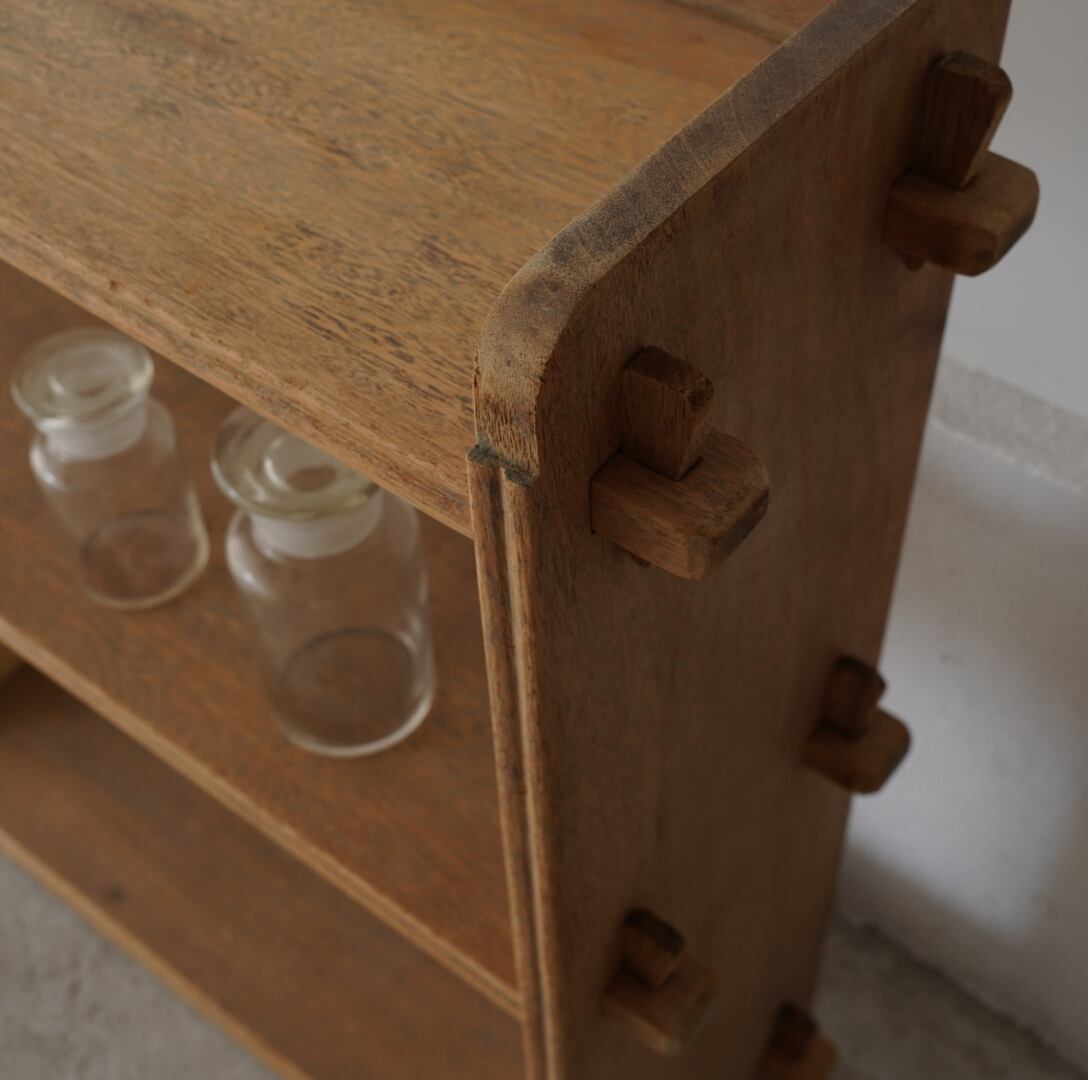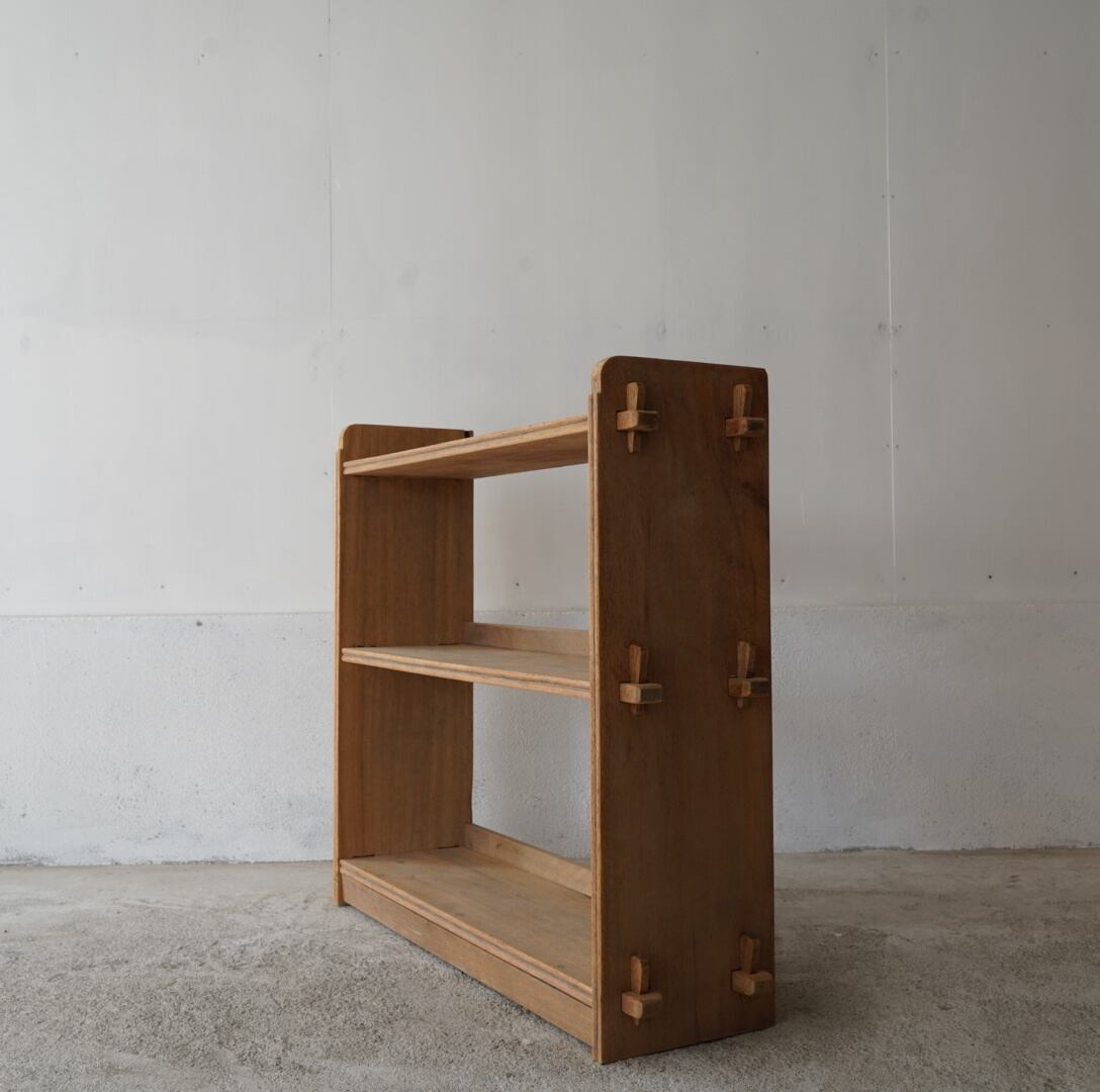 古い無垢材の素朴な風合いとすっきりとしたシルエットが美しい3段のオープンラック。