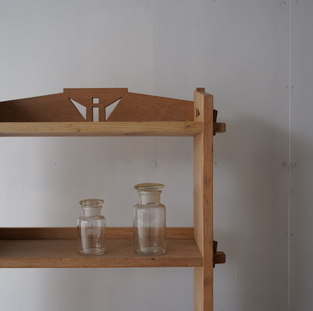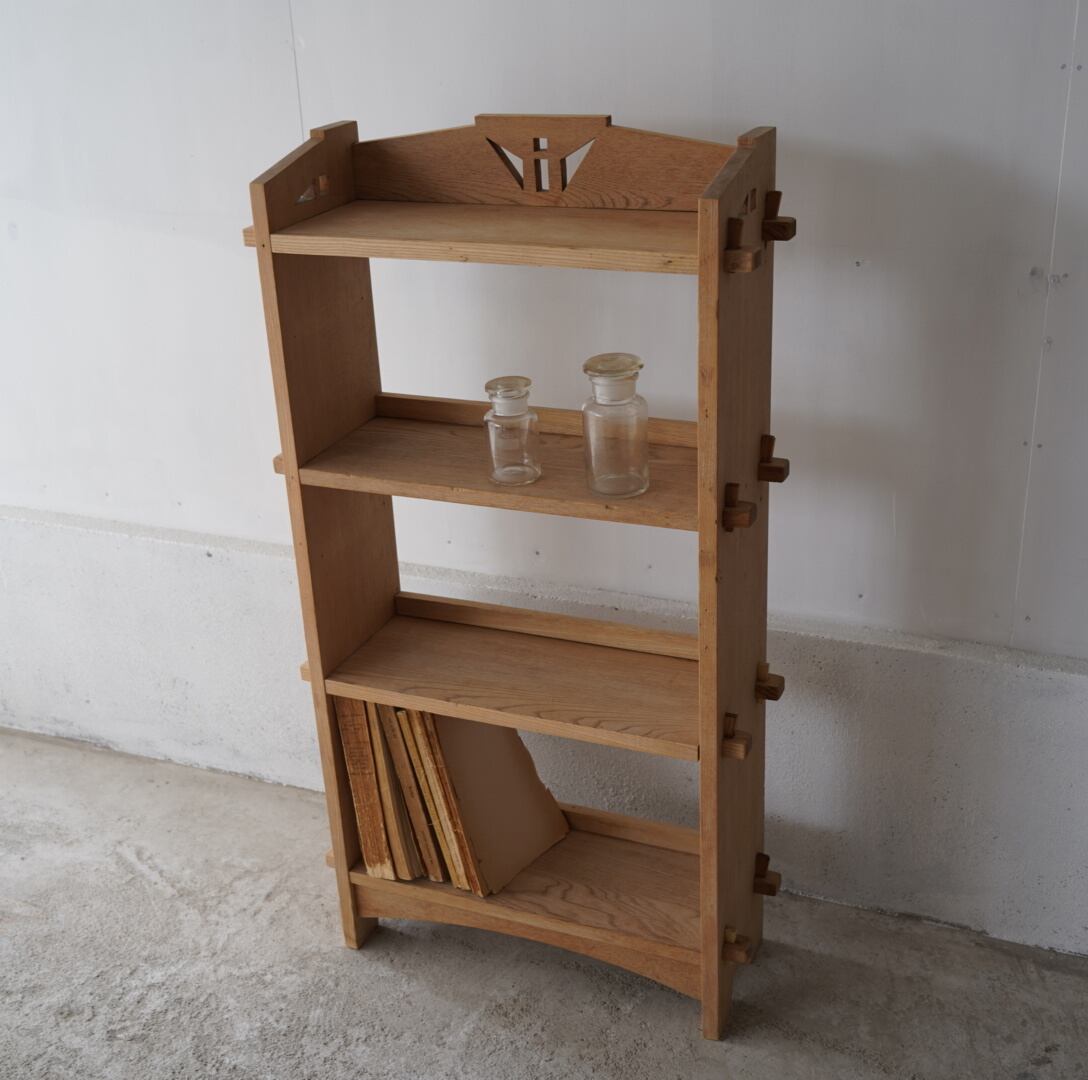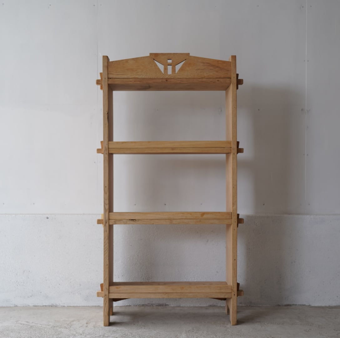 無垢材のナチュラルな木味と上部の透かし彫りの装飾が美しい4段のオープンラック。
