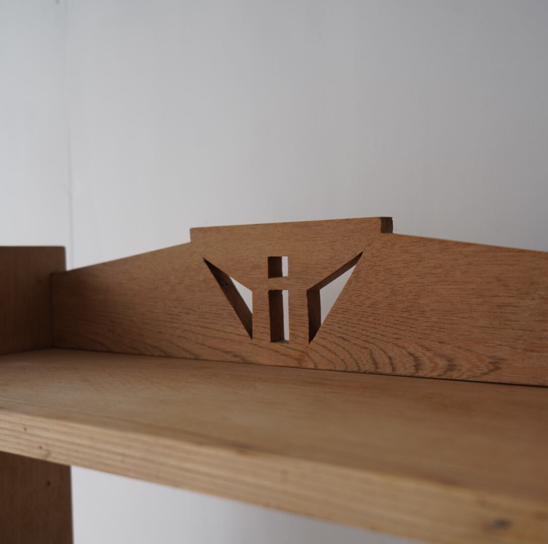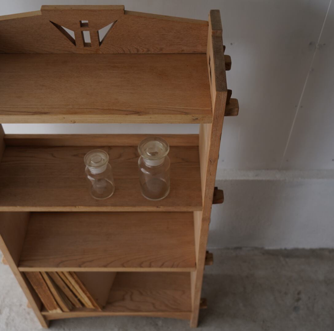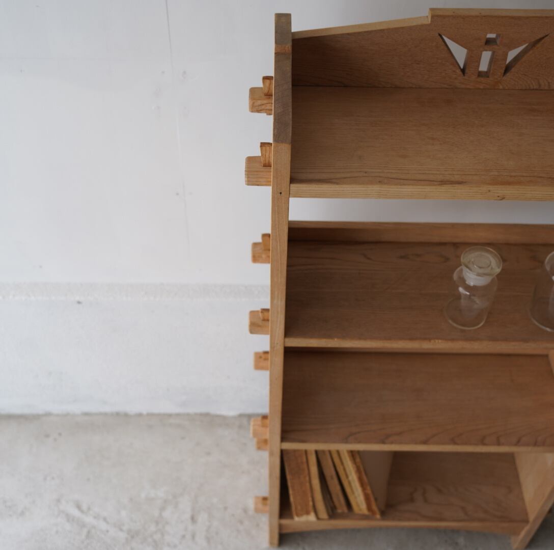 無垢材のナチュラルな木味と上部の透かし彫りの装飾が美しい4段のオープンラック。