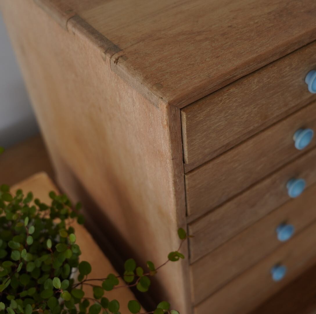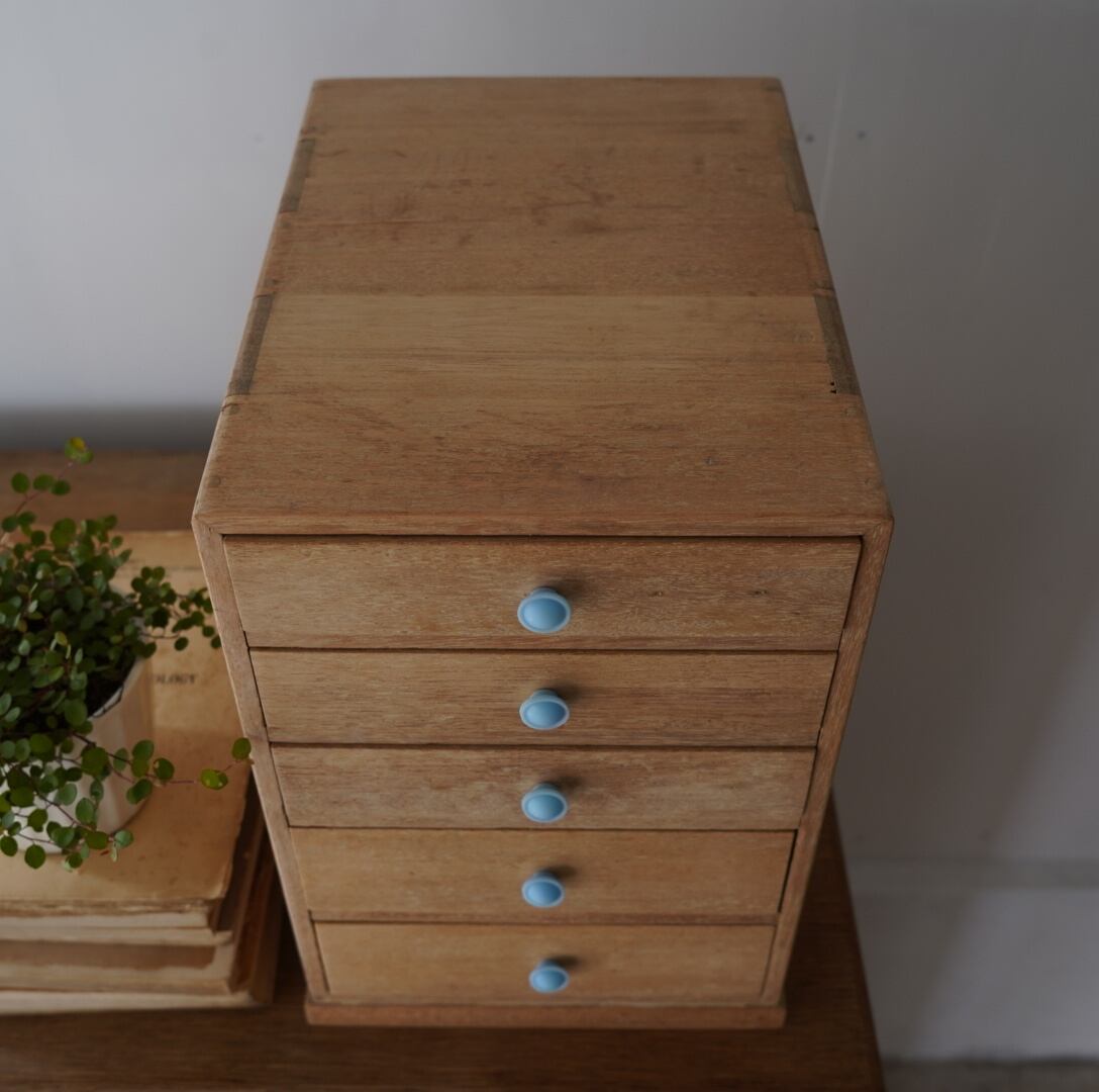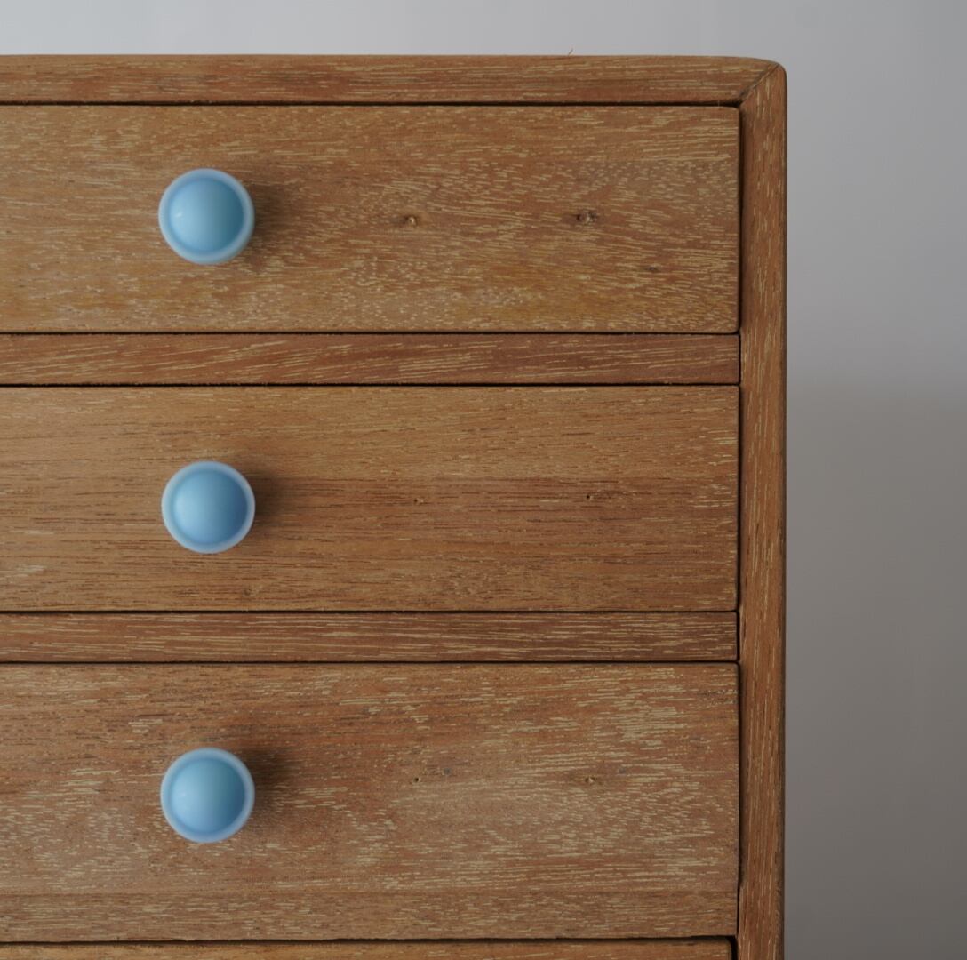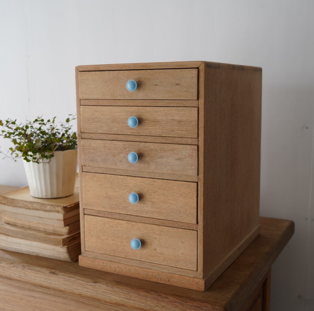 無垢材のナチュラルな木味とちいさな水色のつまみが可愛らしい5杯の引き出し。