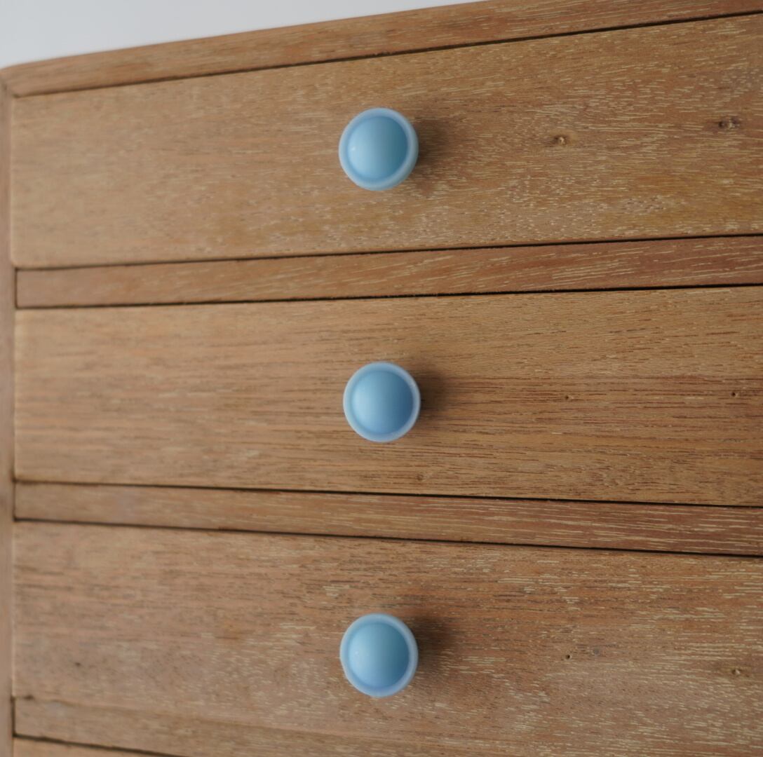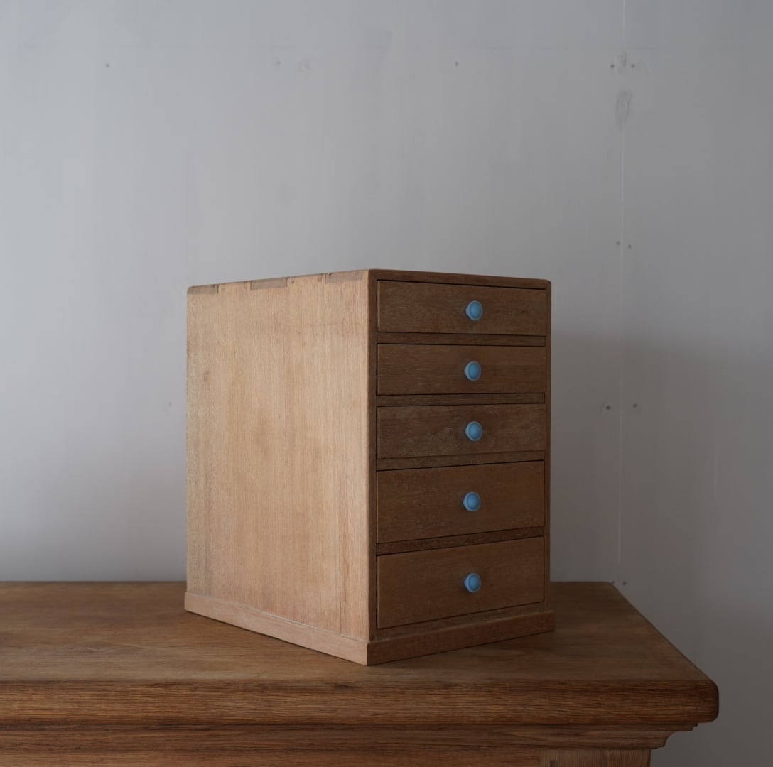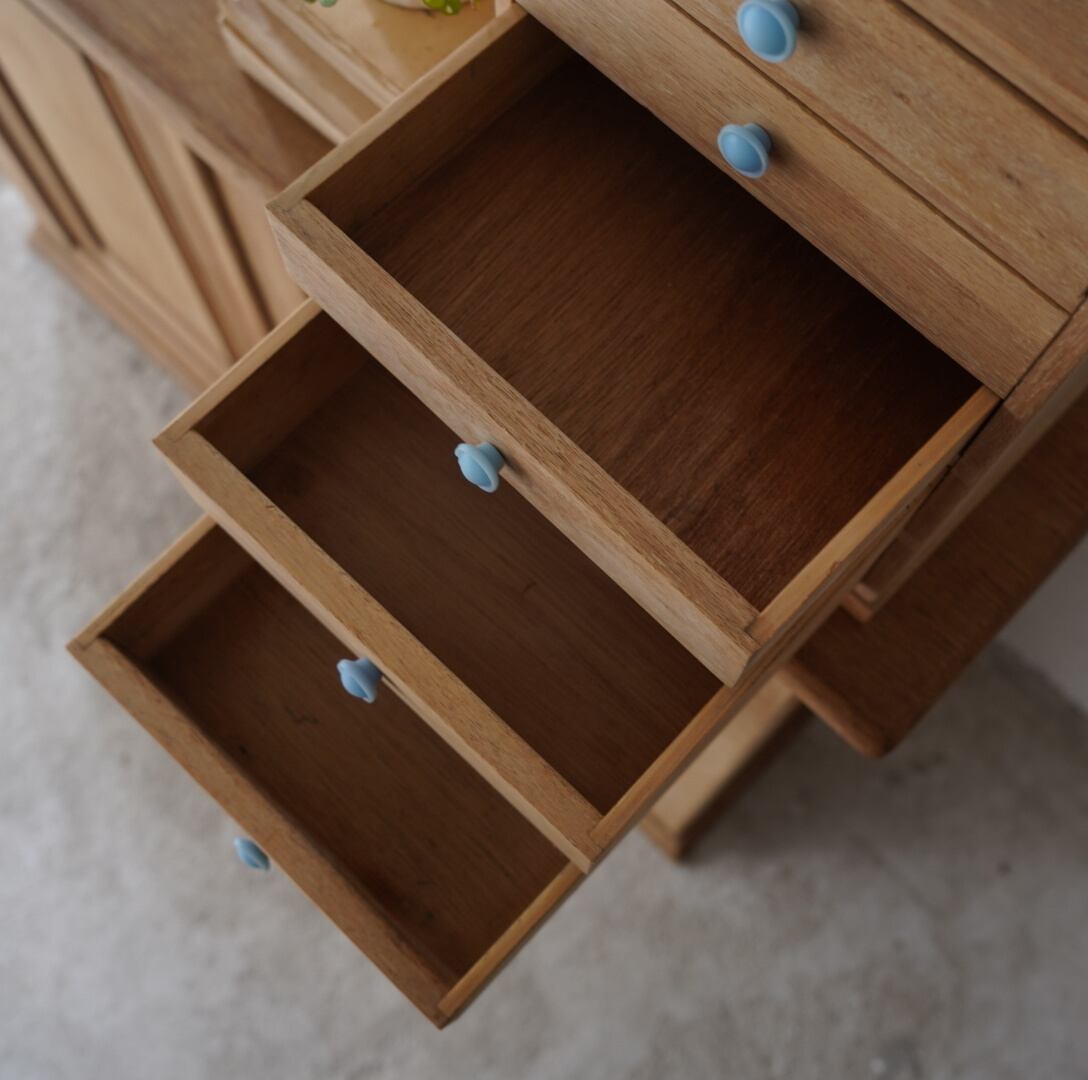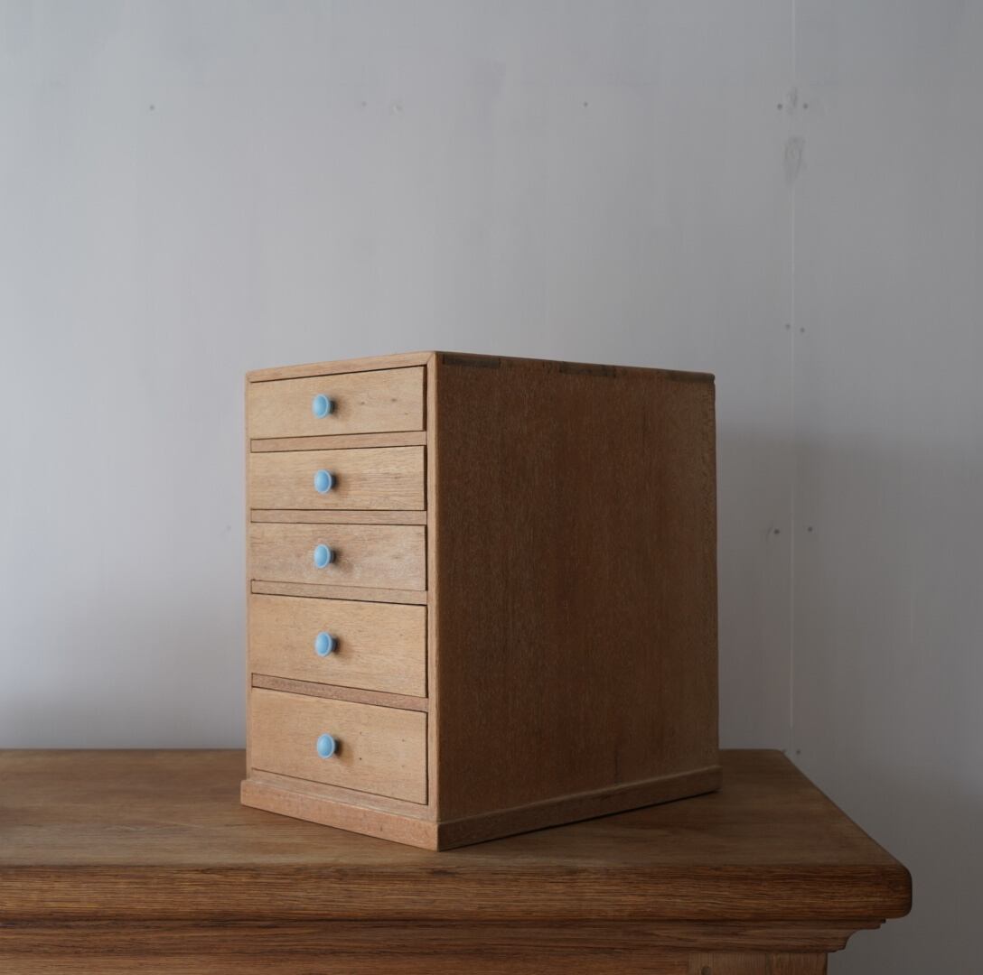 無垢材のナチュラルな木味とちいさな水色のつまみが可愛らしい5杯の引き出し。