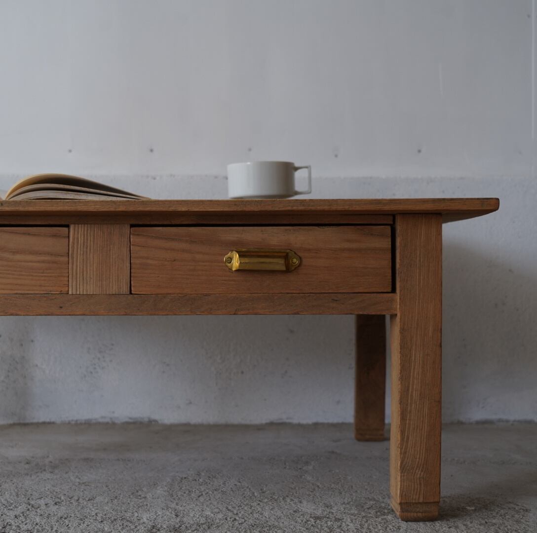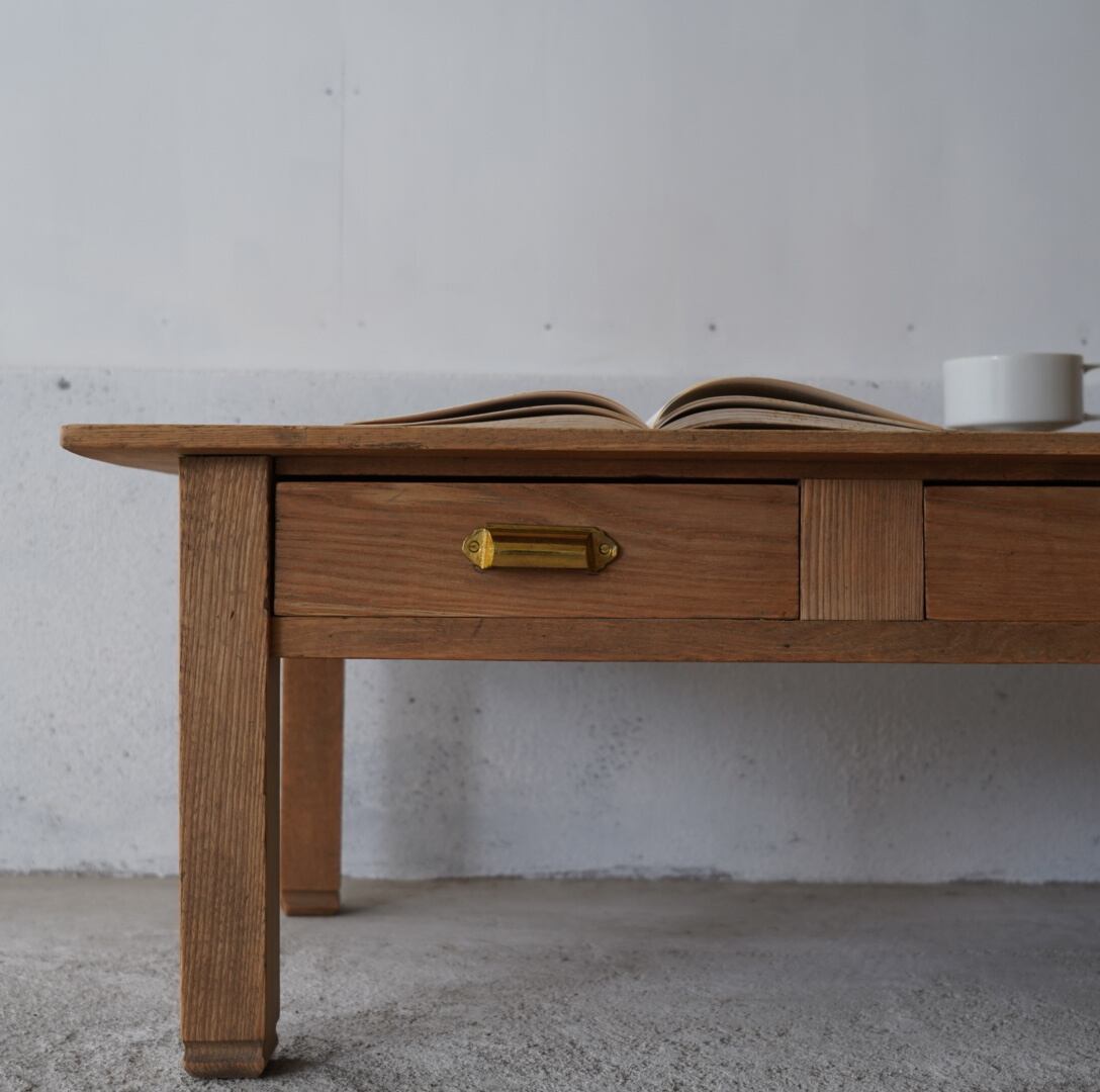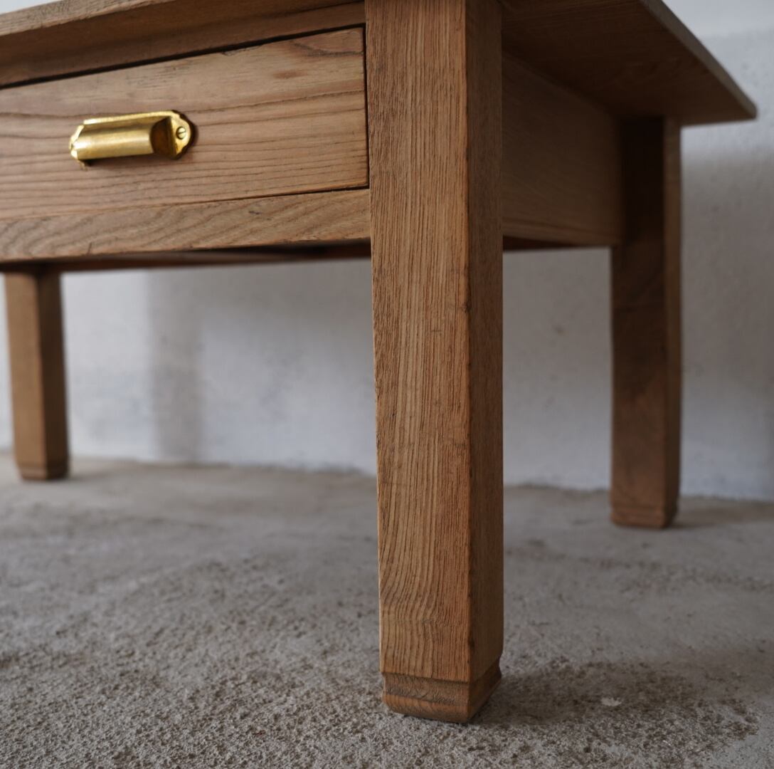 無垢材のナチュラルな木味と真鍮取手の引き出しが魅力的なコーヒーテーブル。