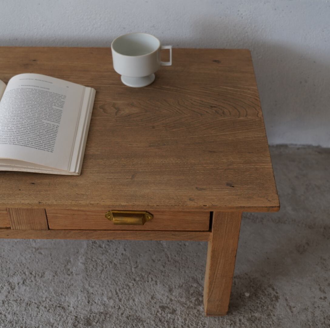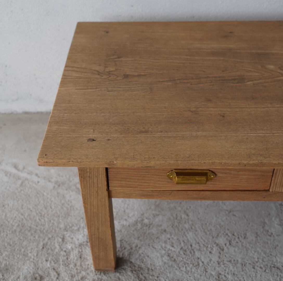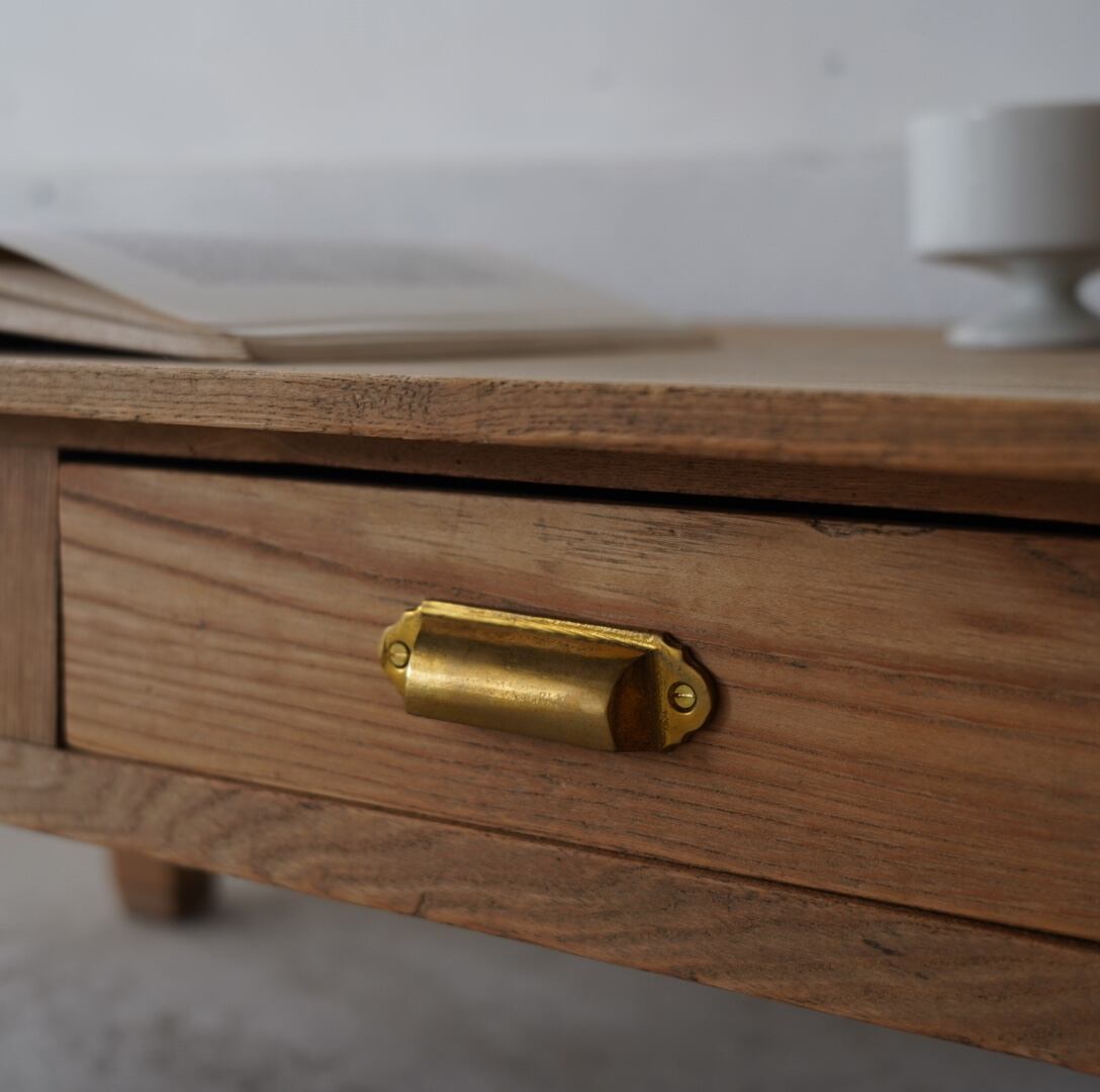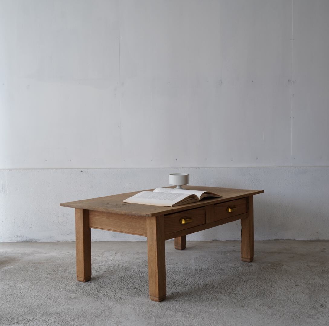 無垢材のナチュラルな木味と真鍮取手の引き出しが魅力的なコーヒーテーブル。