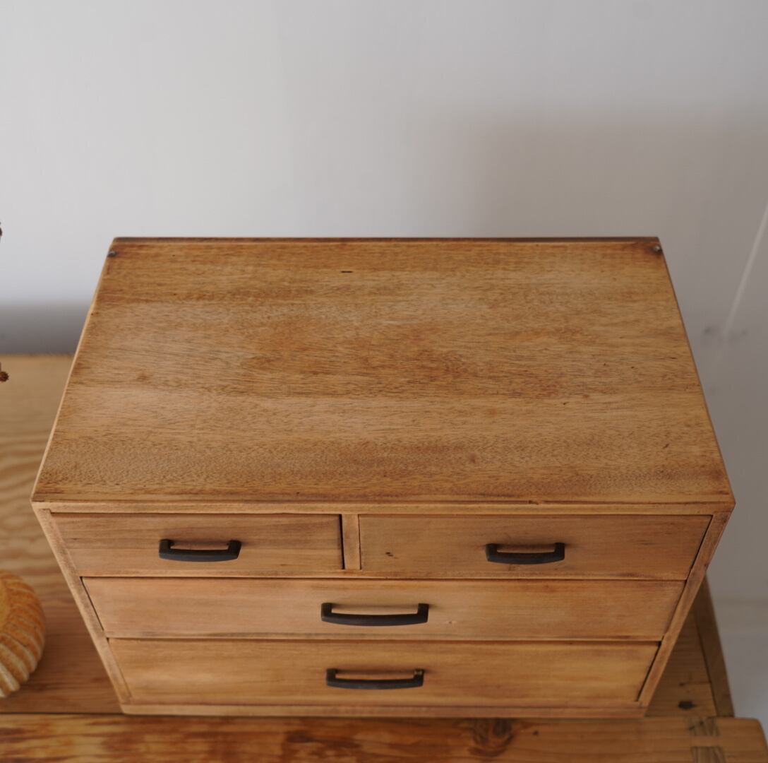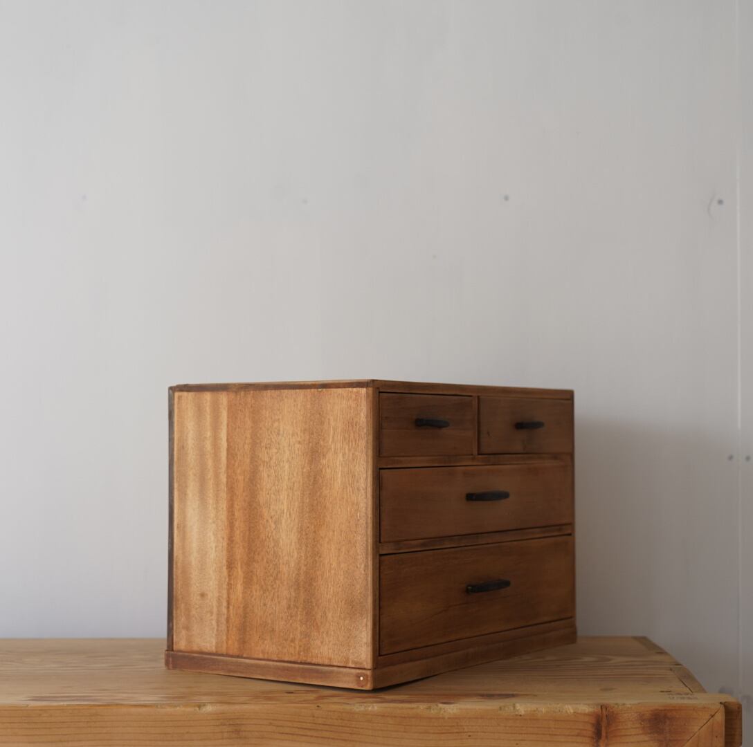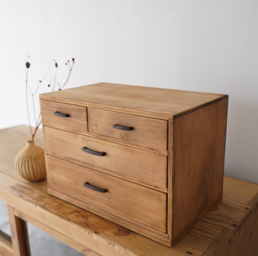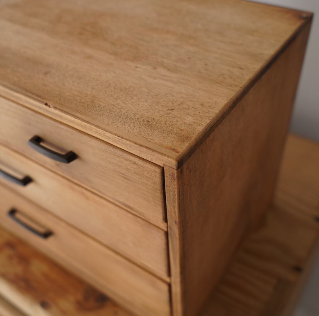 無垢材の温かみのある木味とひかえめな黒いつまみが可愛らしい4杯の引き出し。