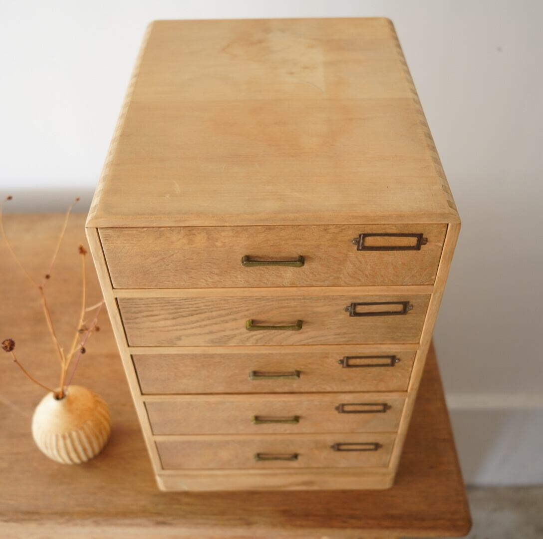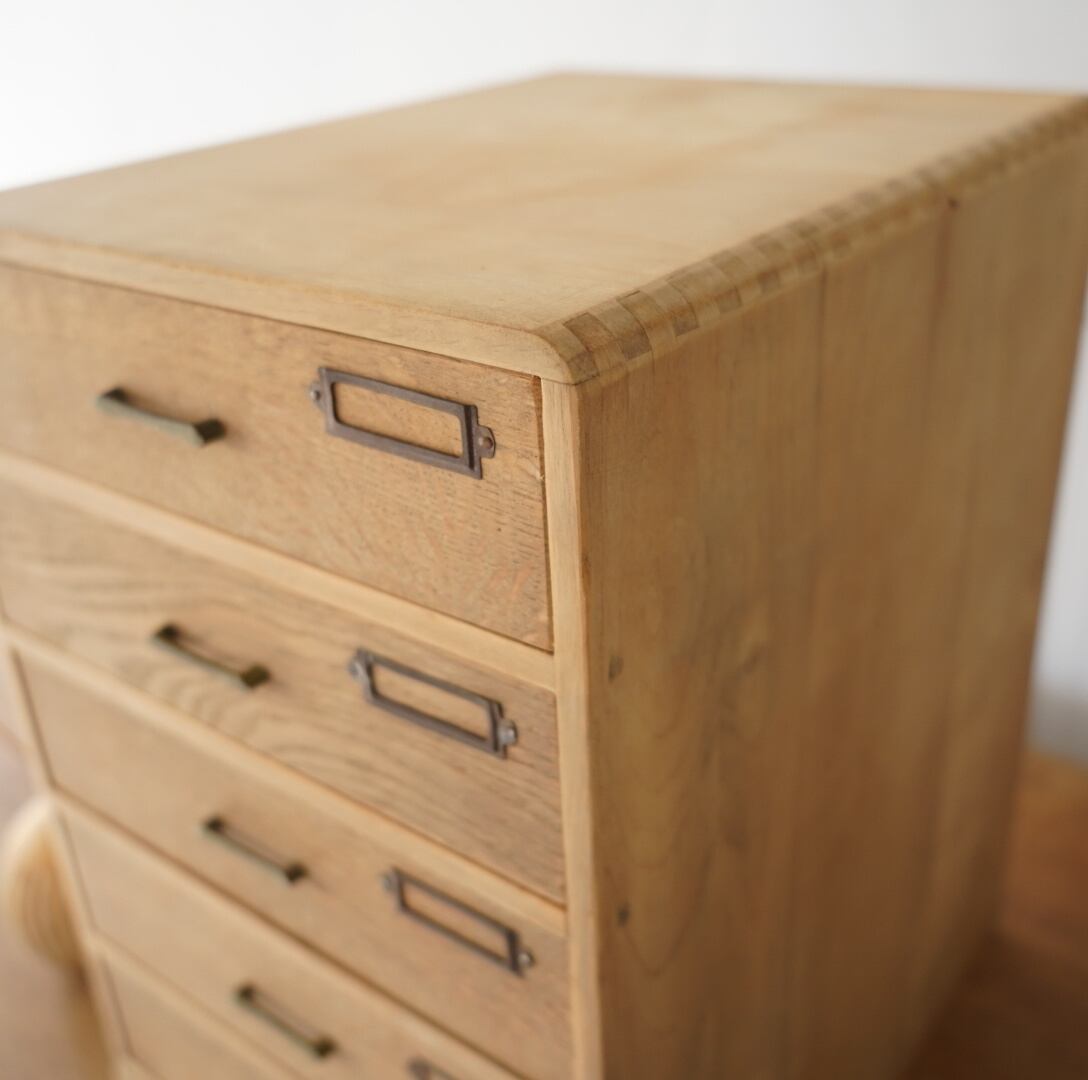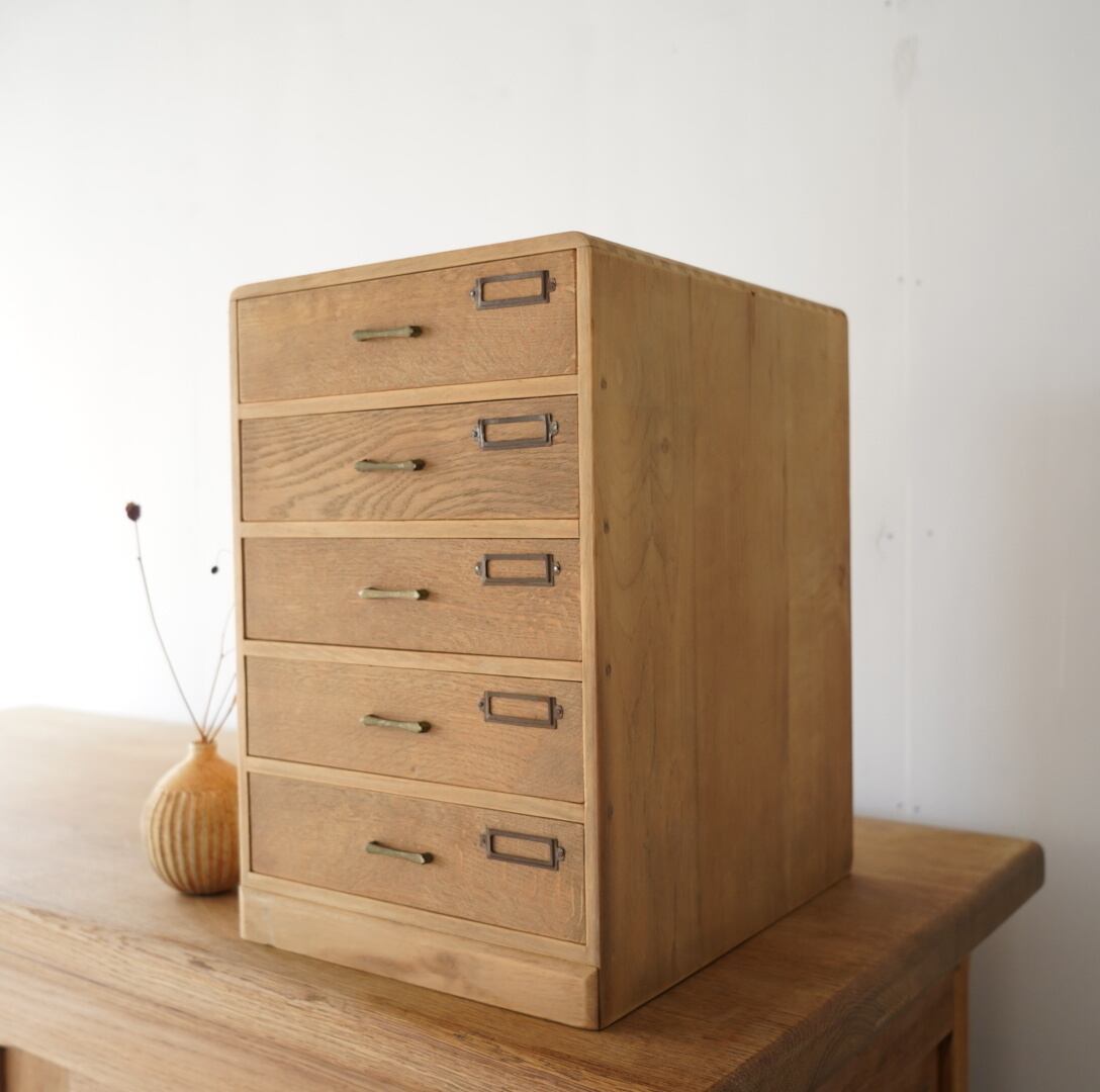 ナチュラルな木味、並んだ金属の取手とネームプレートが可愛らしい5杯の引き出し。