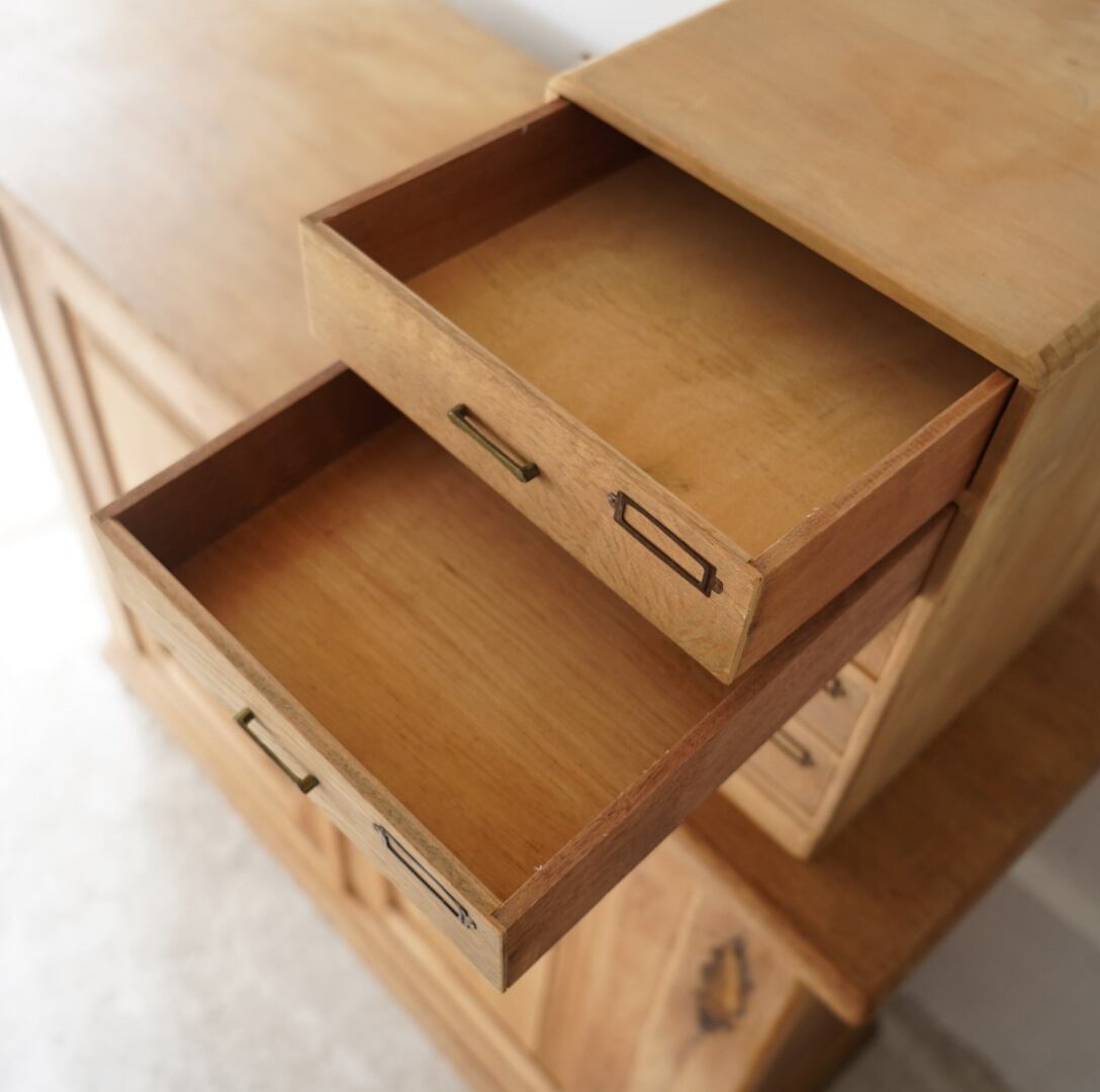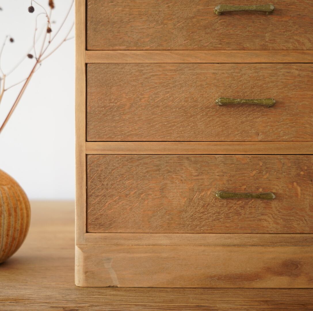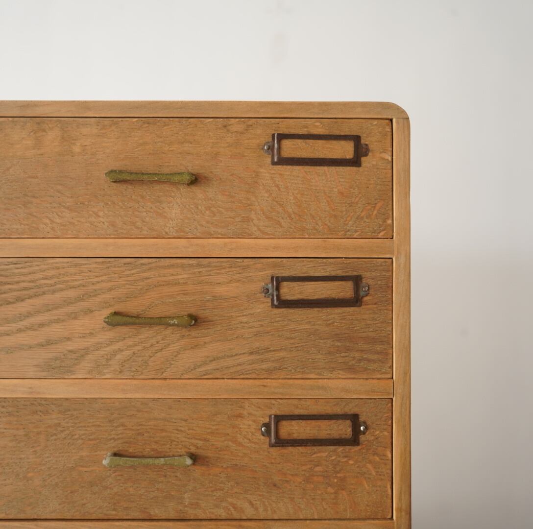 ナチュラルな木味、並んだ金属の取手とネームプレートが可愛らしい5杯の引き出し。