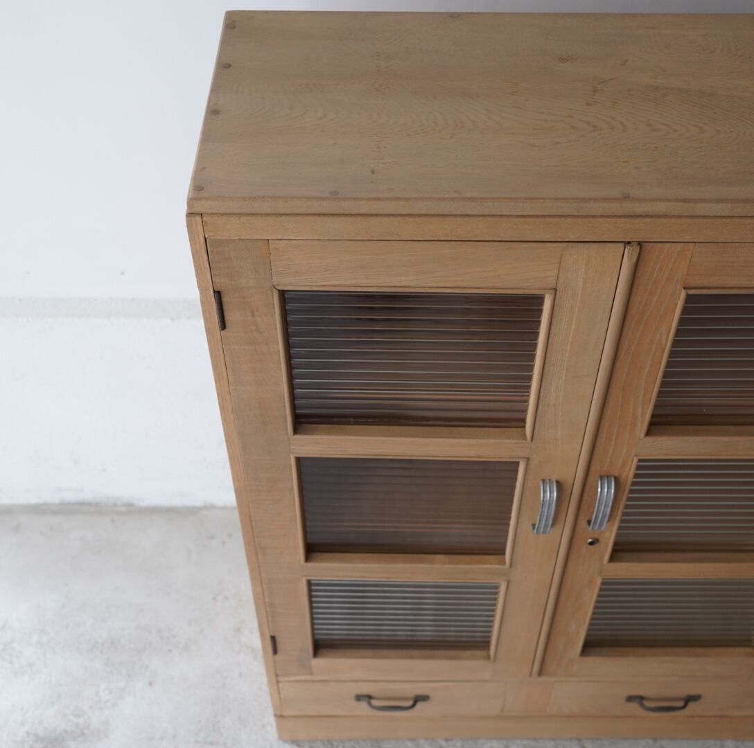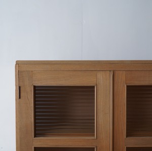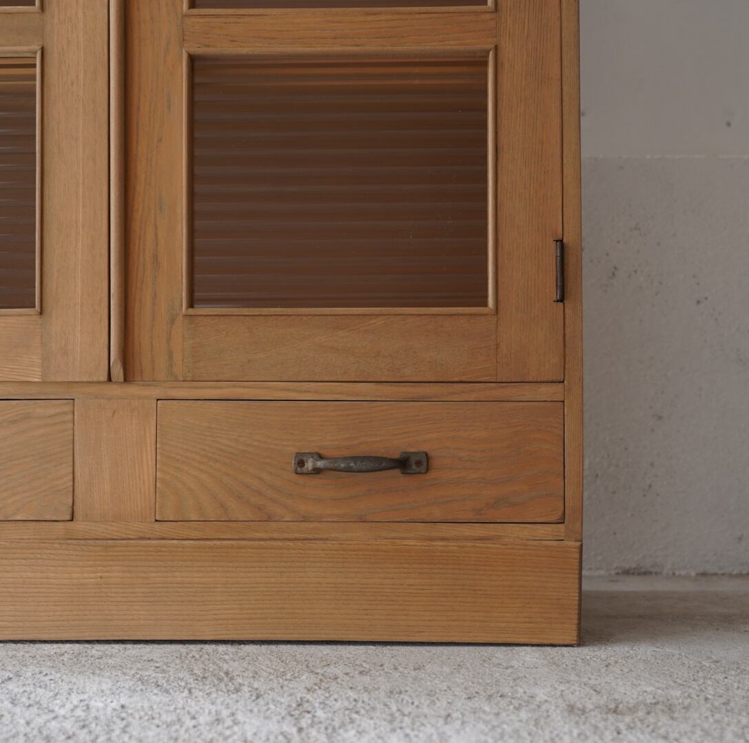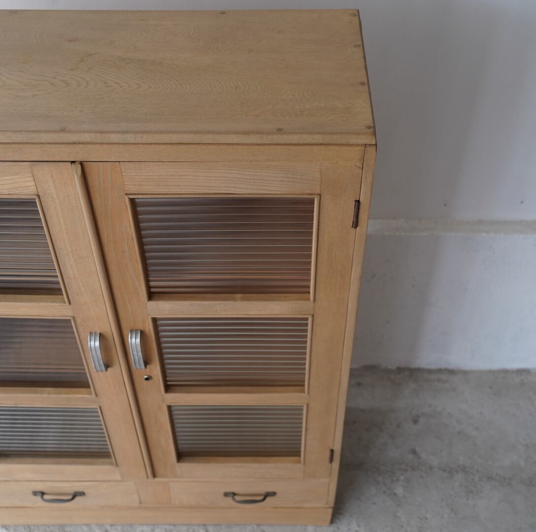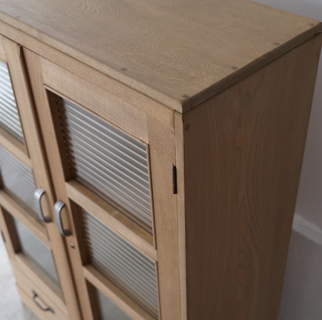 ナチュラルな木味とモールガラスの開き戸が美しいキャビネット。