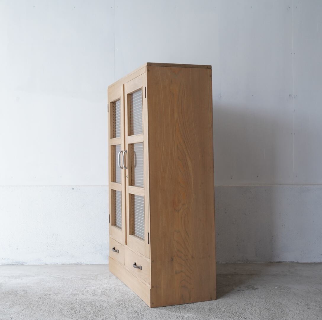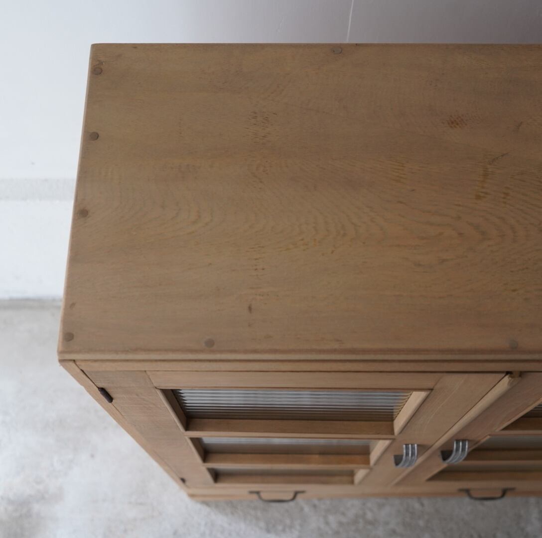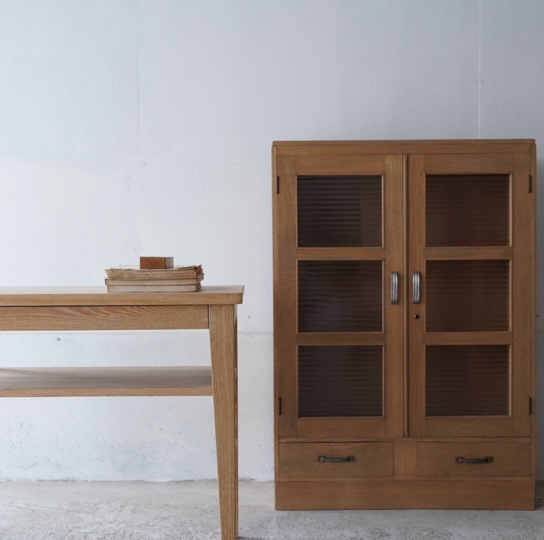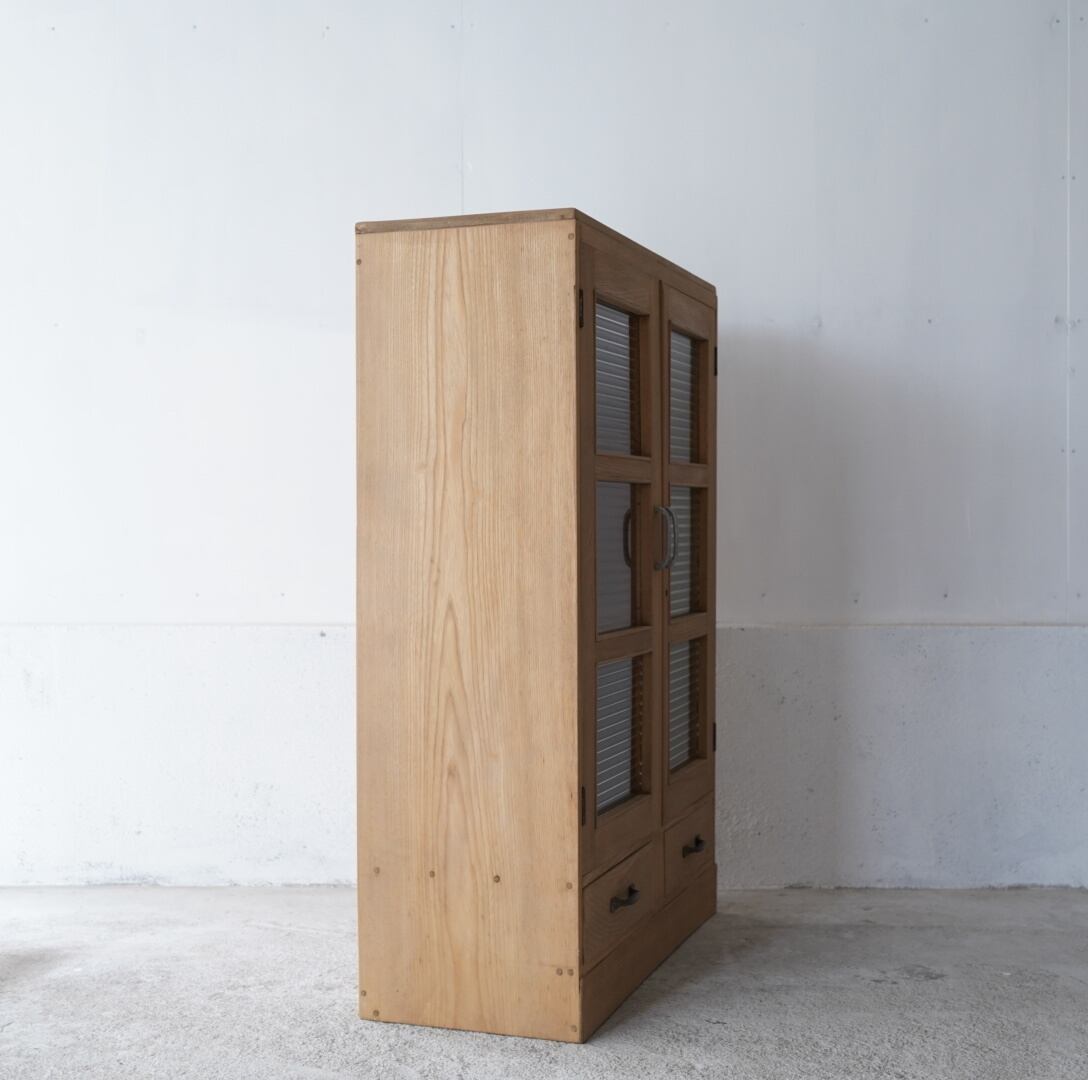 ナチュラルな木味とモールガラスの開き戸が美しいキャビネット。