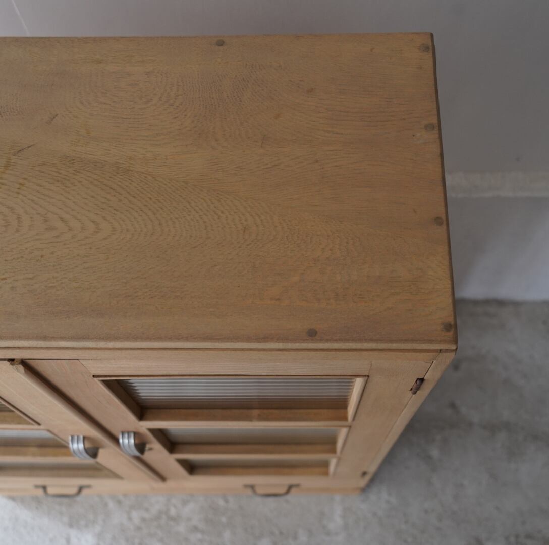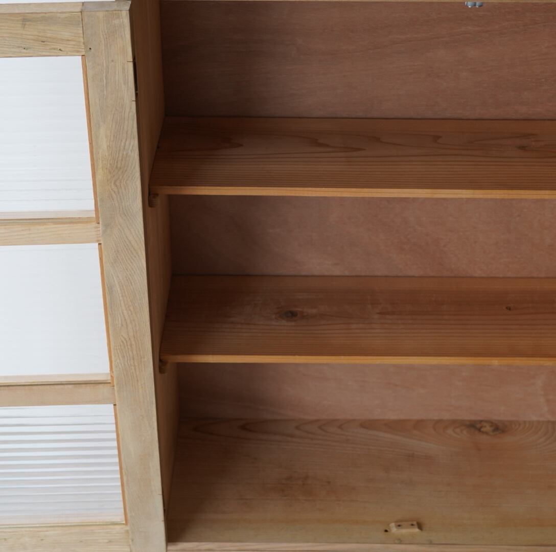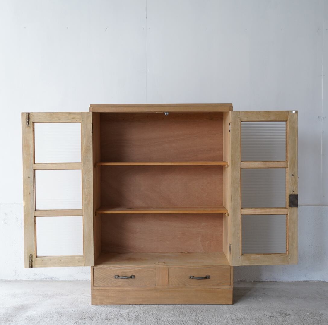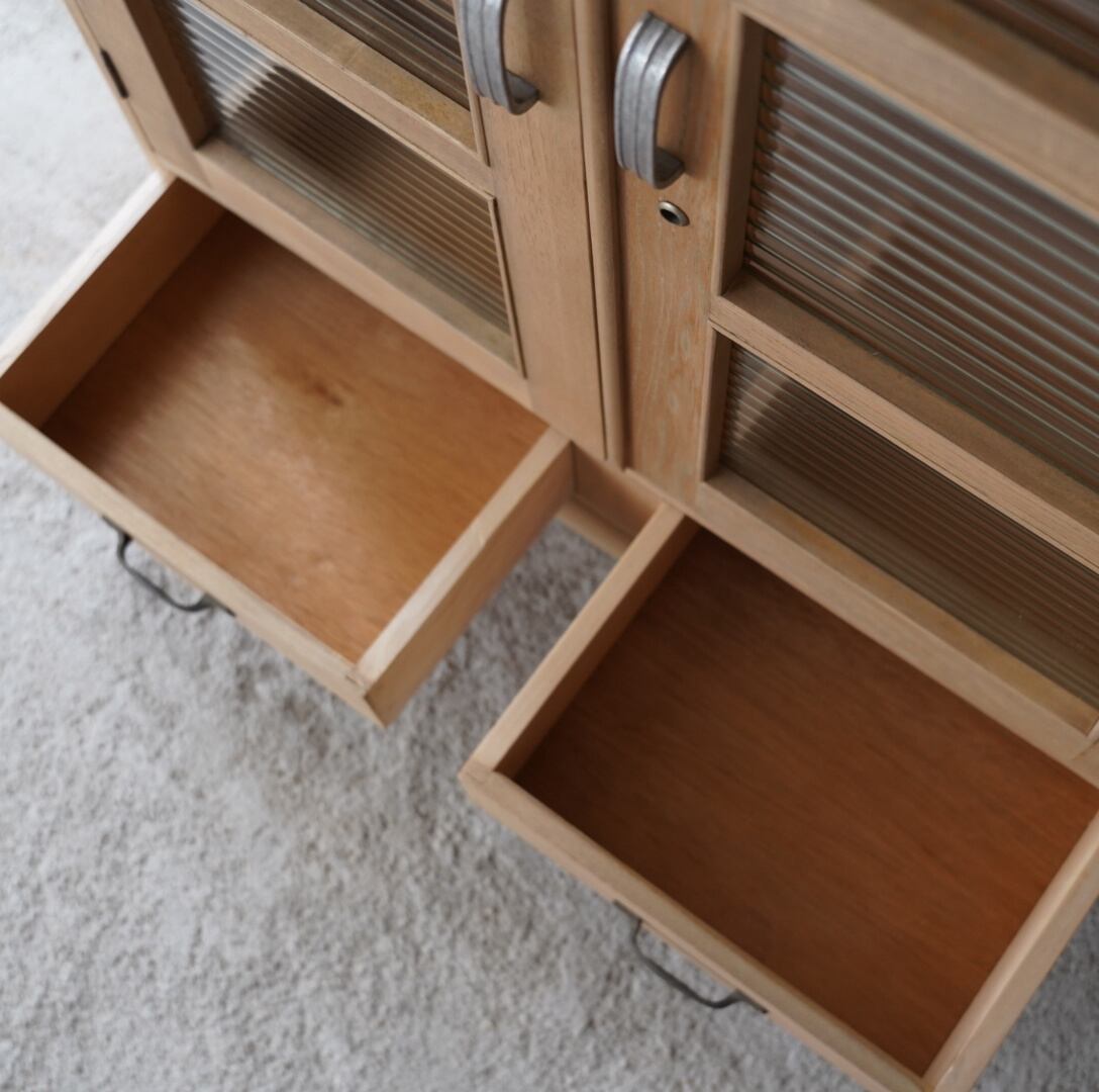 ナチュラルな木味とモールガラスの開き戸が美しいキャビネット。