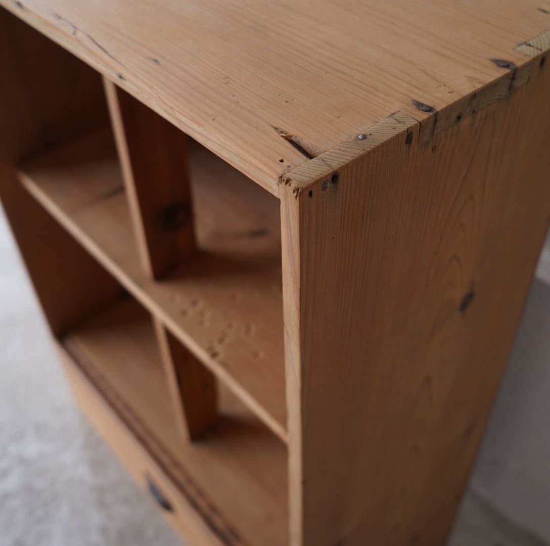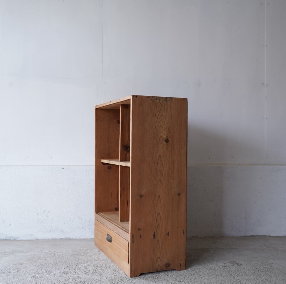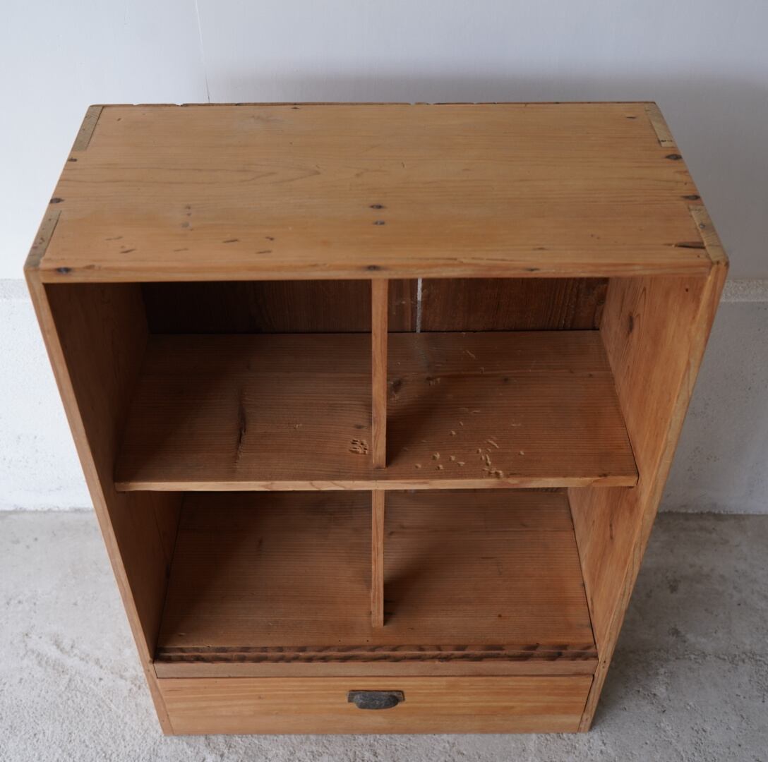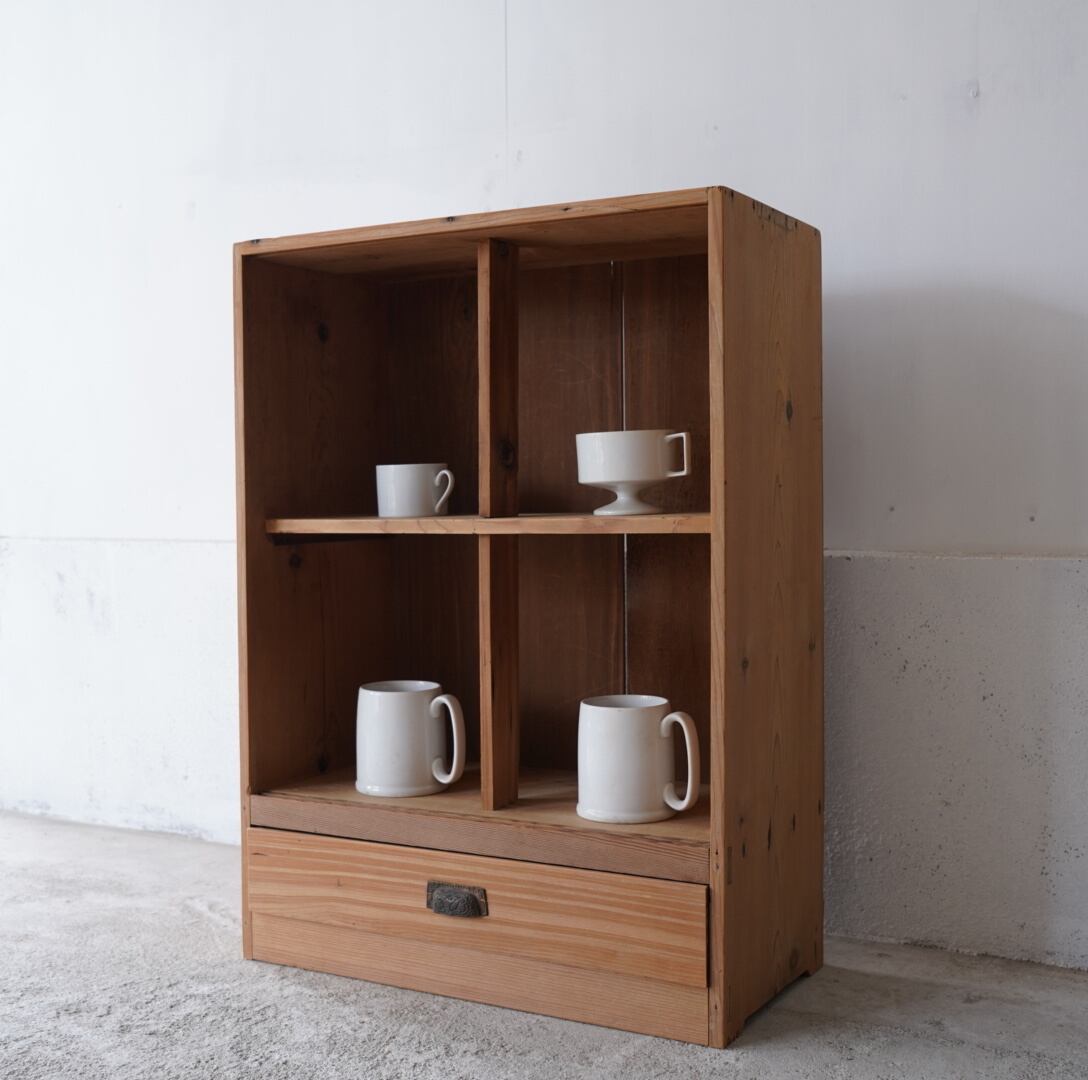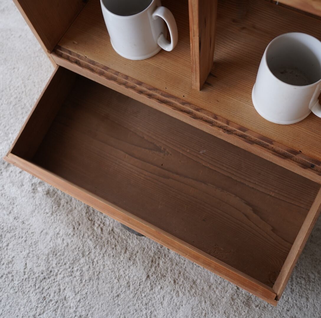 無垢材の温かみのある木味と金属取手の引き出しが魅力的な古い木製棚。
