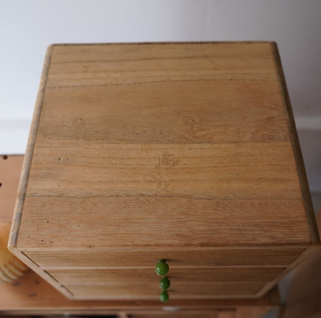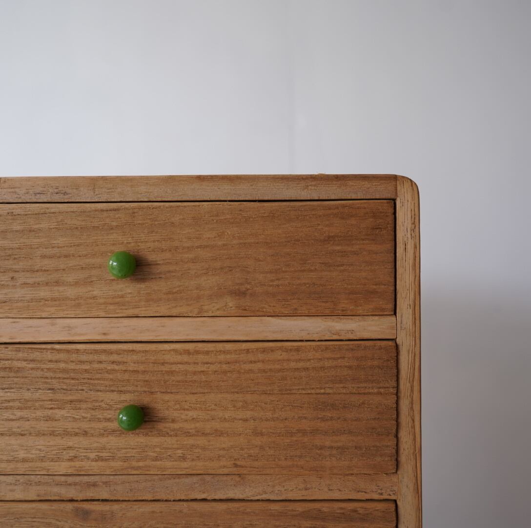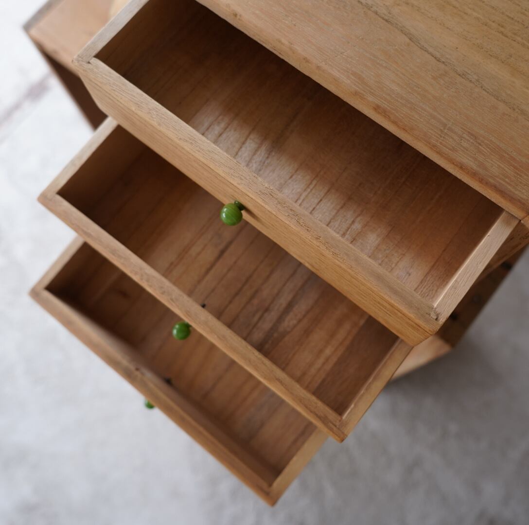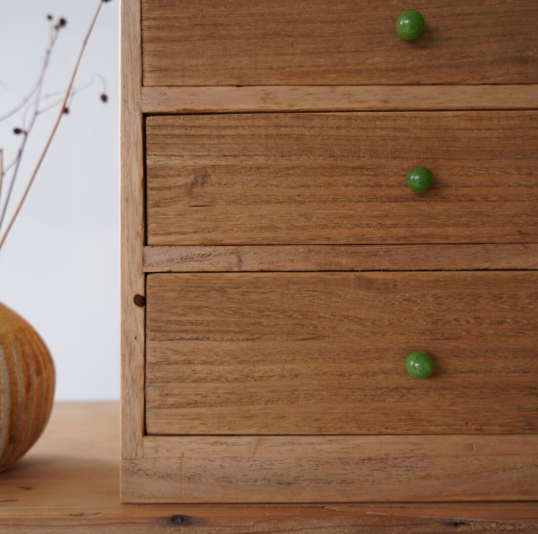 無垢材の素朴な風合いとちいさなガラスのつまみが可愛らしい3杯の引き出し。