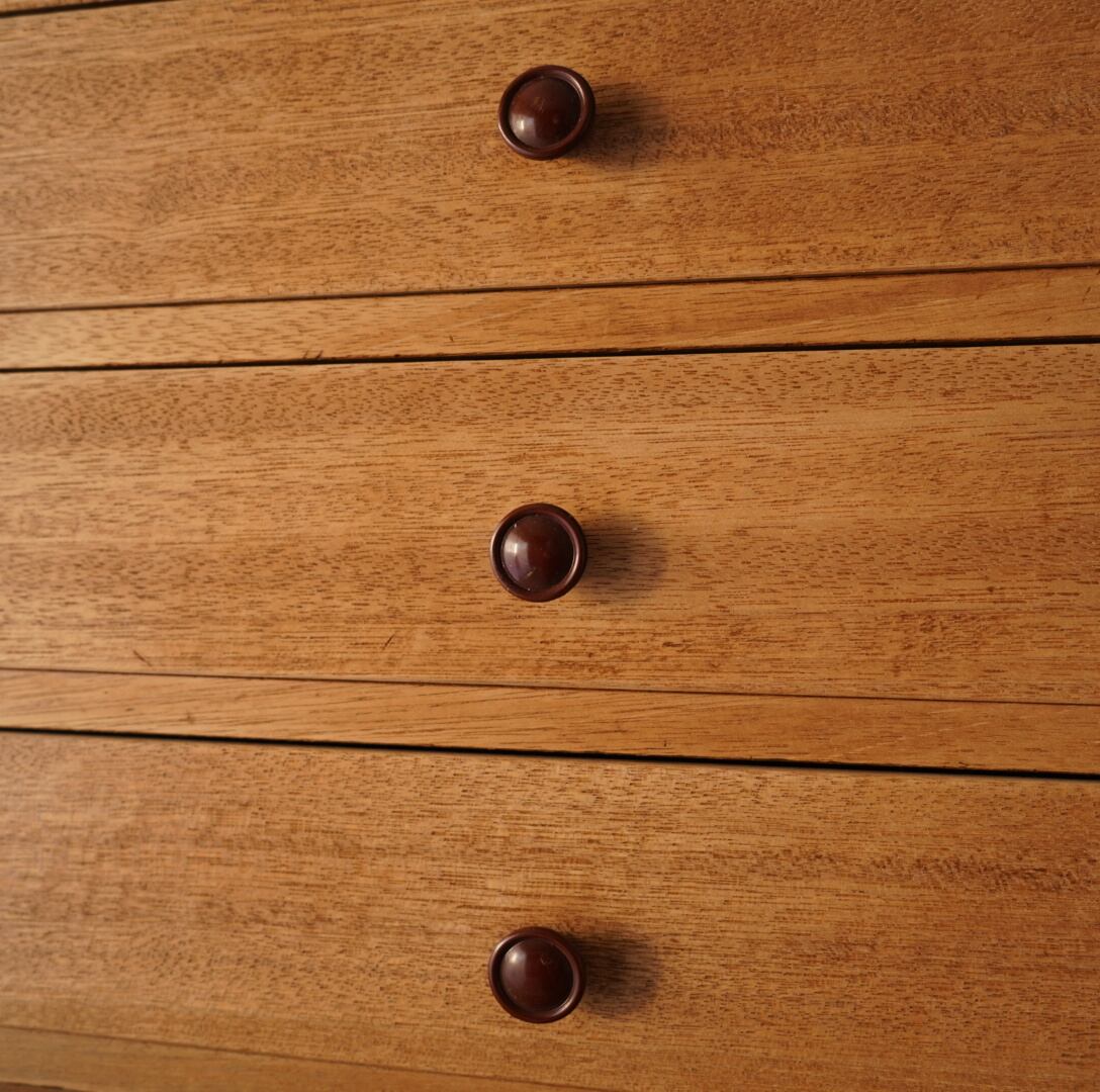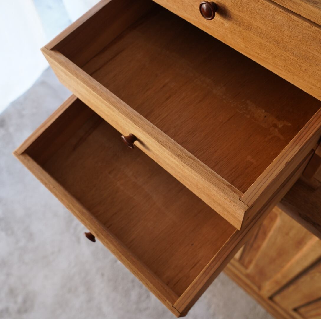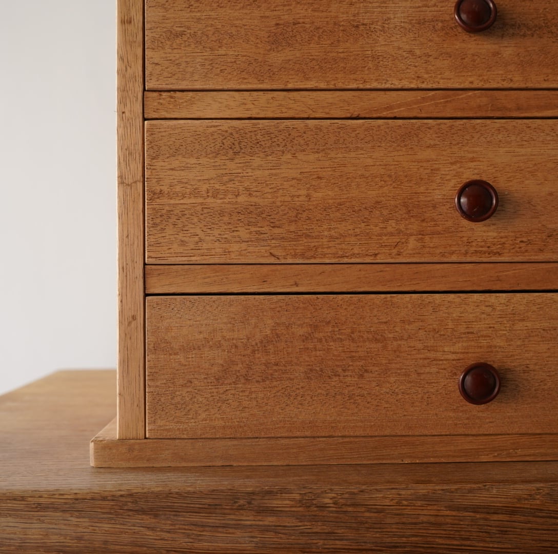ナチュラルな木味と茶色のつまみが可愛らしい3杯の引き出し。