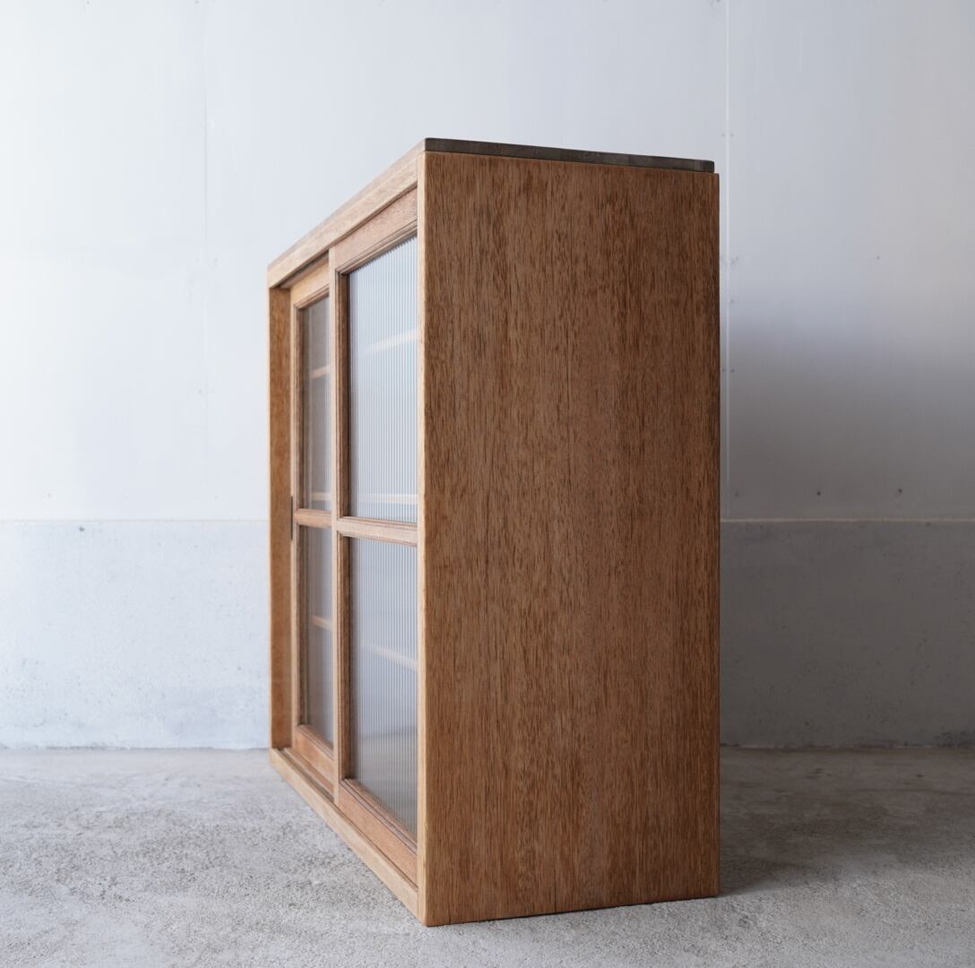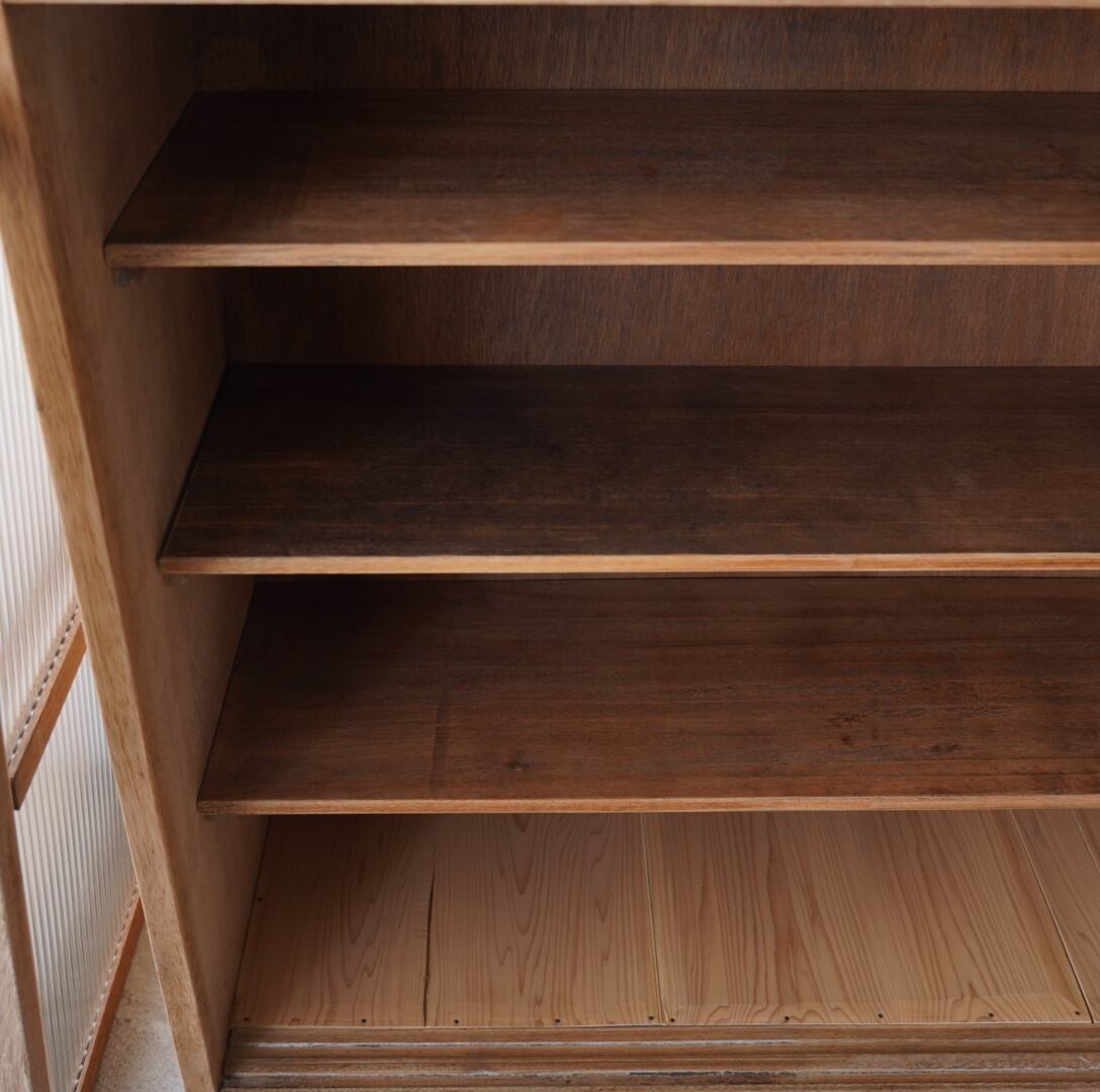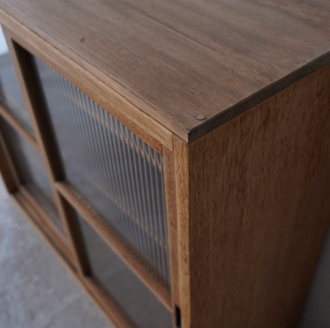 温かみのある経年変化ときらきらと光を反射するモールガラスの引き戸が美しいキャビネット。