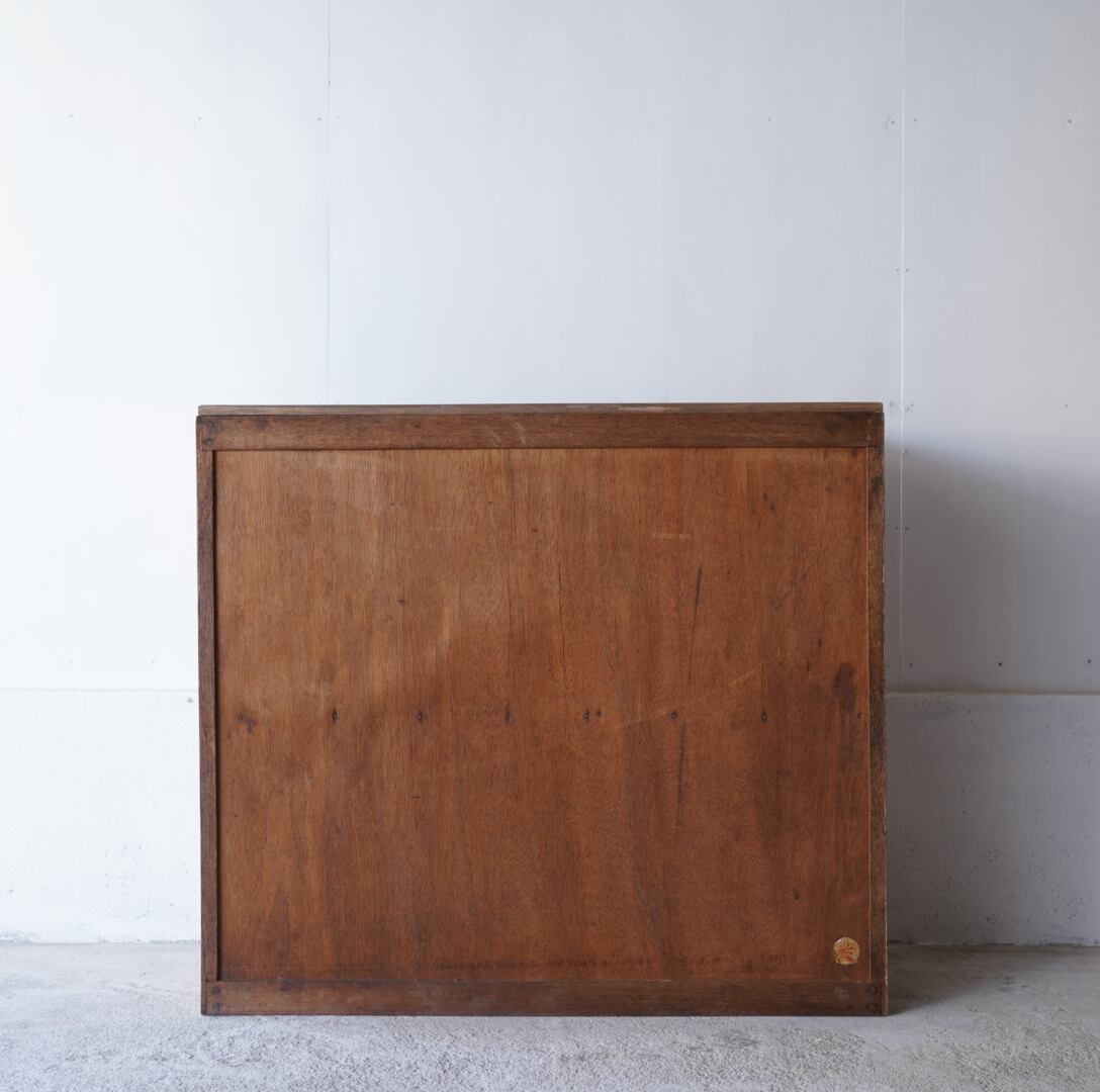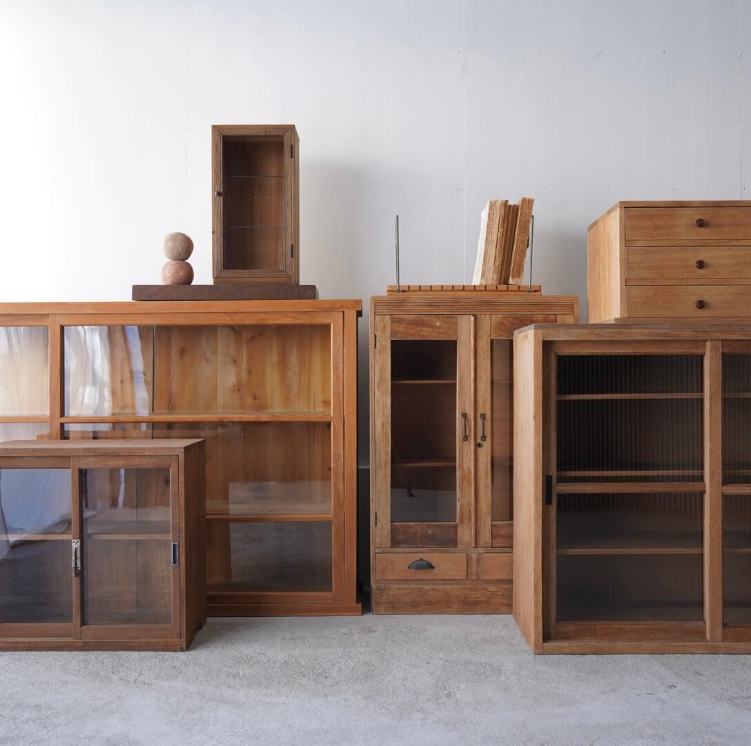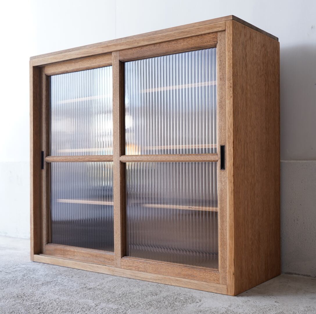 温かみのある経年変化ときらきらと光を反射するモールガラスの引き戸が美しいキャビネット。