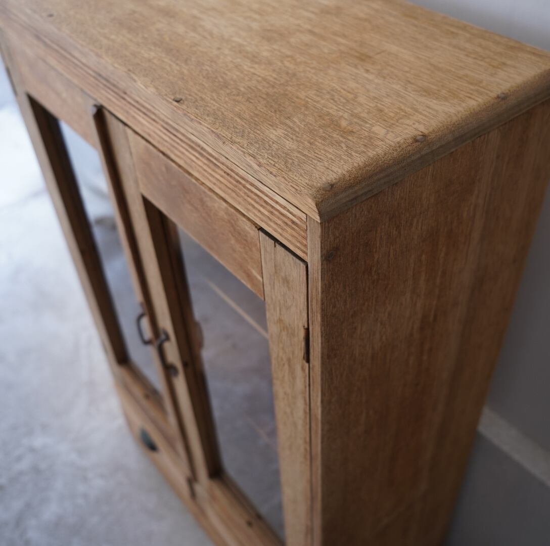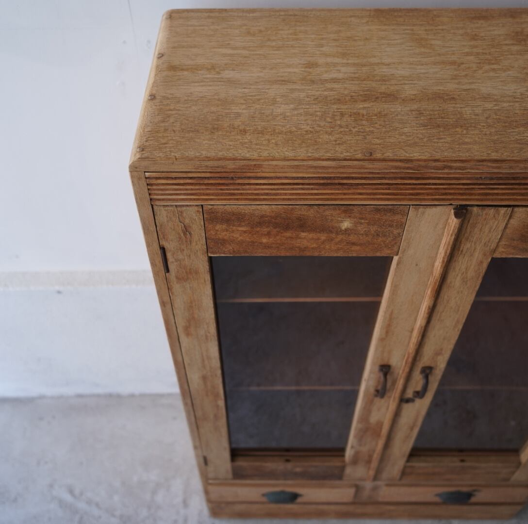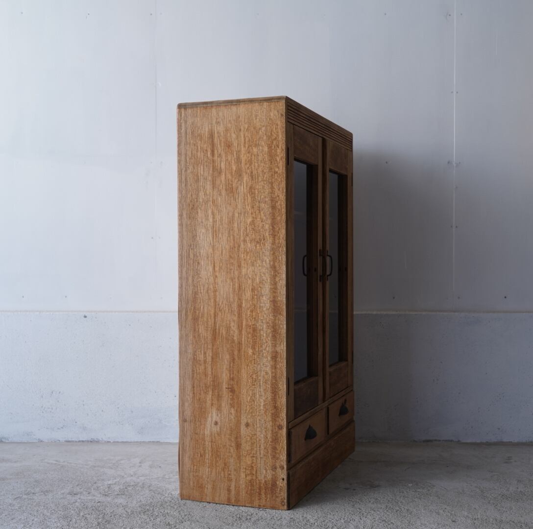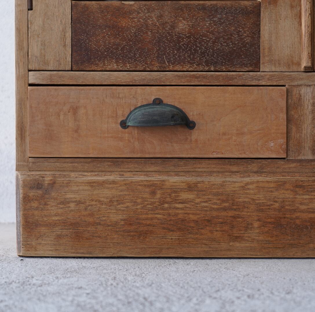 温かみのある経年変化とおでこ部分に入った美しい装飾が魅力的な古いキャビネット。