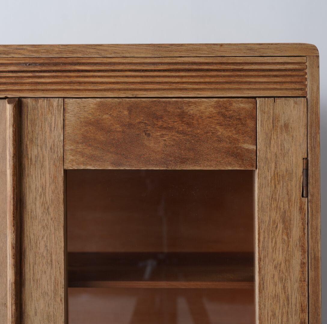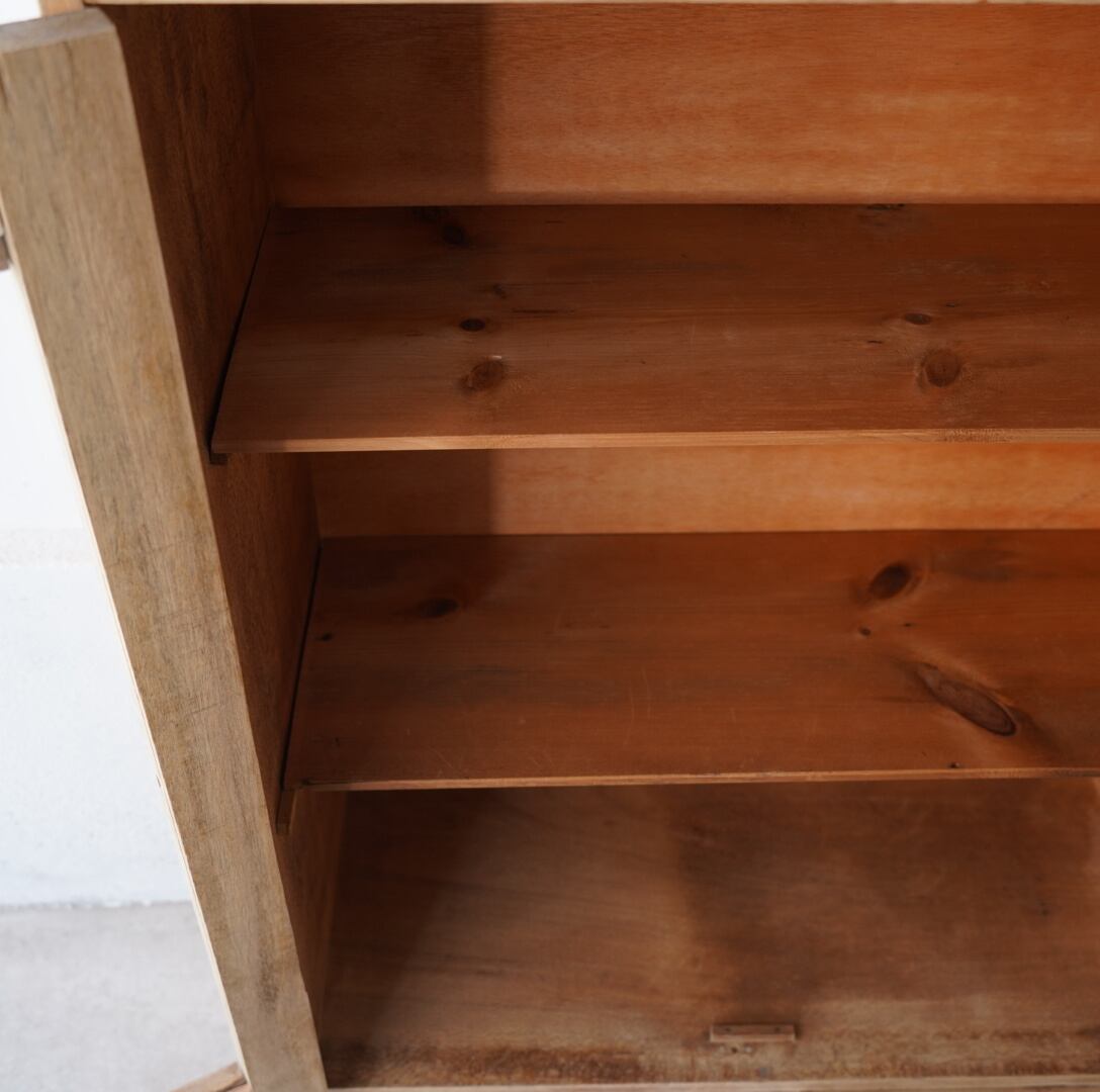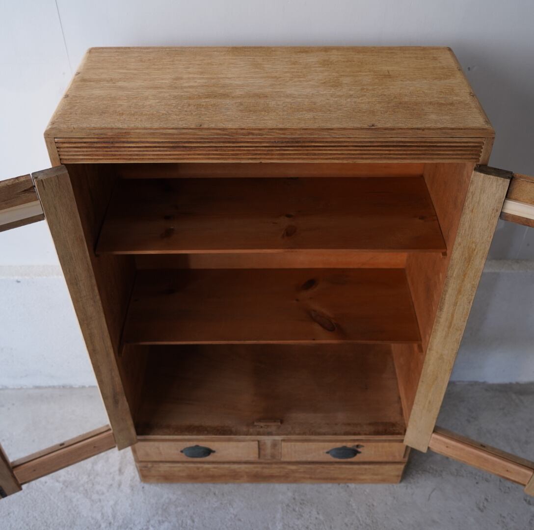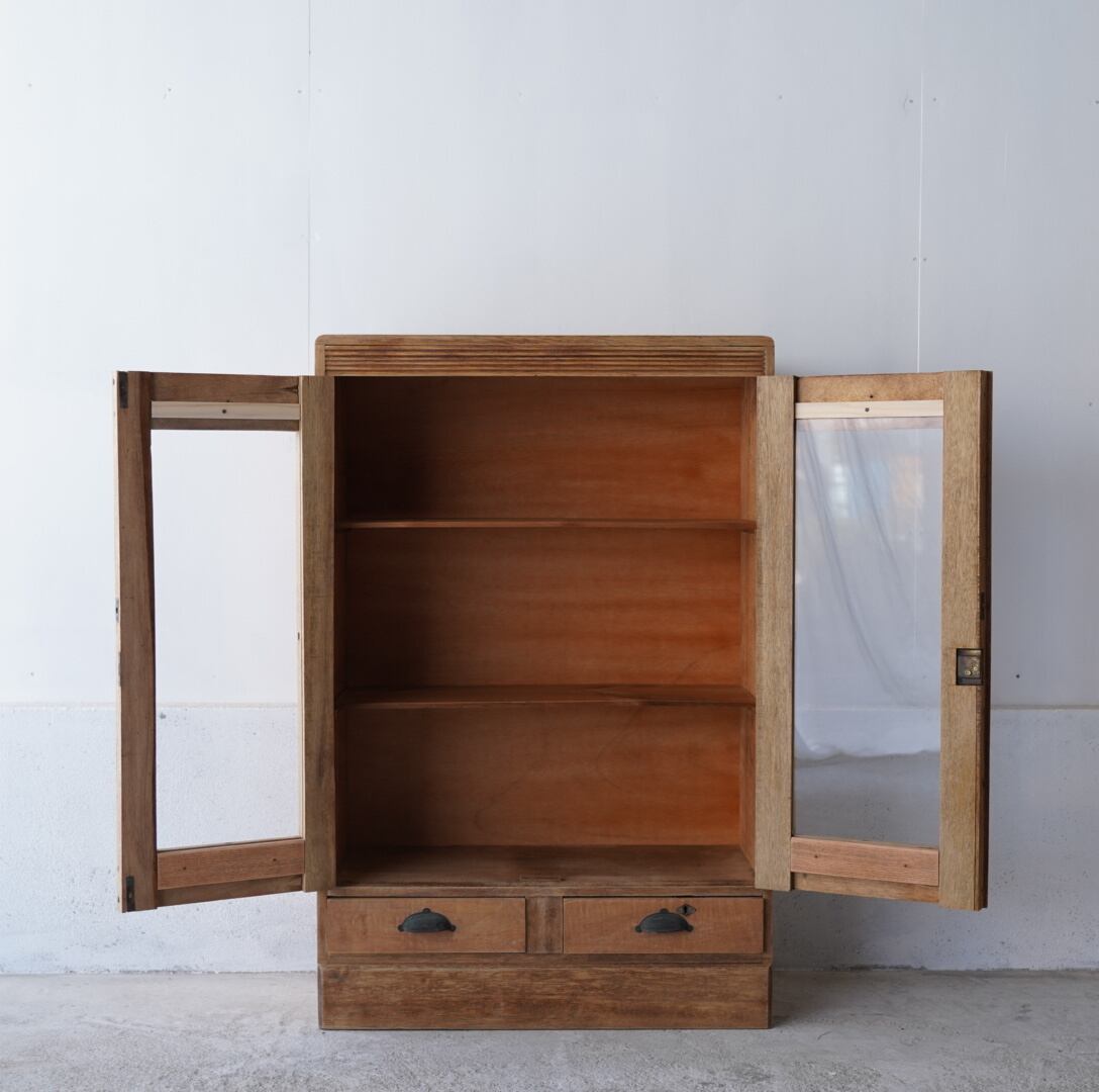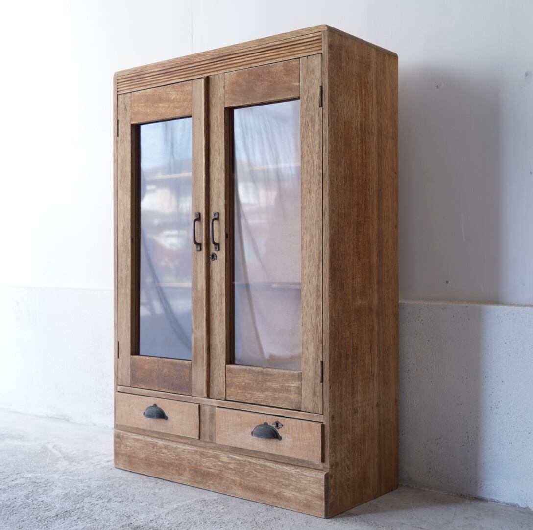 温かみのある経年変化とおでこ部分に入った美しい装飾が魅力的な古いキャビネット。