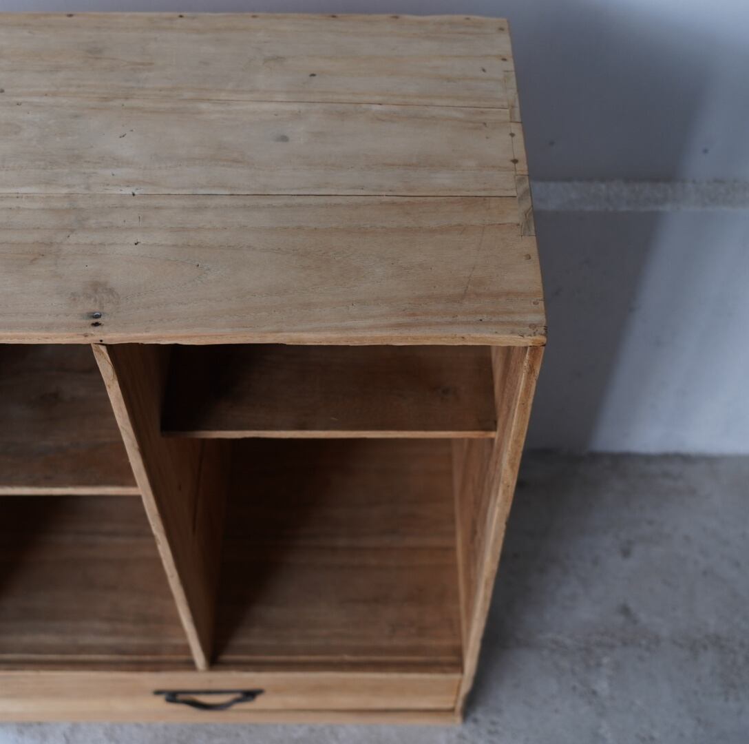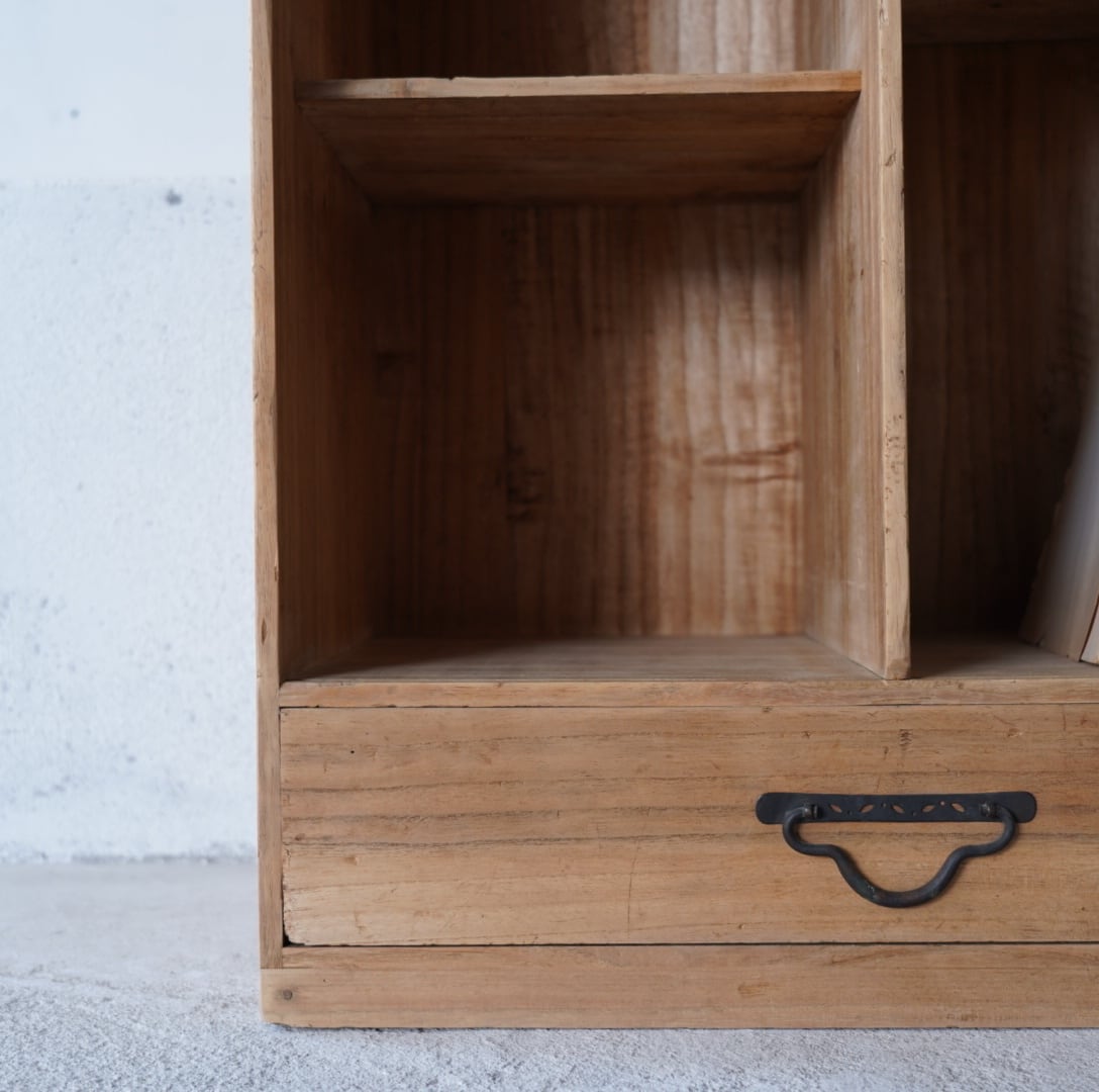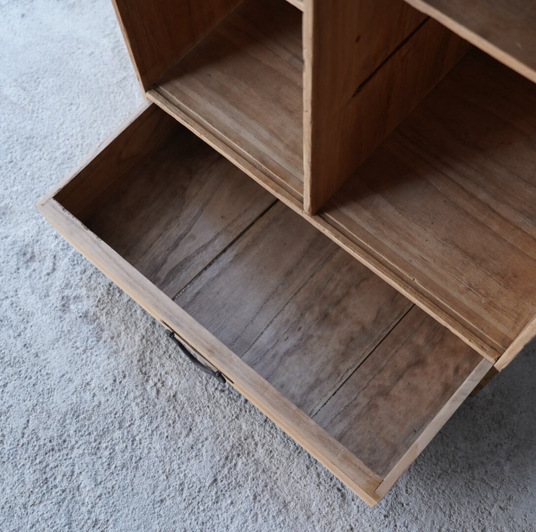 無垢材の温かみのある木味と金属取手の引き出しが魅力的な古い木製棚。