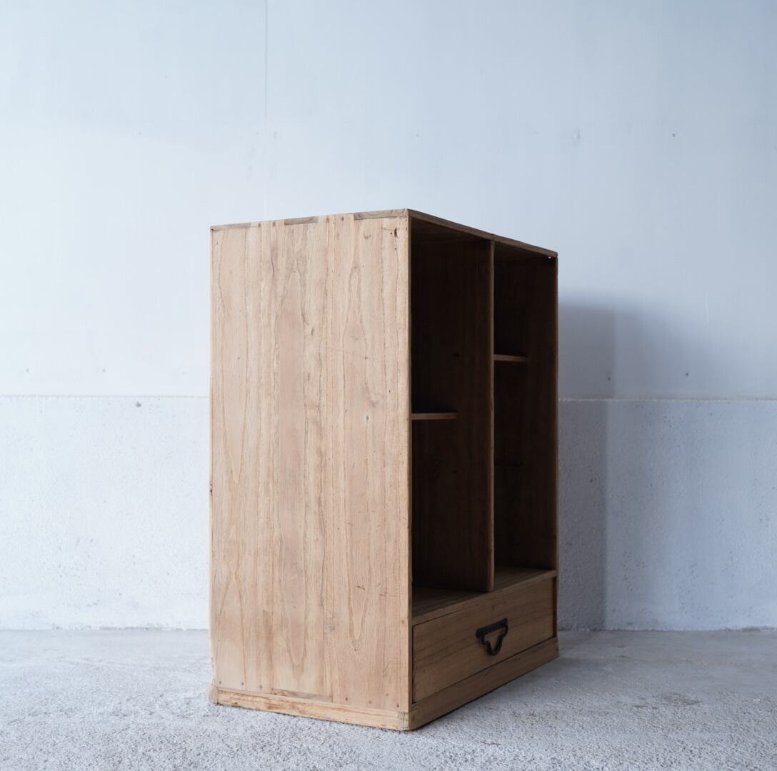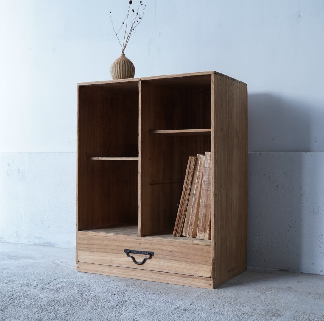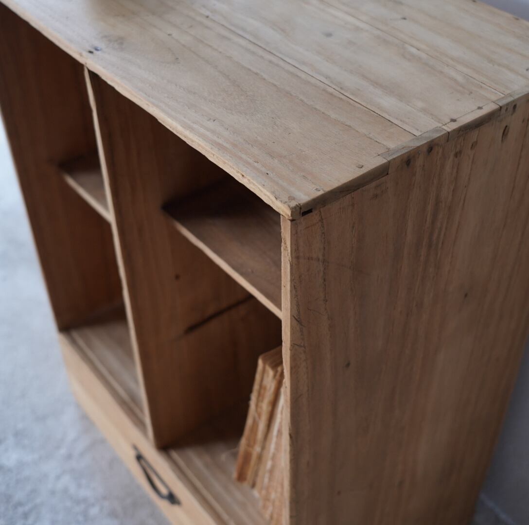 無垢材の温かみのある木味と金属取手の引き出しが魅力的な古い木製棚。