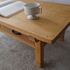 無垢材のナチュラルな木味と真鍮取手の引き出しが美しいコーヒーテーブル。