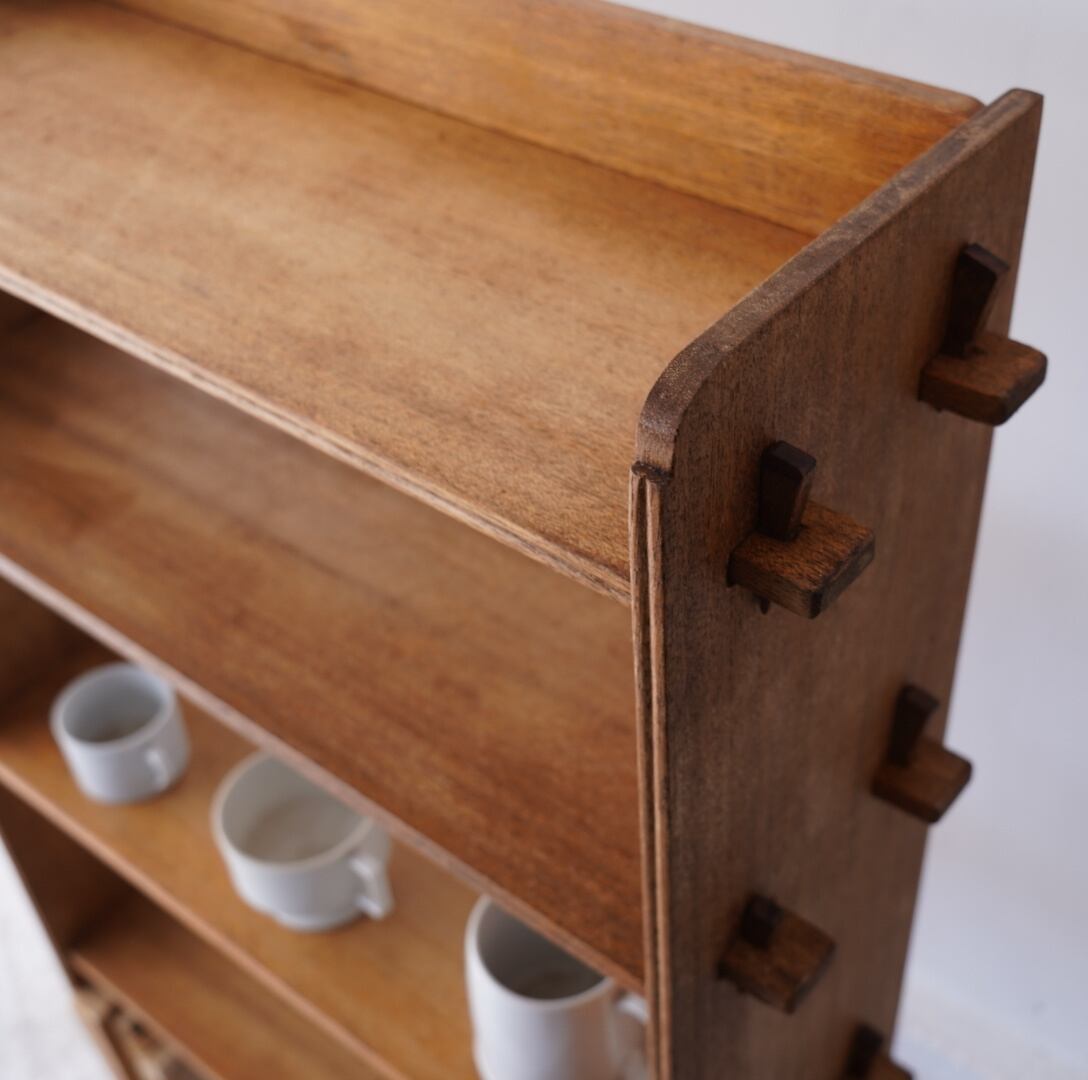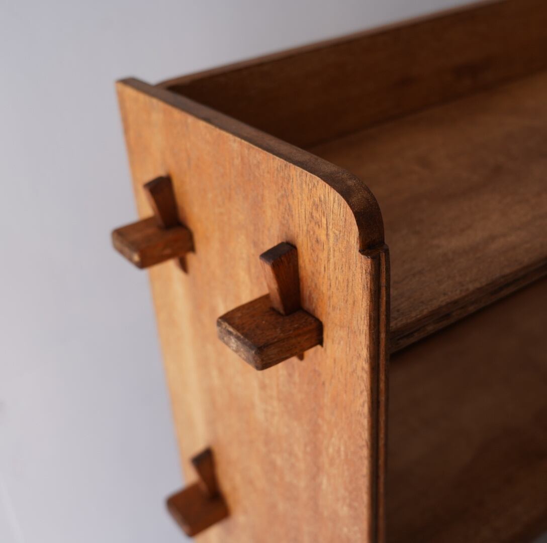 20本の楔が棚をしっかりと固定する造りになっており、機能性と美しさを兼ね備えます。