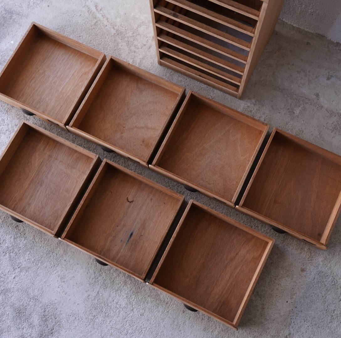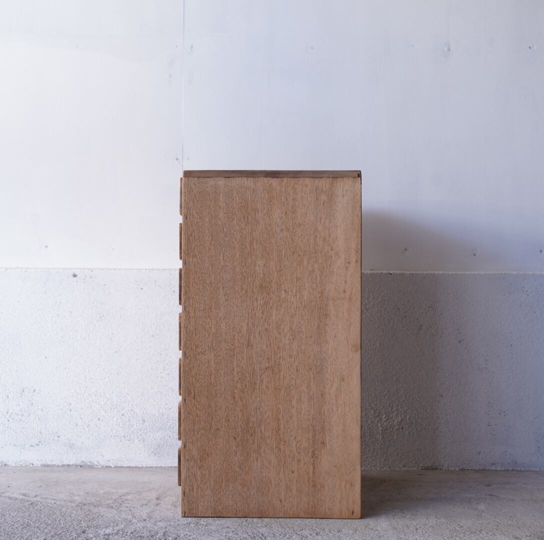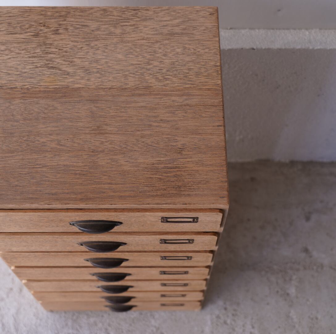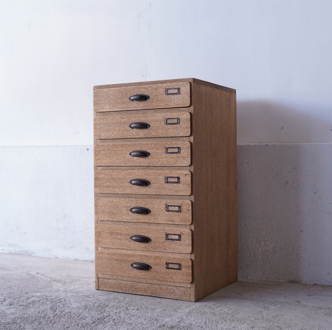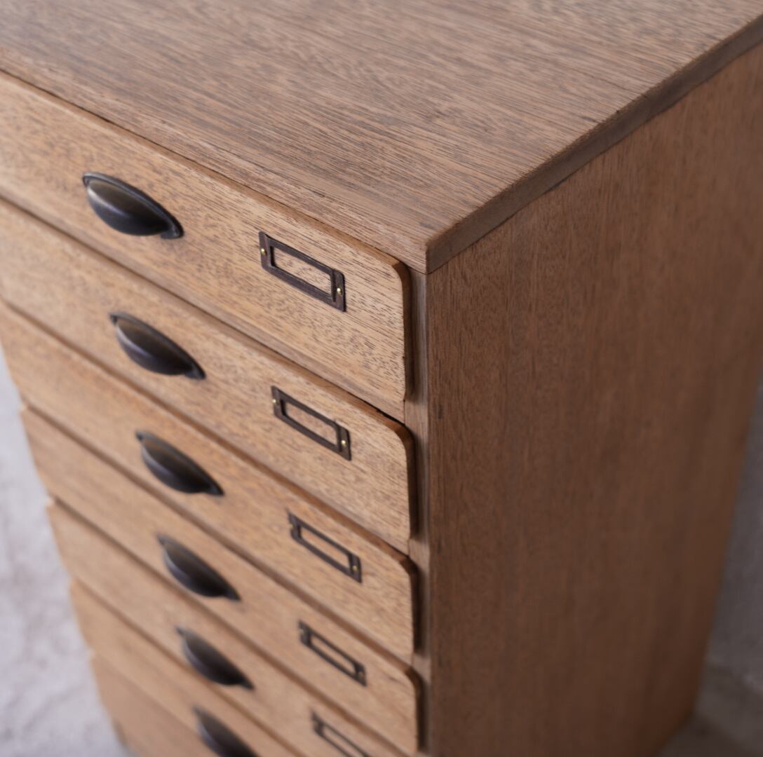ナチュラルな木味と並んだ金属の取手とネームプレートが可愛らしい7杯の引き出し。