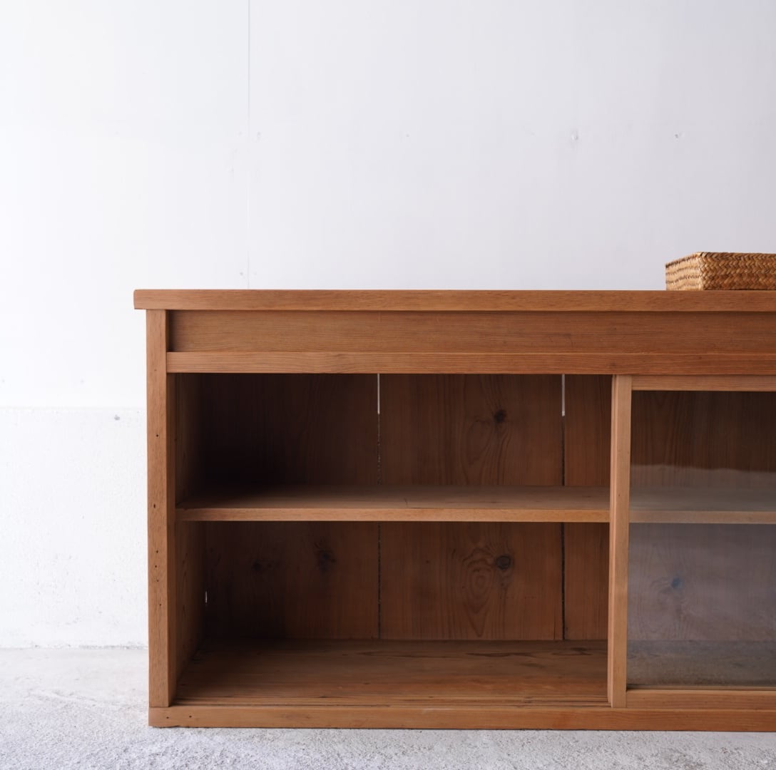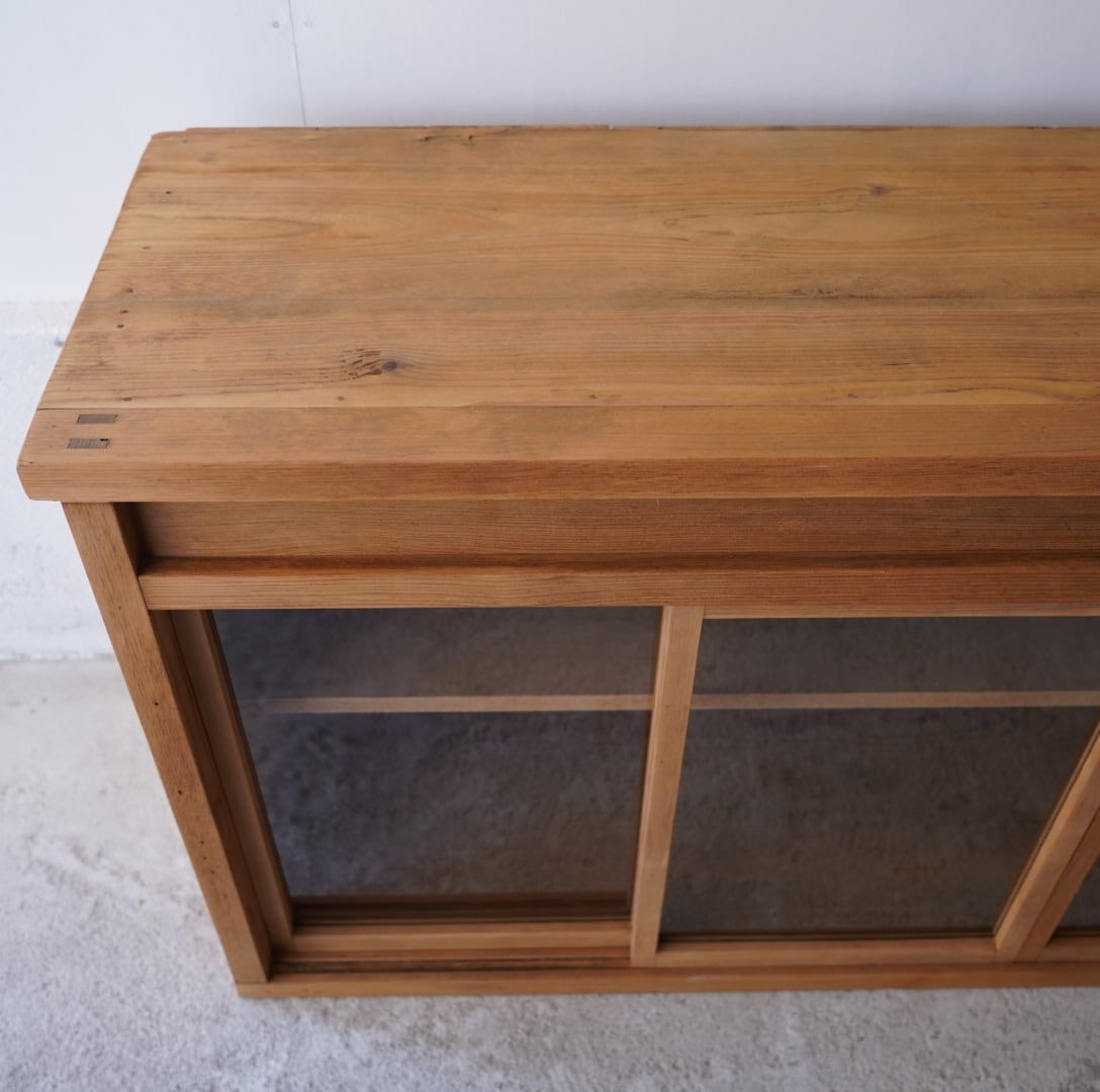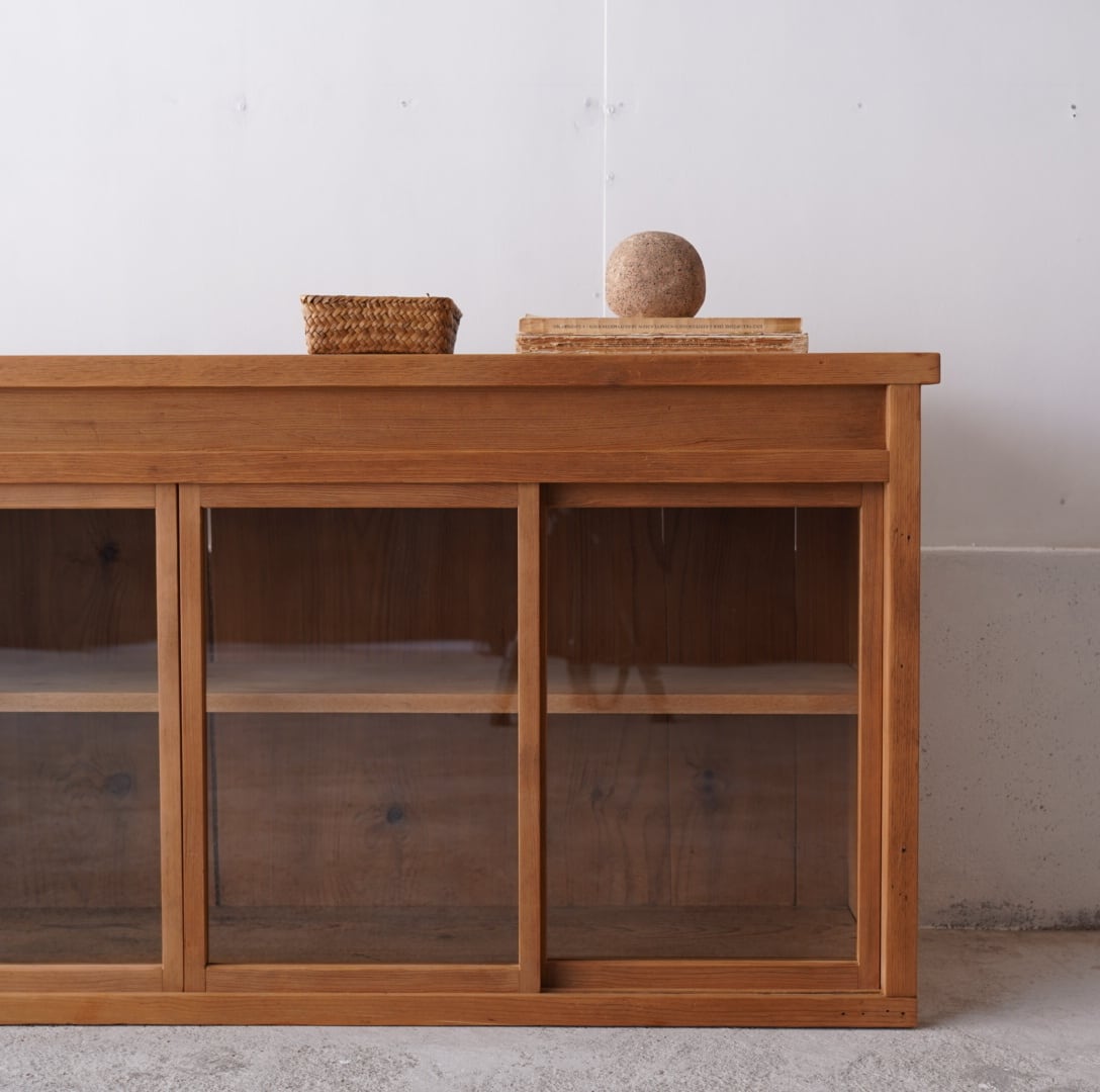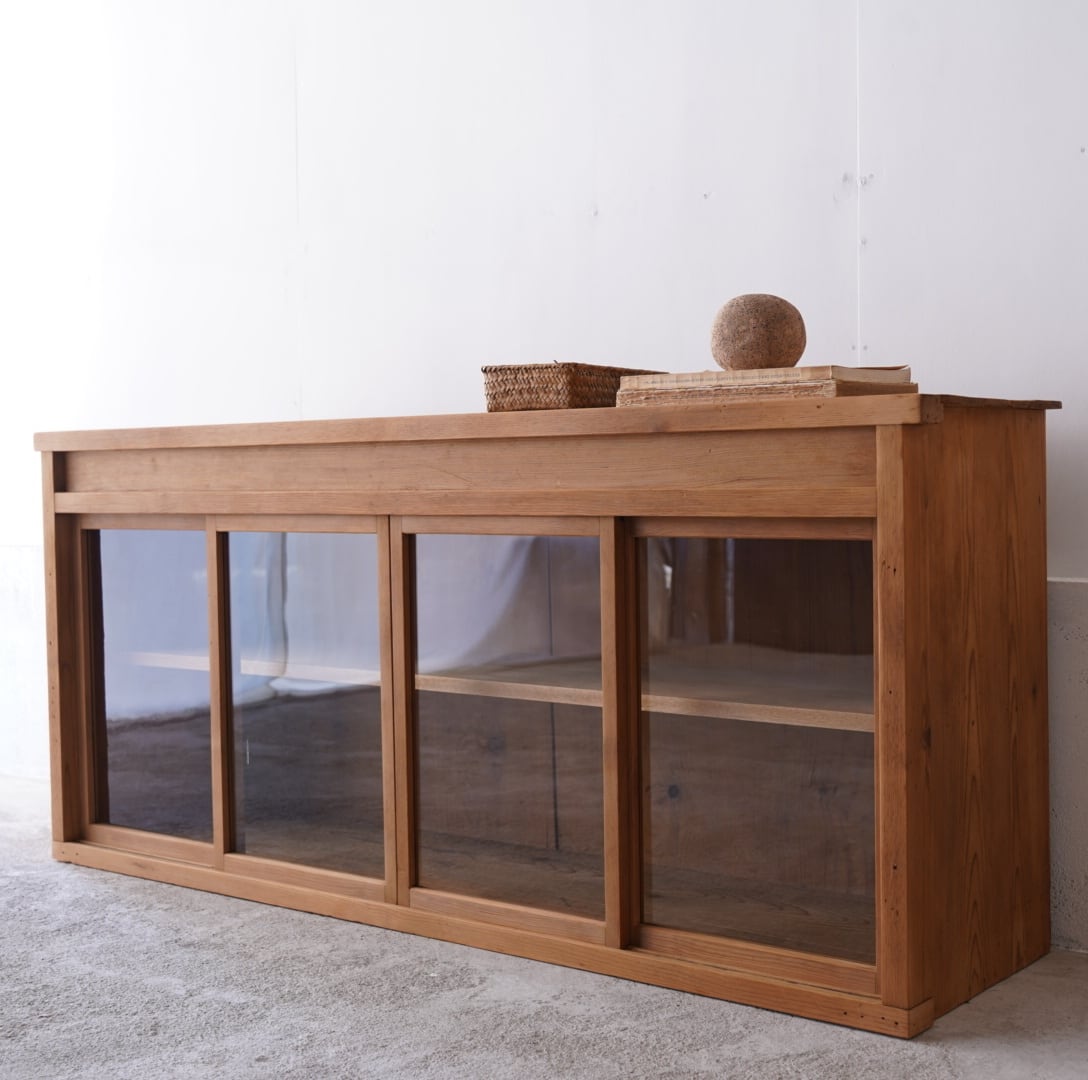 無垢材の素朴な風合いとすっきりとした4枚のガラス引き戸が美しいキャビネット。