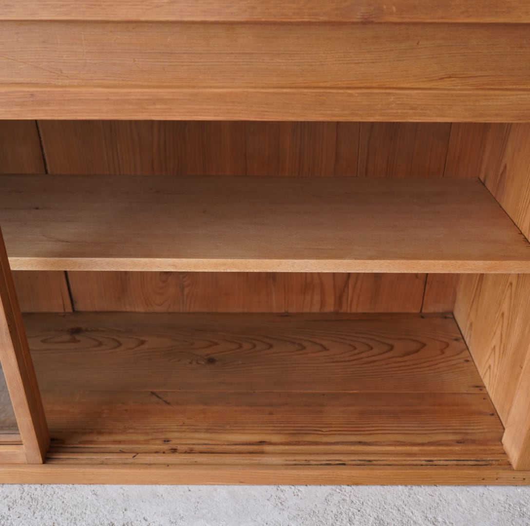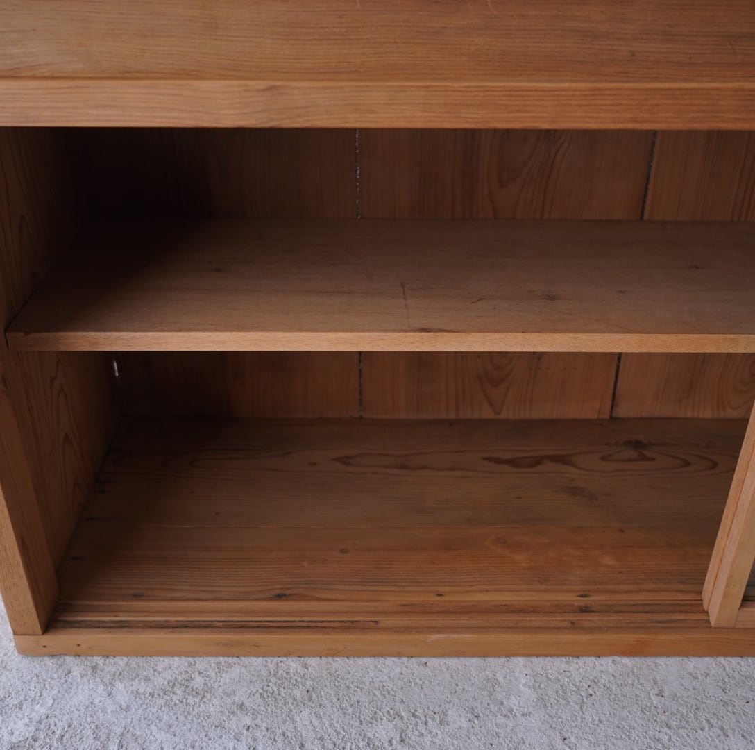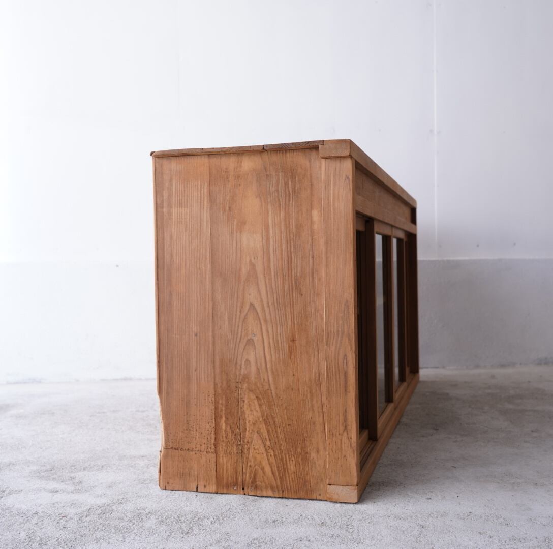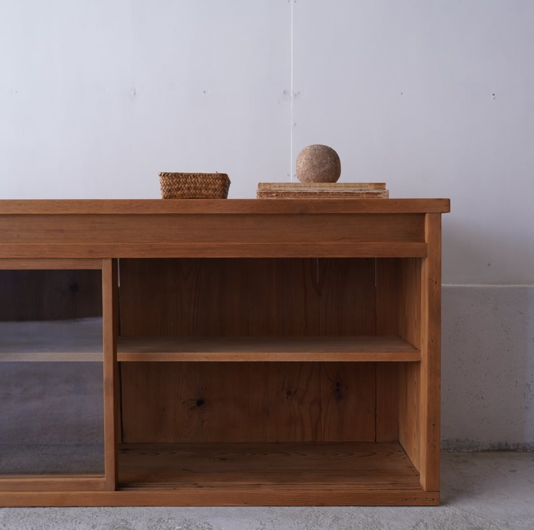 無垢材の素朴な風合いとすっきりとした4枚のガラス引き戸が美しいキャビネット。