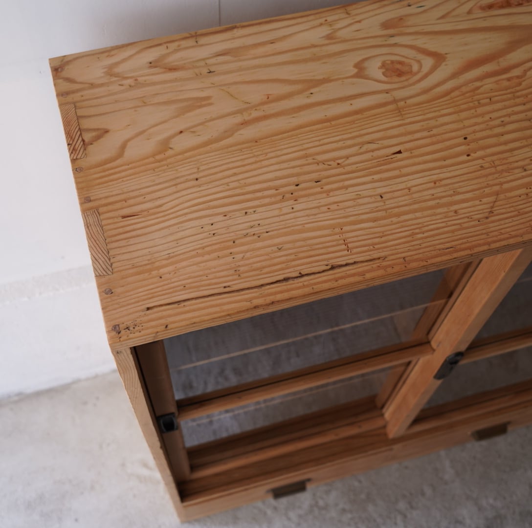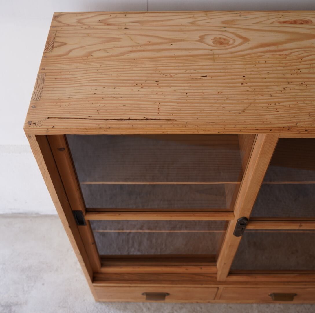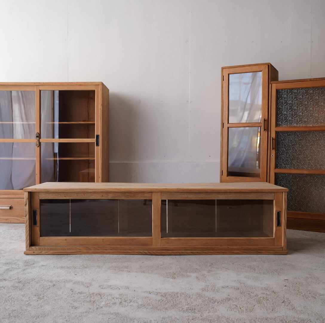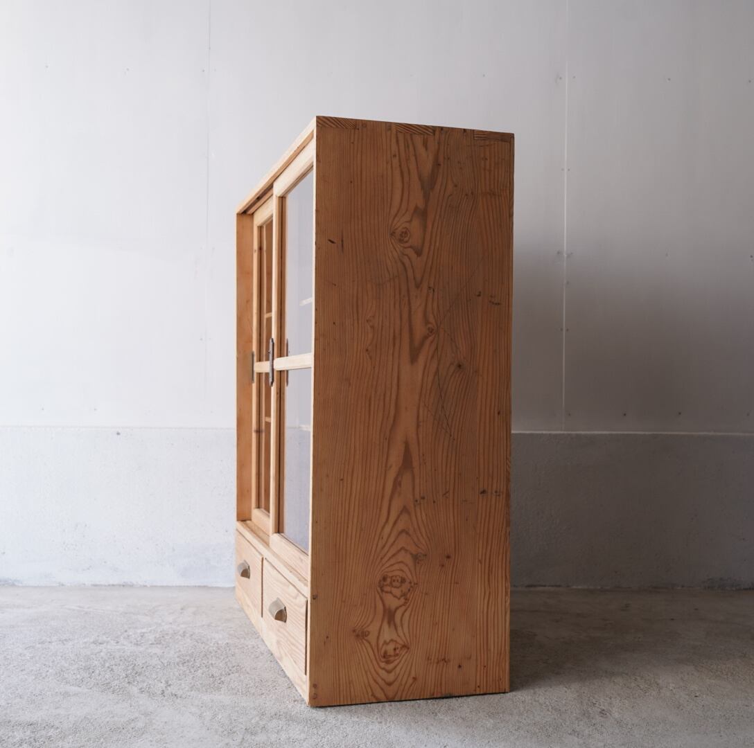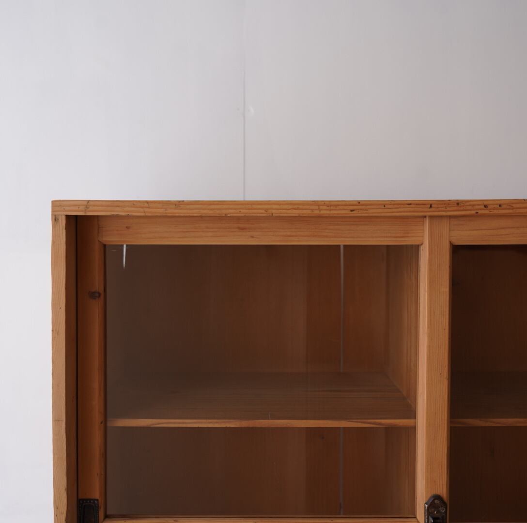 古い無垢材の素朴な風合いと大きな格子ガラスの引き戸が美しいキャビネット。